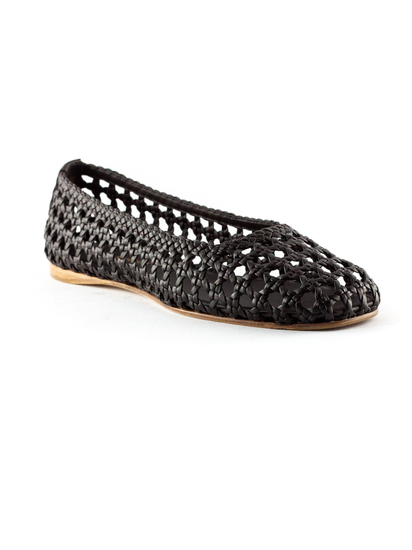Ballerina in pelle intrecciata marrone scuro con punta tonda, suola in pelle con logo, fondo in cuoio