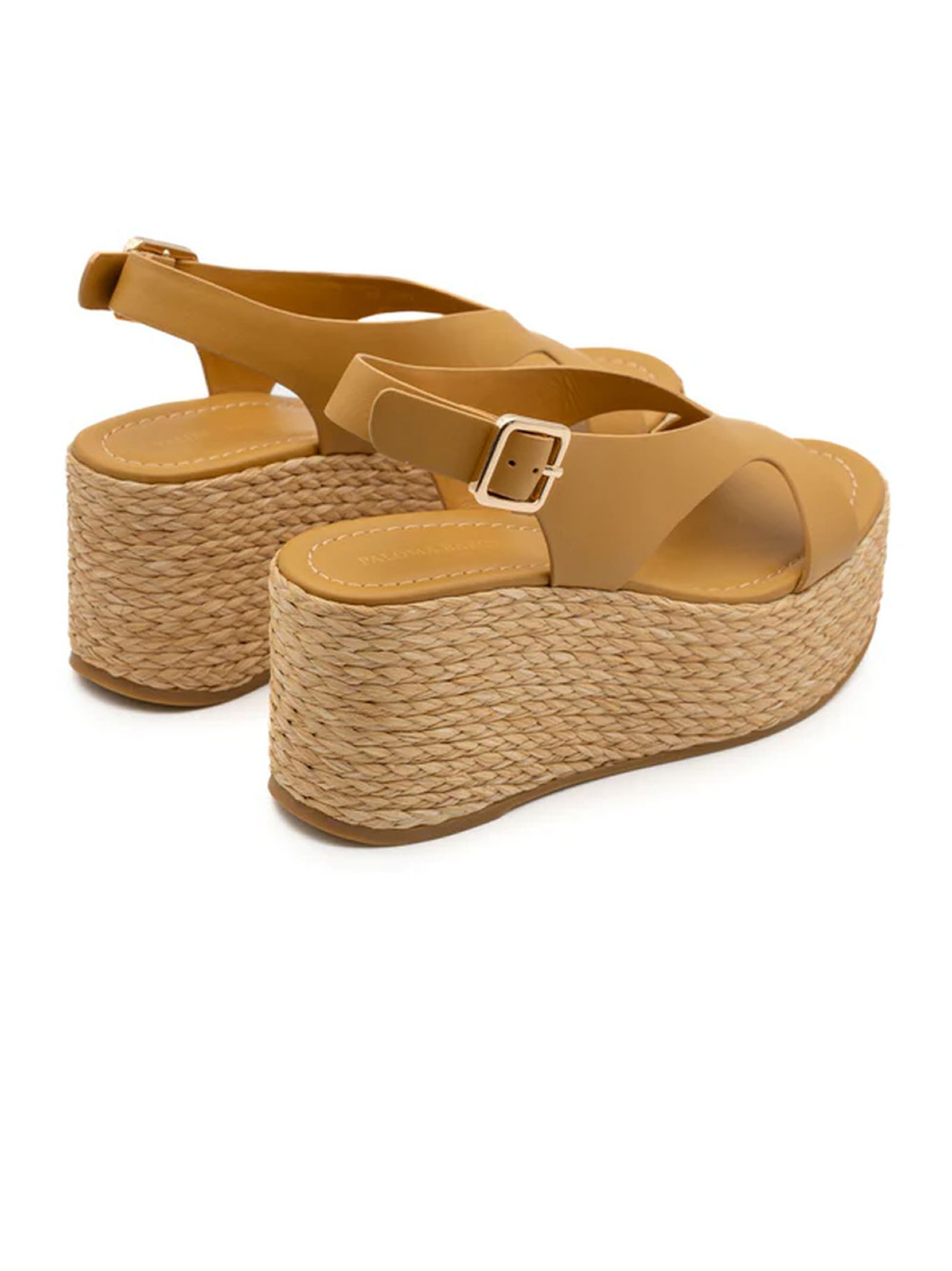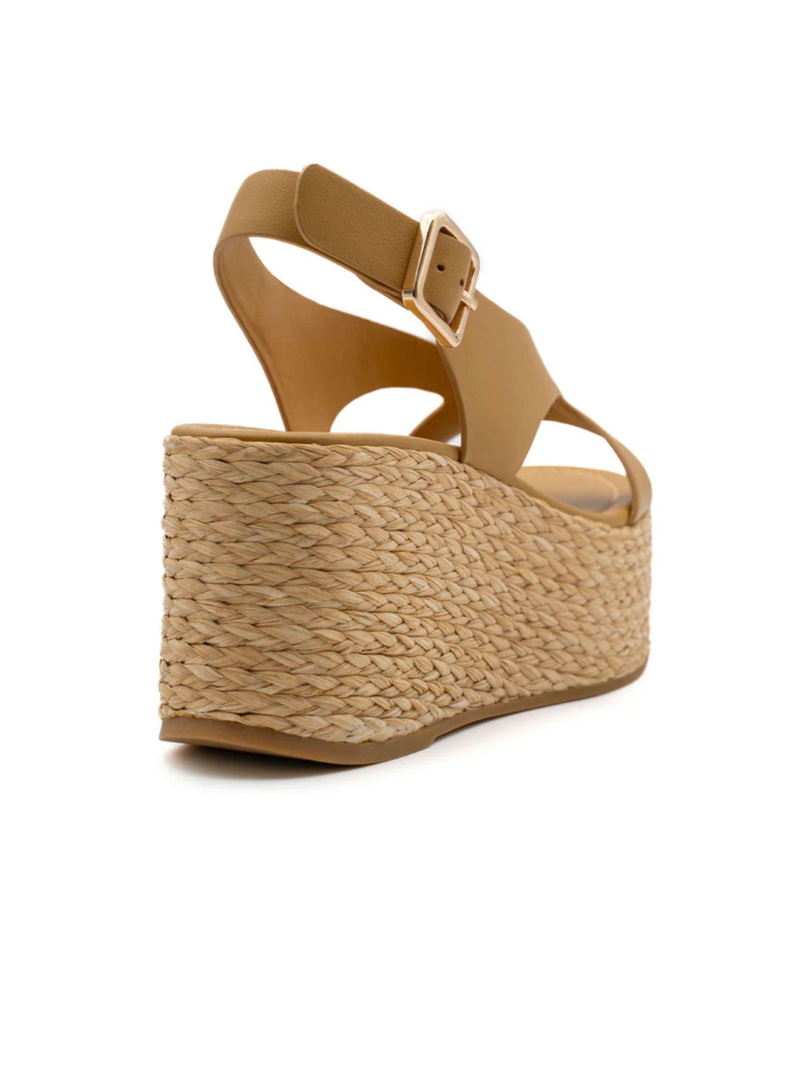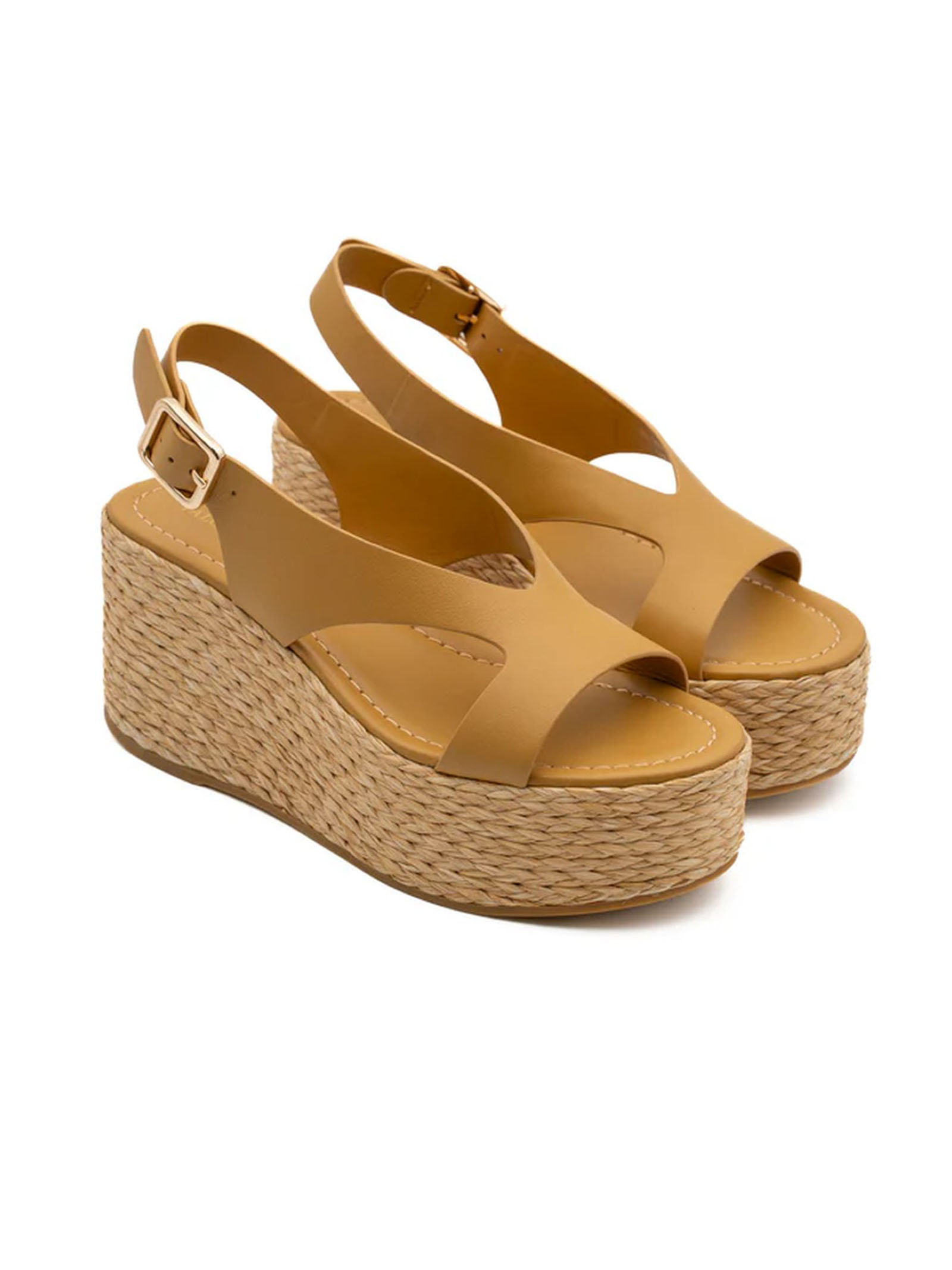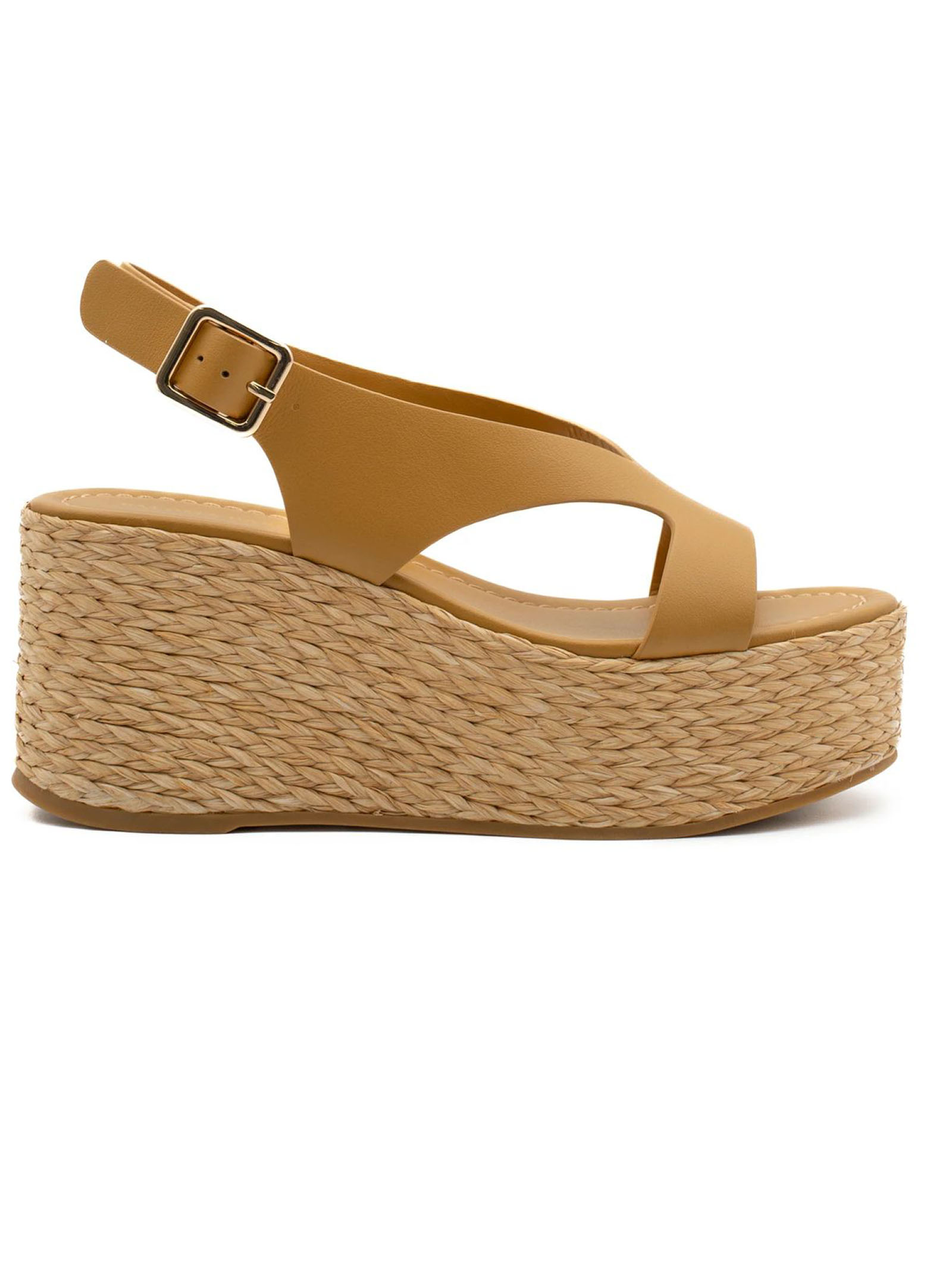 Sandalo con zeppa in pelle ocra, zeppa rivestita in rafia naturale e fibbia metallica, fibbia in metallo color oro, altezza platform frontale 4 cm, altezza platform sul retro 8 cm