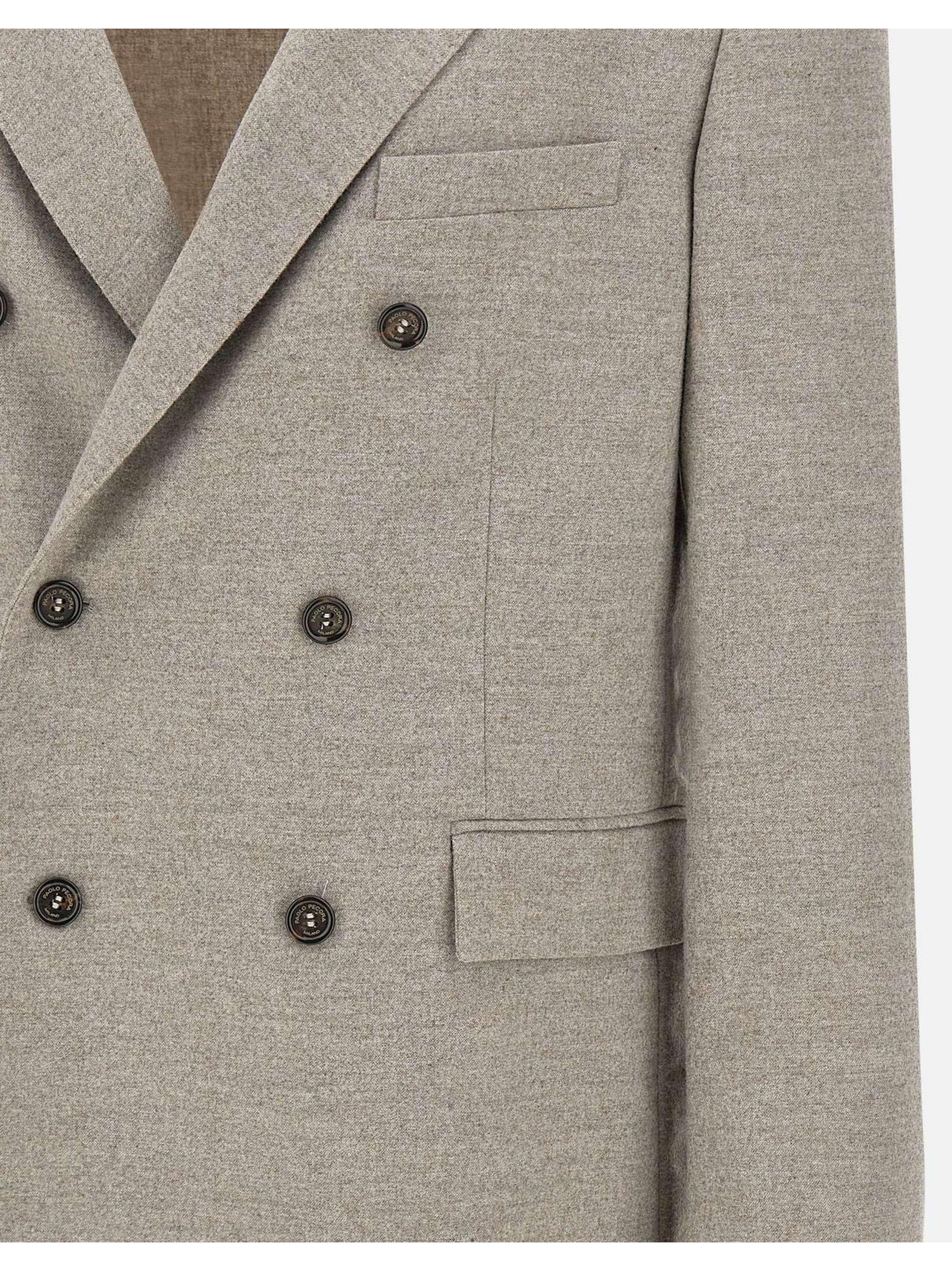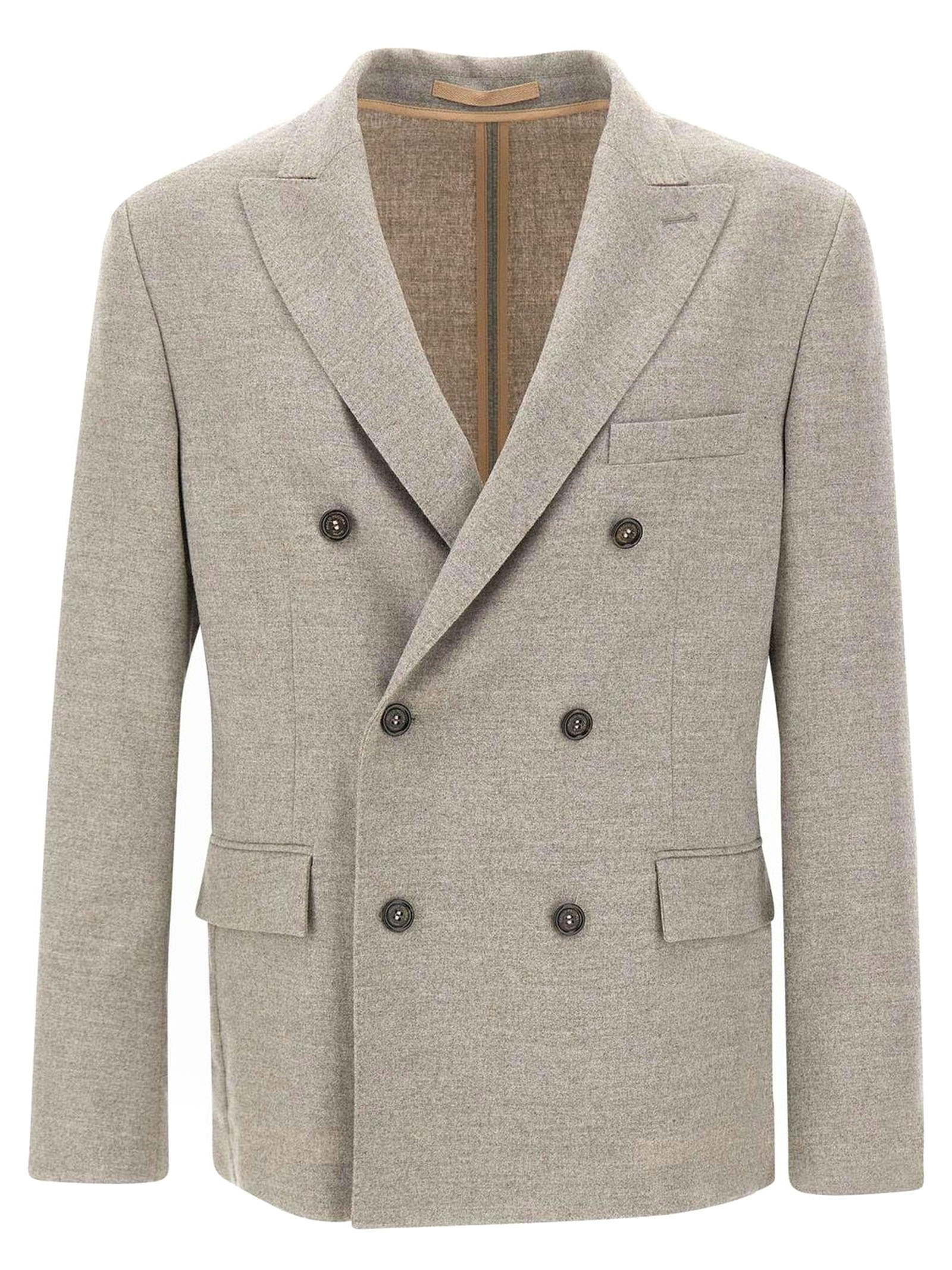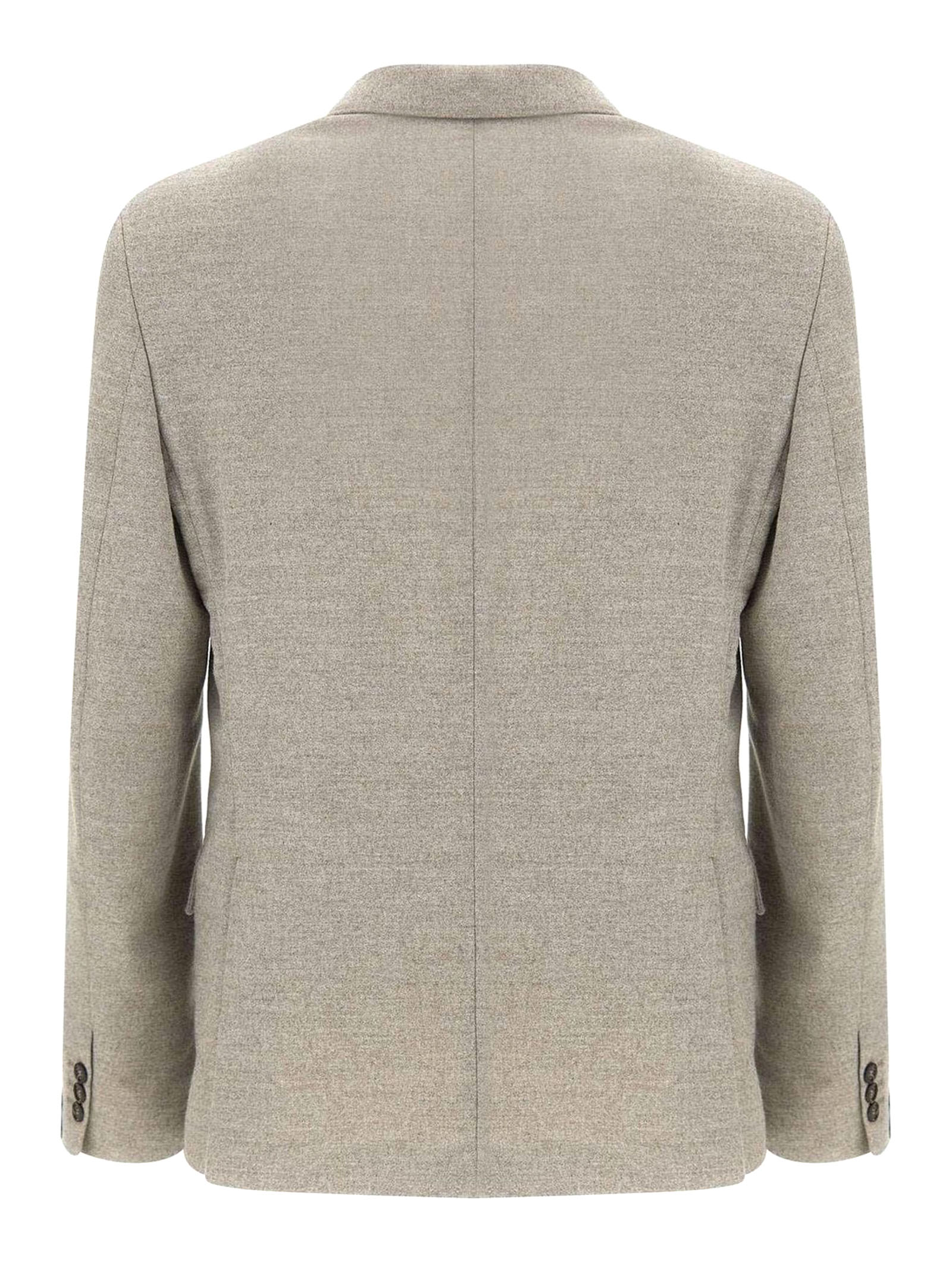 Blazer in misto lana e viscosa grigio chiaro, chiusura doppiopetto con bottoni a contrasto logati, rever a lancia, tasche anteriori con pattina, taschino per pochette, spacchi laterali sul retro, slim fit
