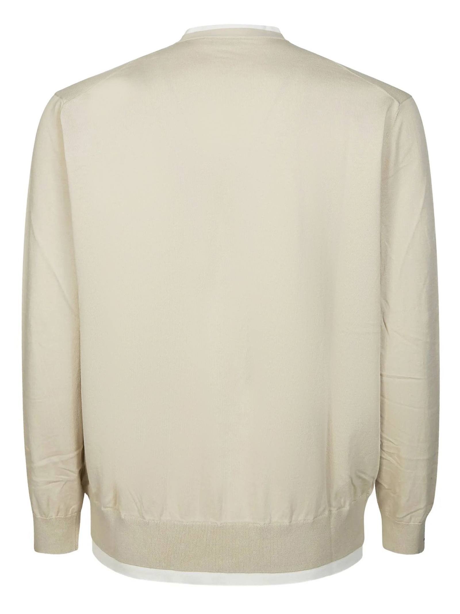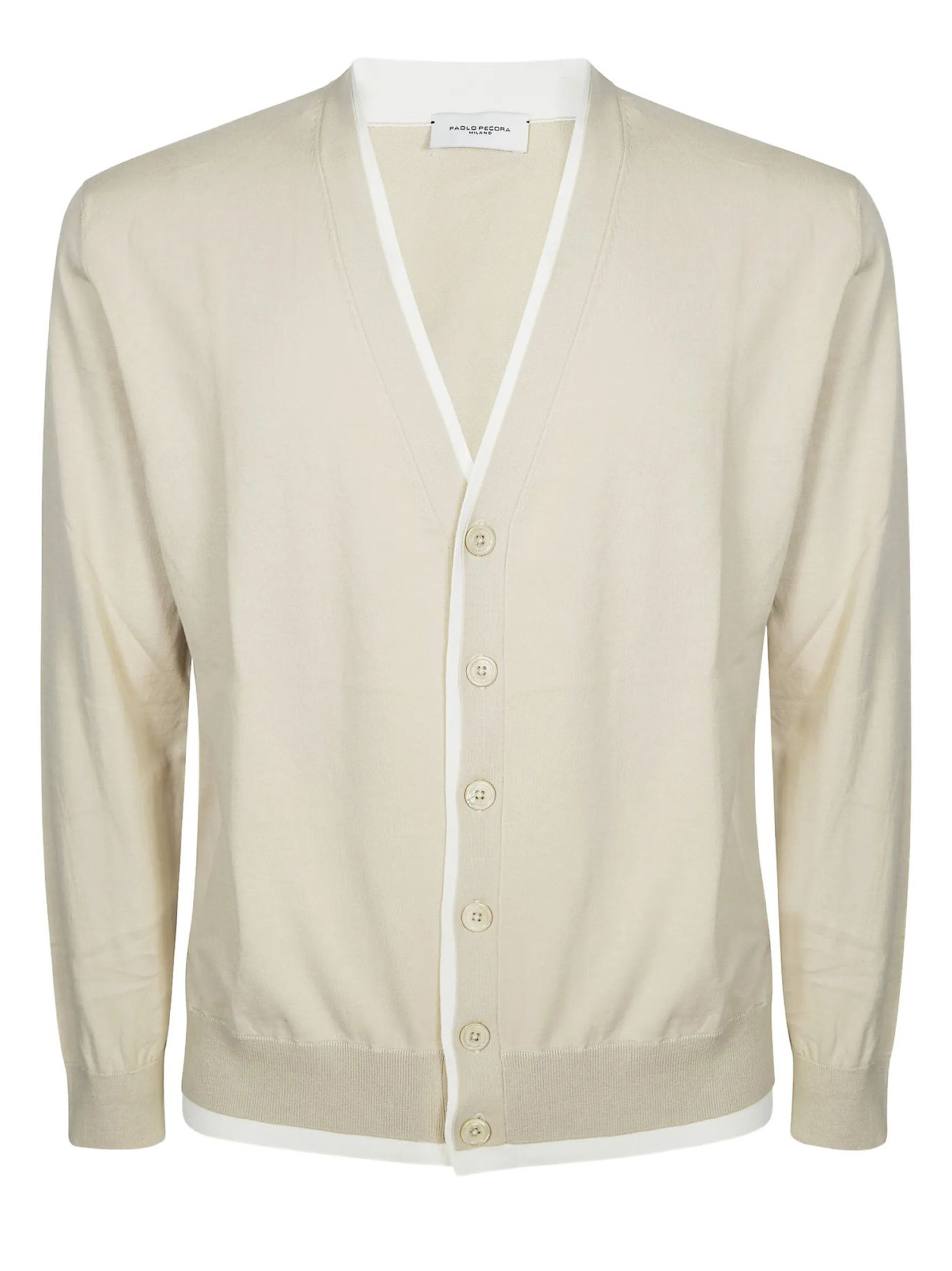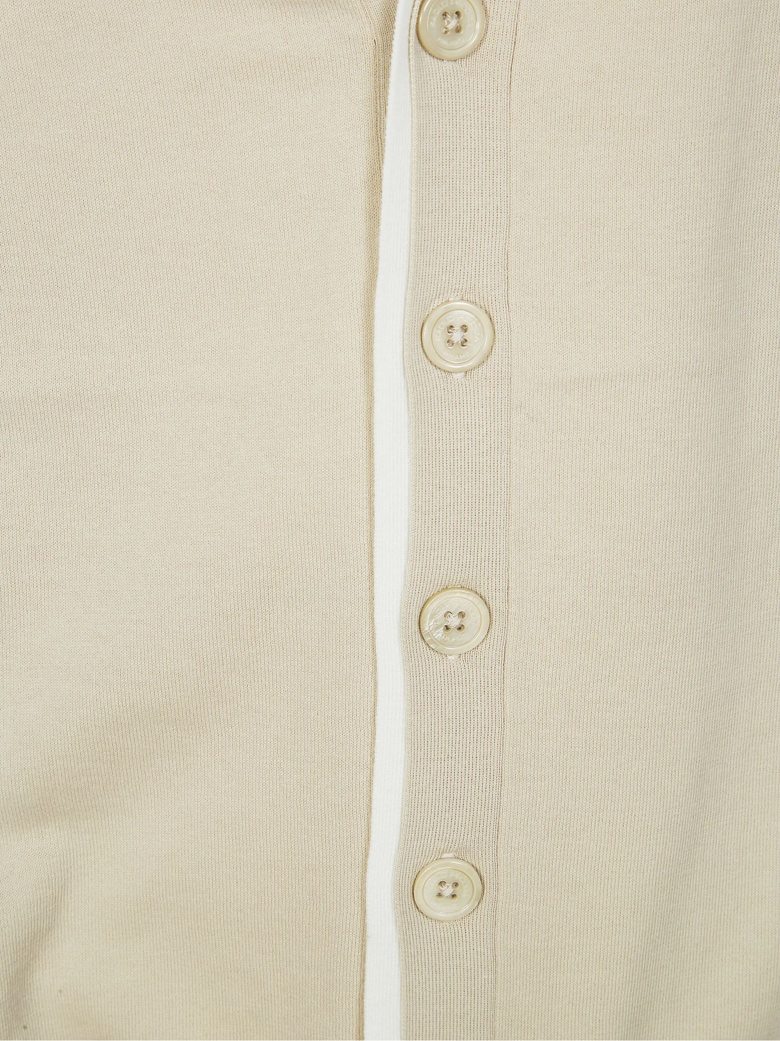 Cardigan in cotone beige con scollo a V, maniche lunghe, polsini a costine e chiusura frontale con bottoni.
