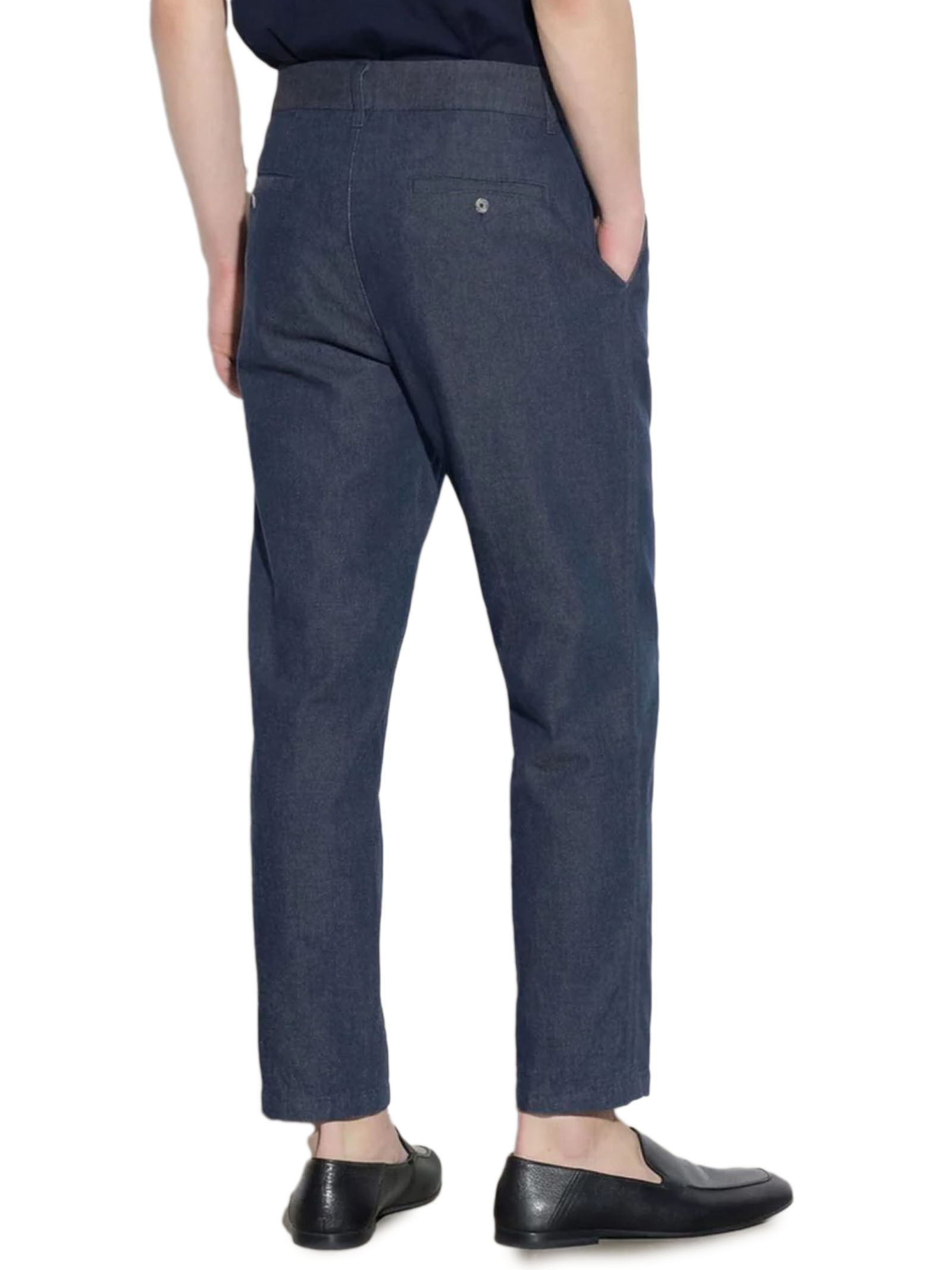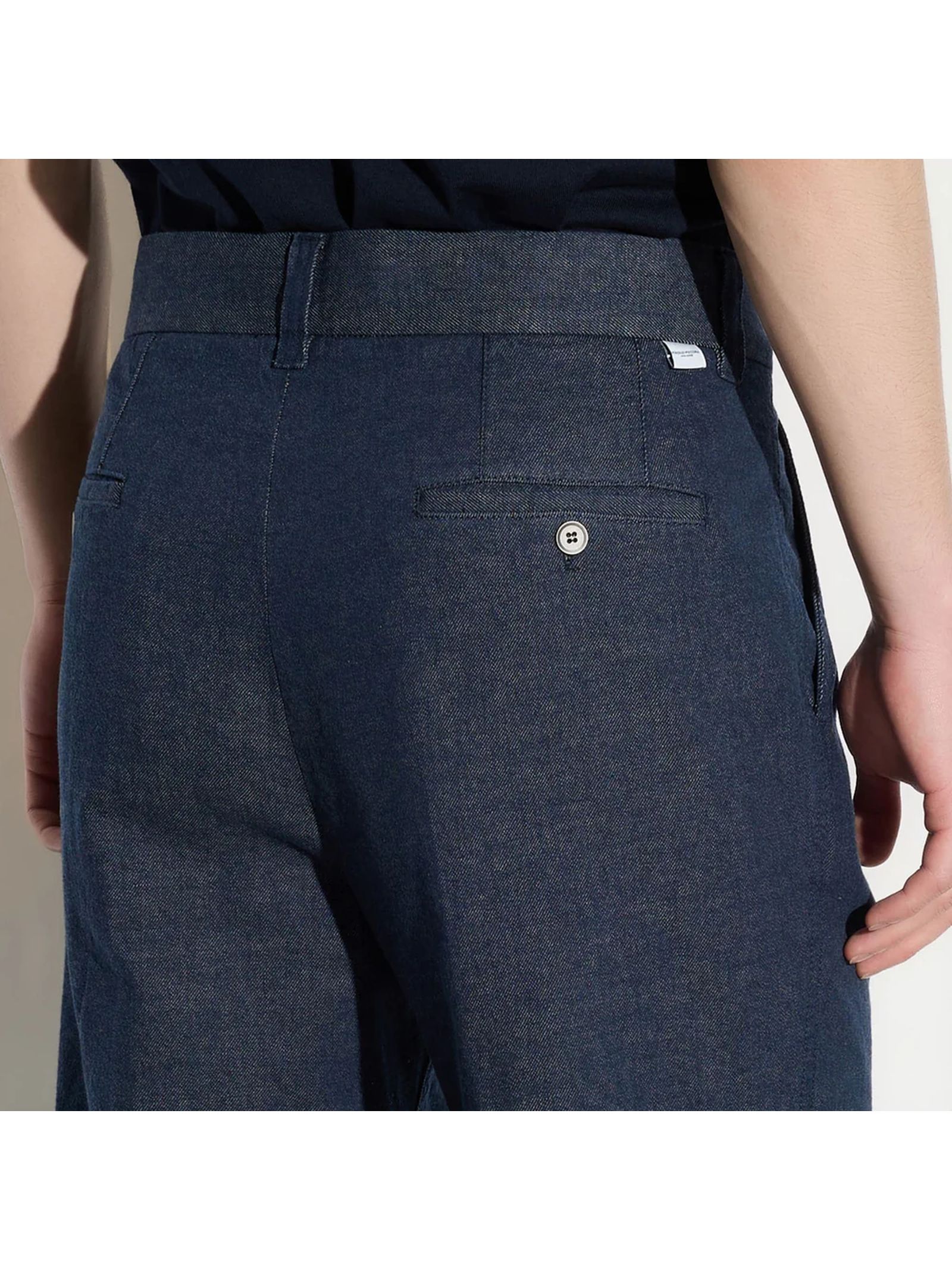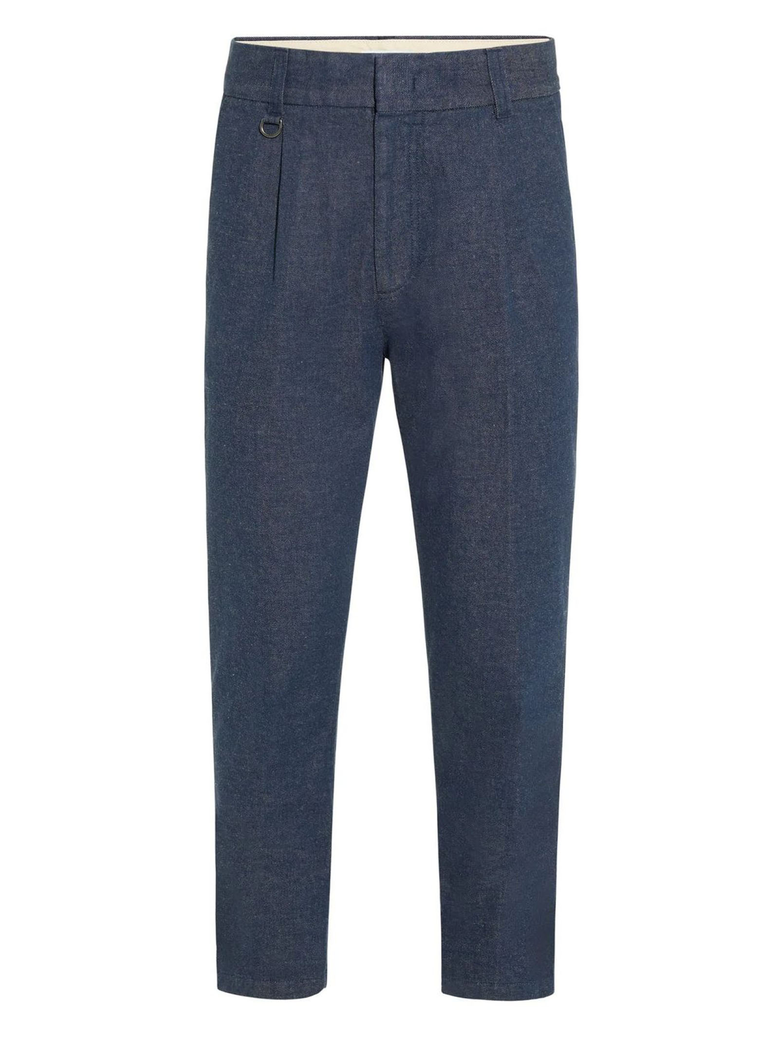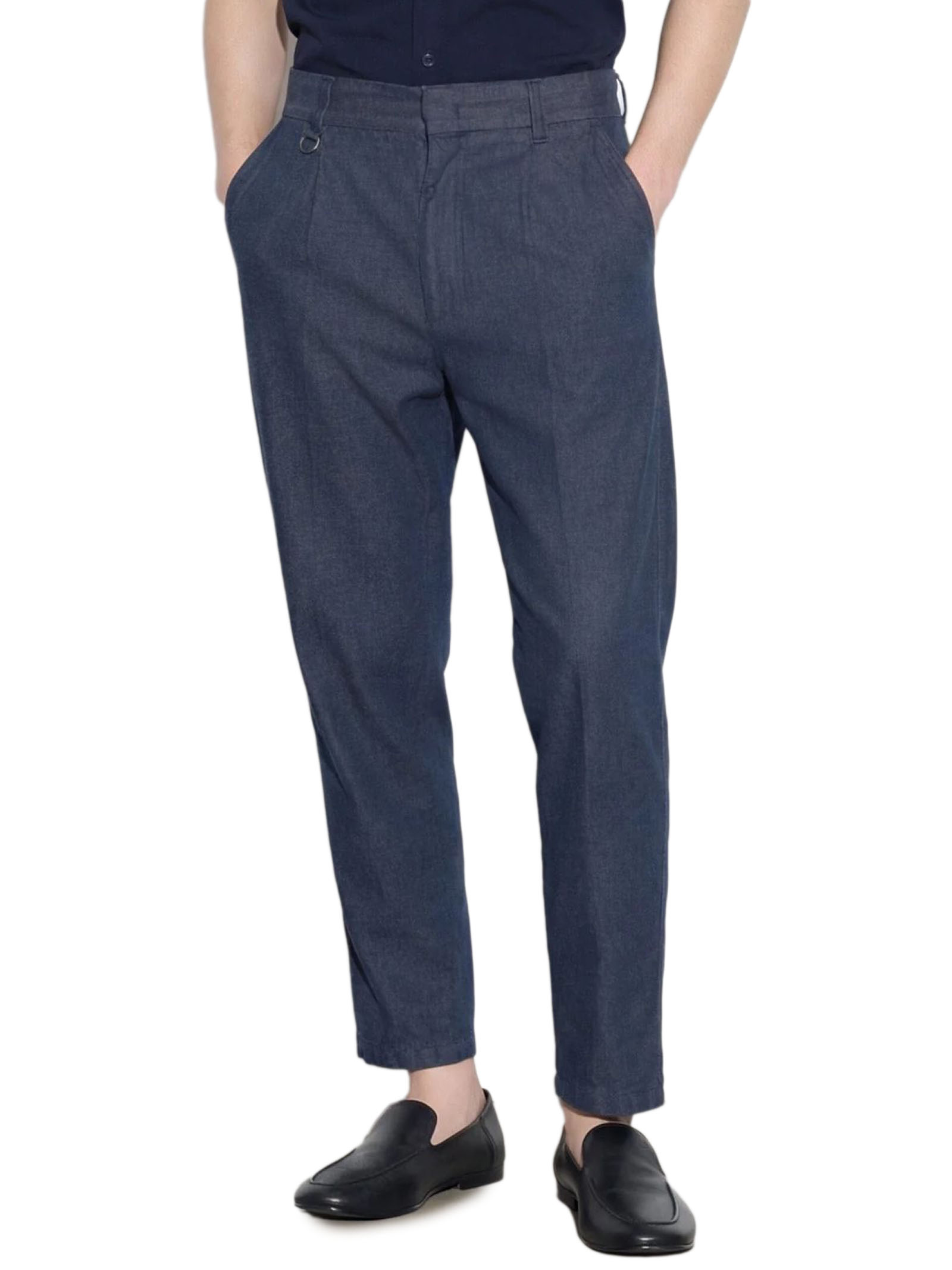 Pantalone Chino Relaxed Fit in Cotone e Lino Blu, Pinces frontali, Tasche laterali oblique, Tasche posteriori a filetto, Dettaglio ad anello metallico in vita, Chiusura con zip e bottone