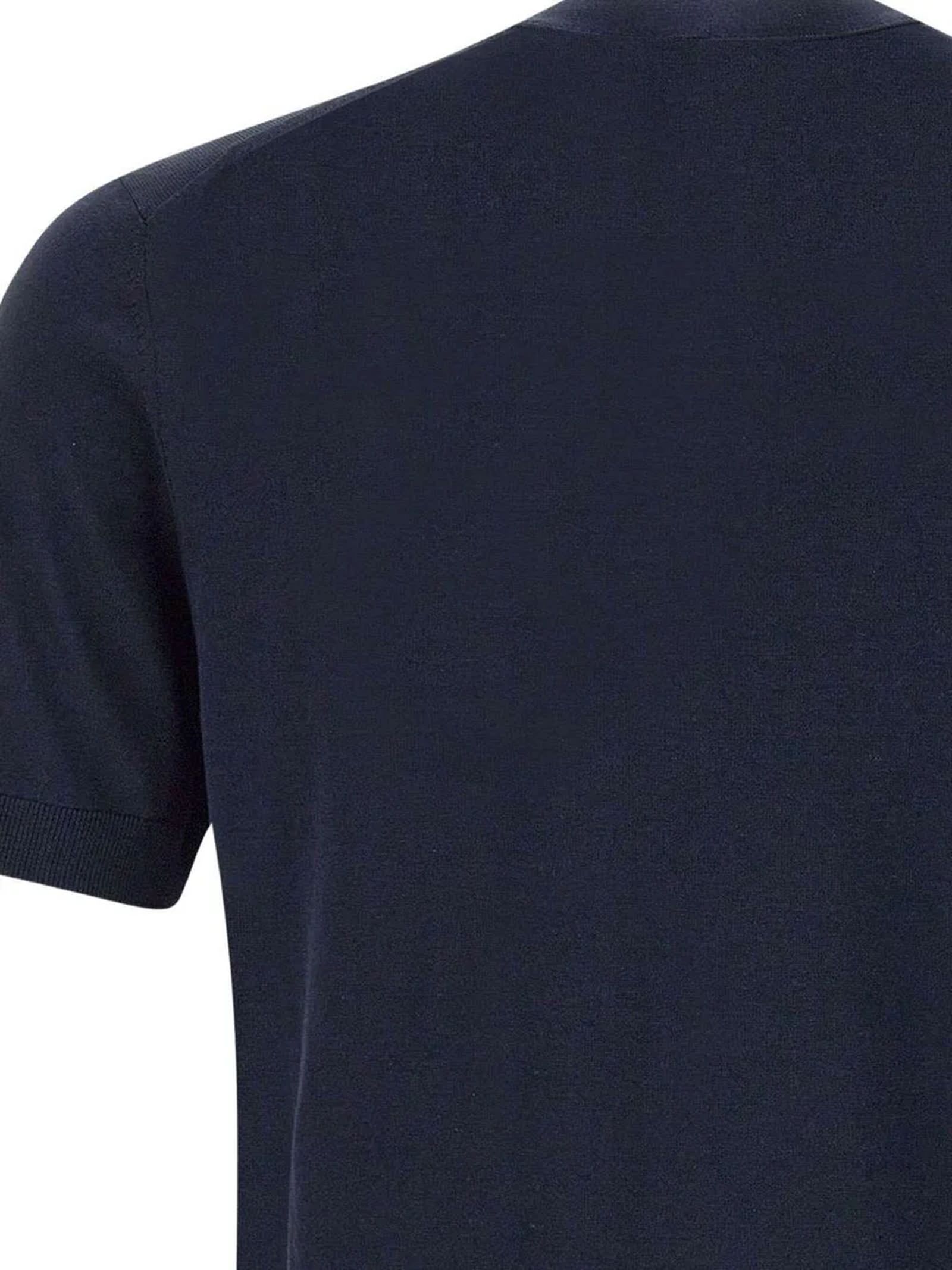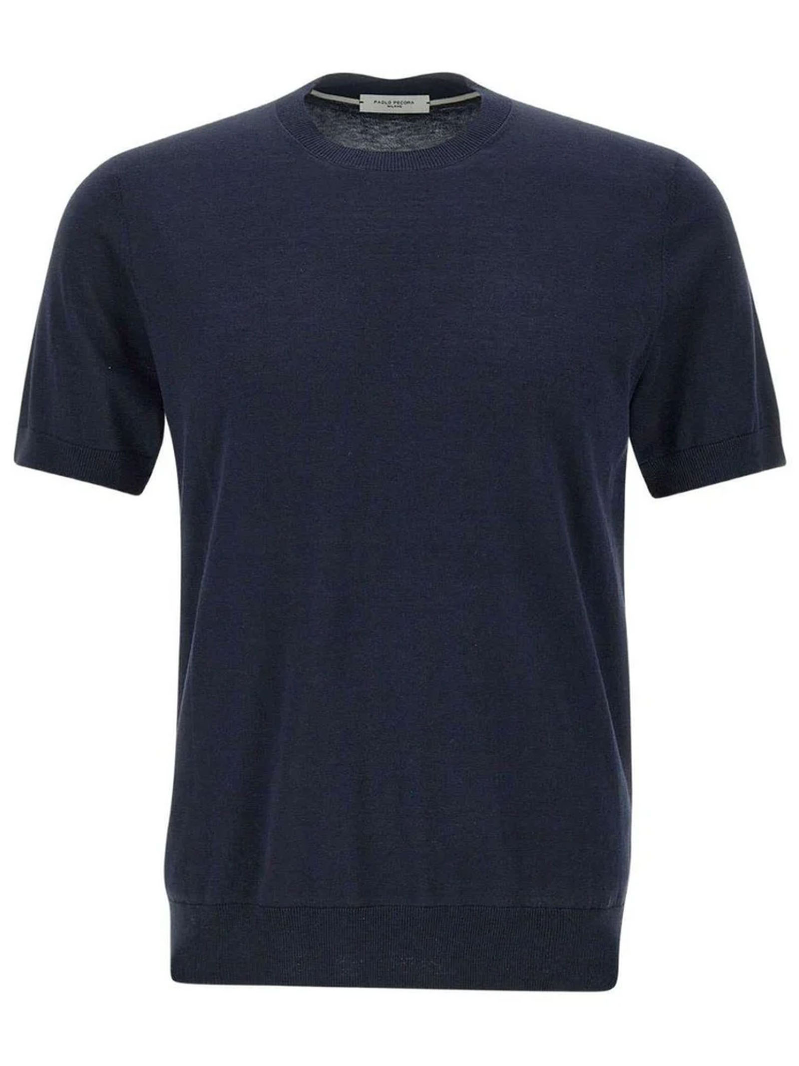T-shirt in maglia di seta e cotone blu con maniche corte, girocollo, Lavorazione rasata, Finezza 16, collo, fondo e maniche a costina