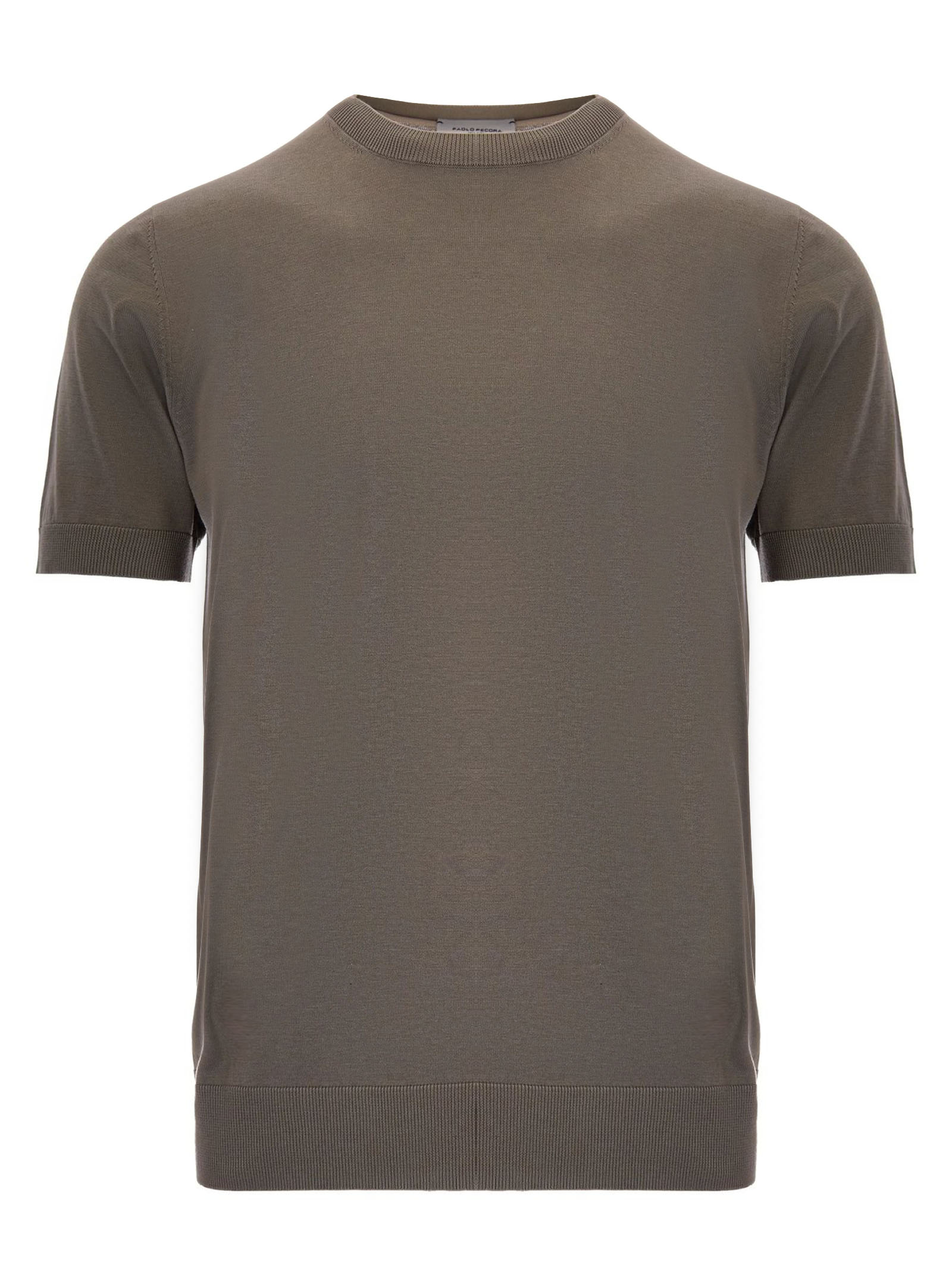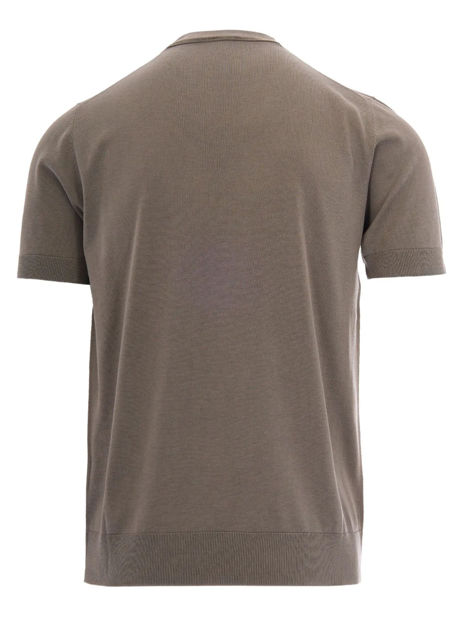 T-shirt in maglia di seta e cotone verde con maniche corte, girocollo, Lavorazione rasata, Finezza 16, collo, fondo e maniche a costina
