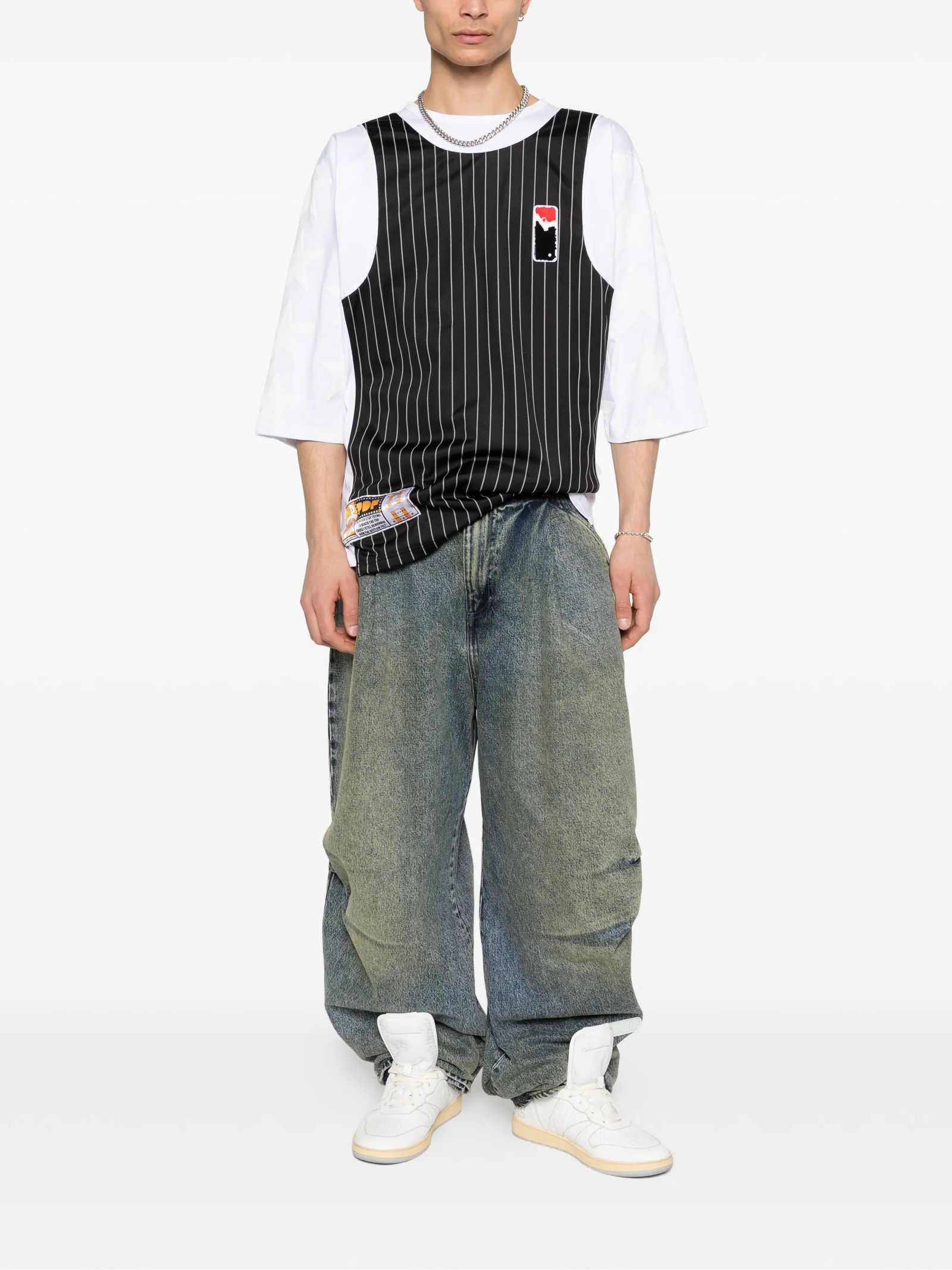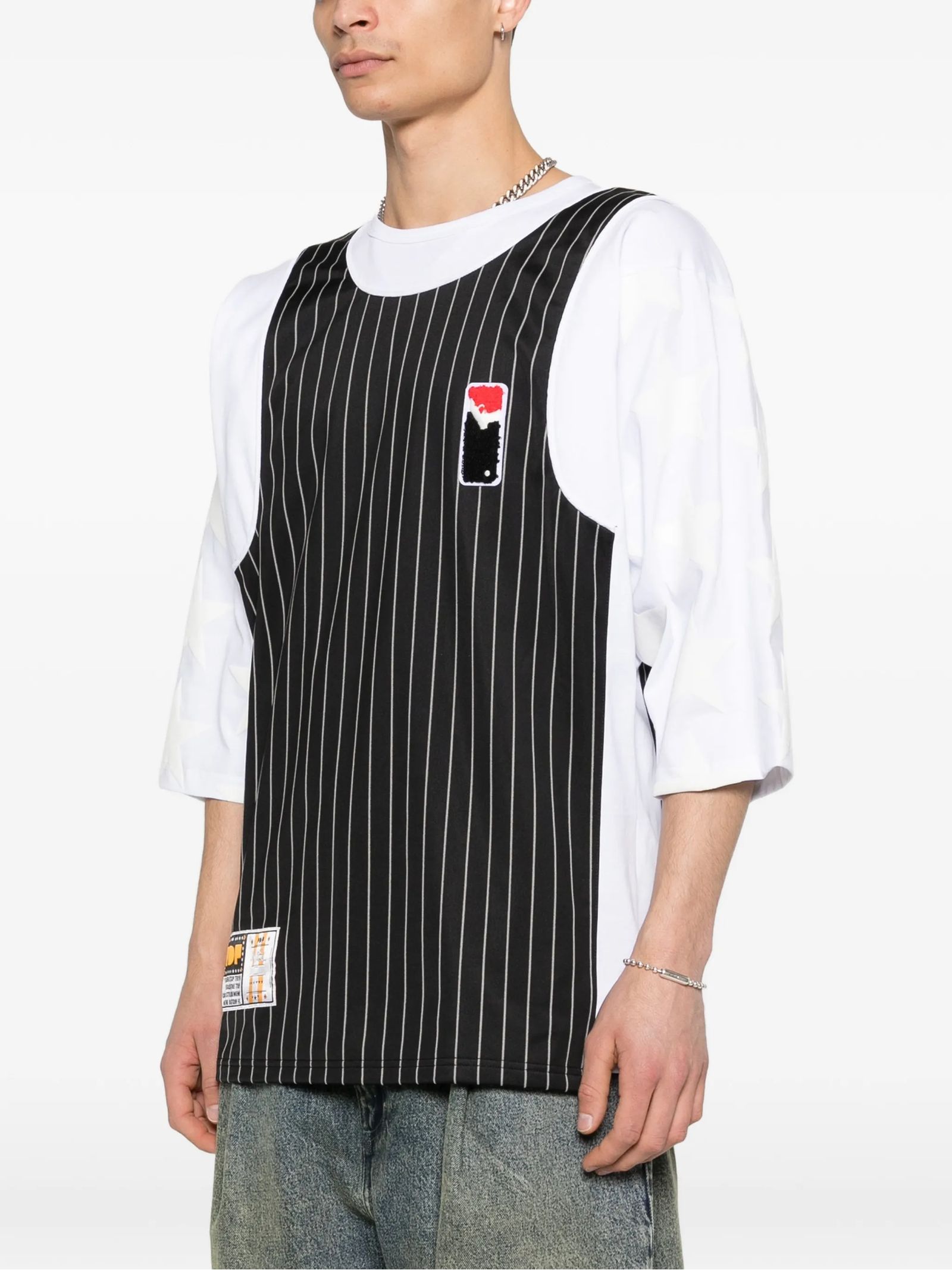 T-shirt in cotone bianco e nero, pannello in tessuto a costine nero, struttura a due tessuti e due colori, girocollo, design a canotta a strati, maniche con motivo a stelle tridimensionale, stampa grafica sul retro, toppa personalizzata, etichetta persona