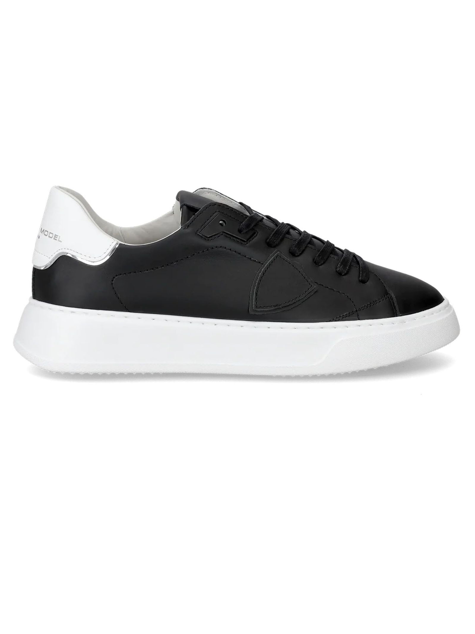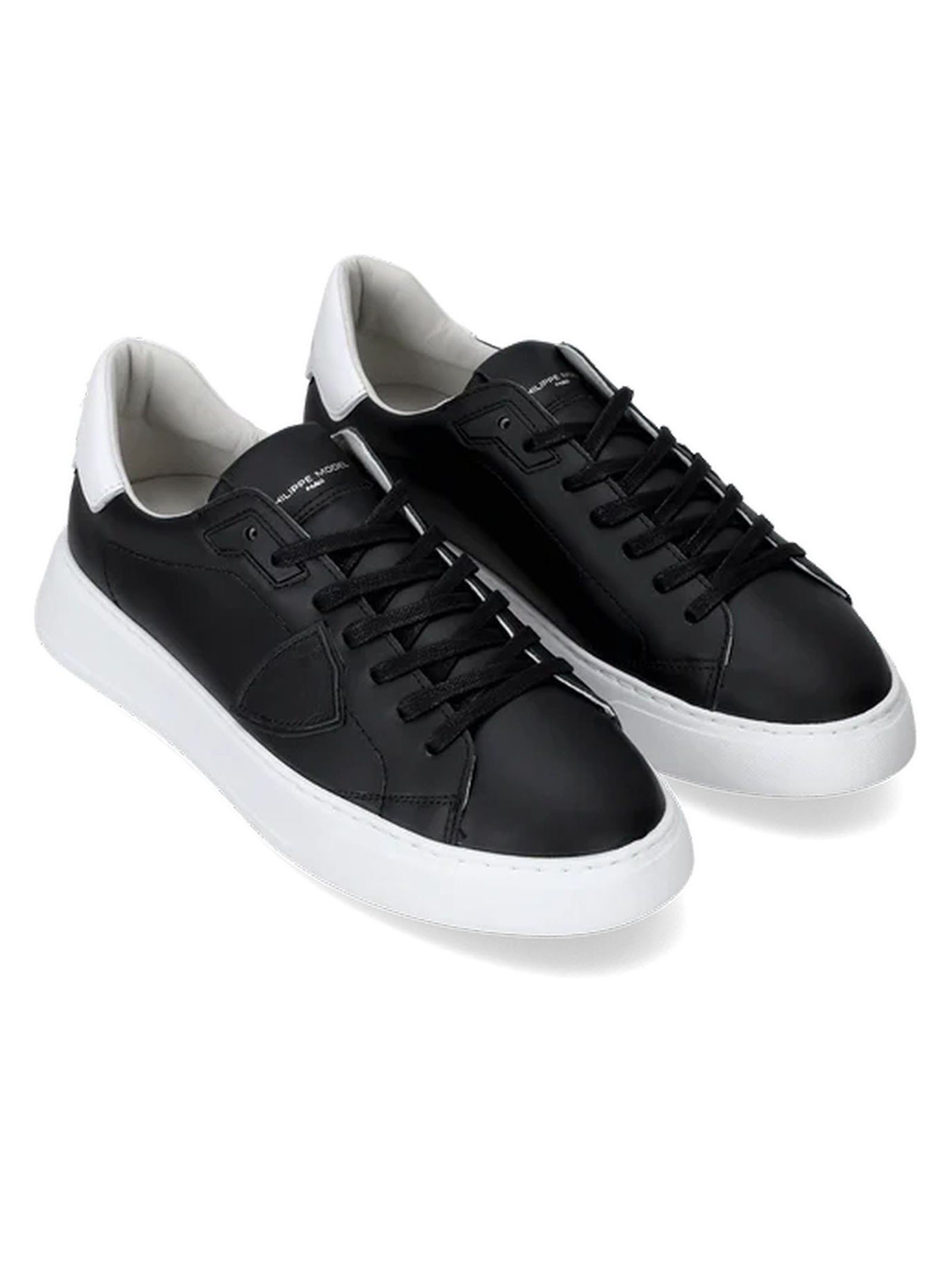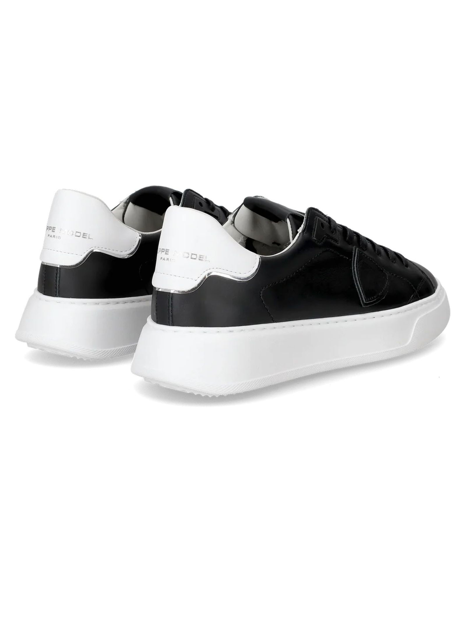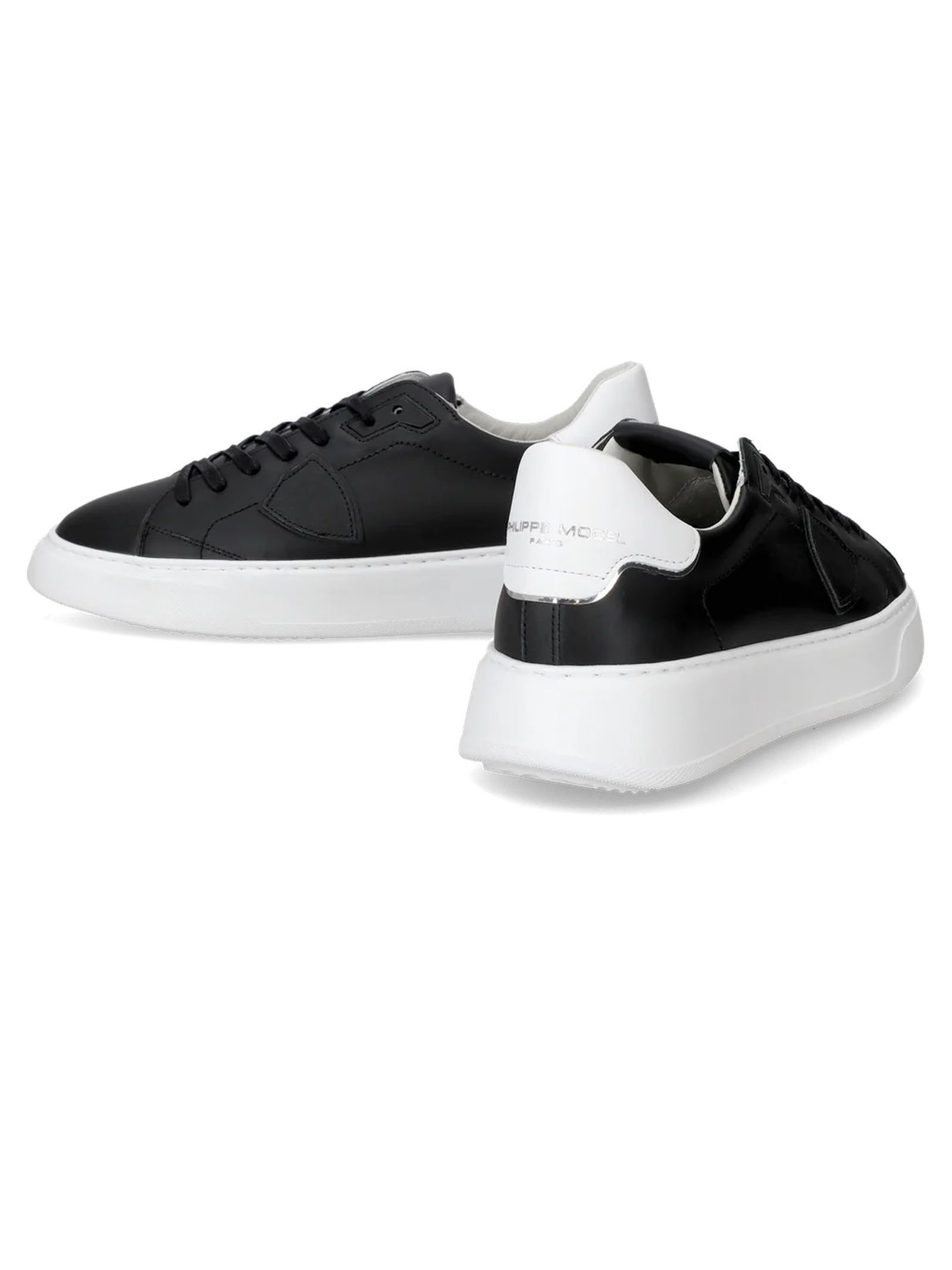 Sneaker in vitello nero con dettagli a contrasto e bordi a specchio. Fodera interna in pelle e spugna di cotone, con fussbett estraibile. Suola bold in gomma ultra leggera con finiture artigianali. Altezza al tallone: 4 cm.