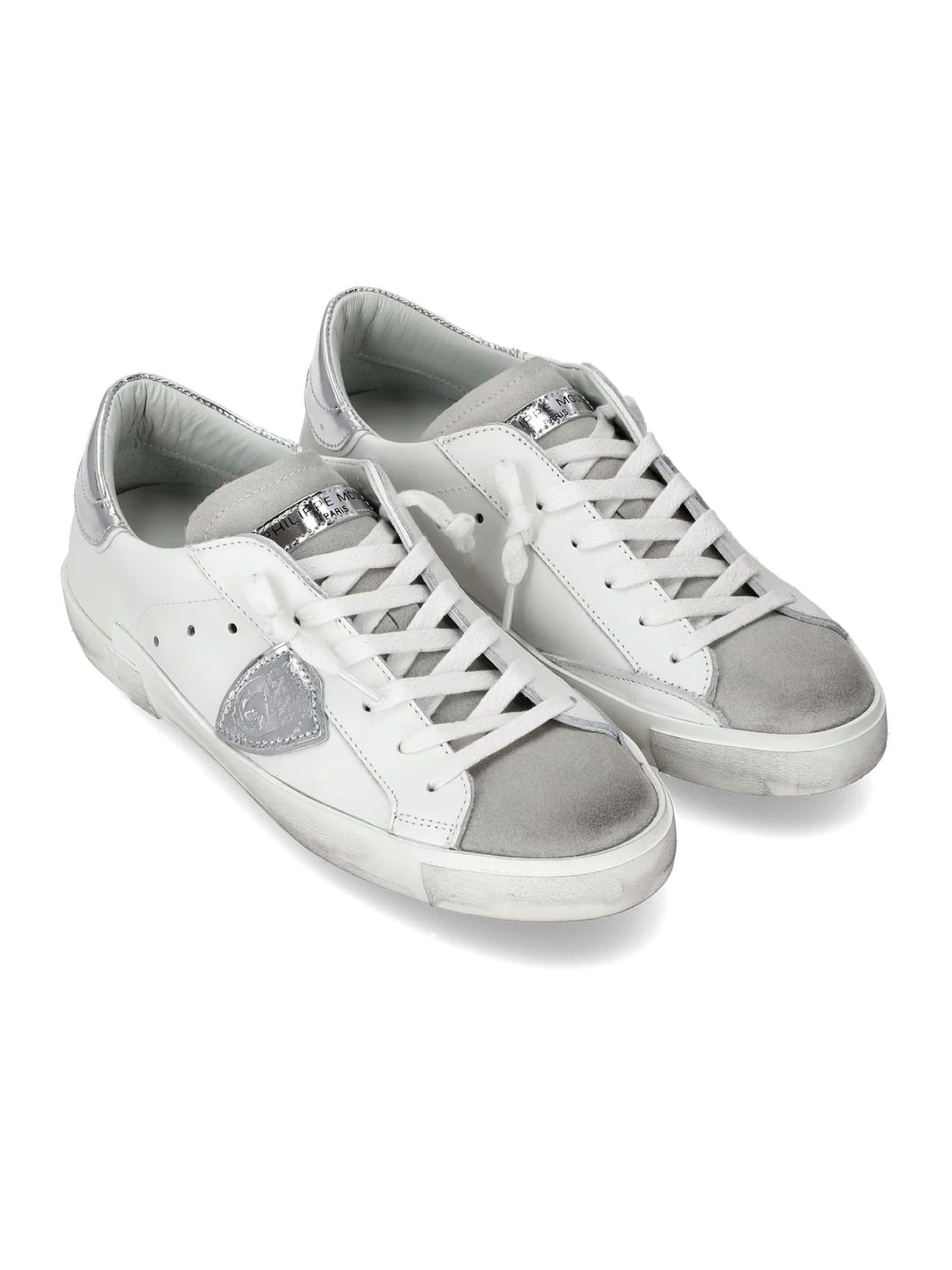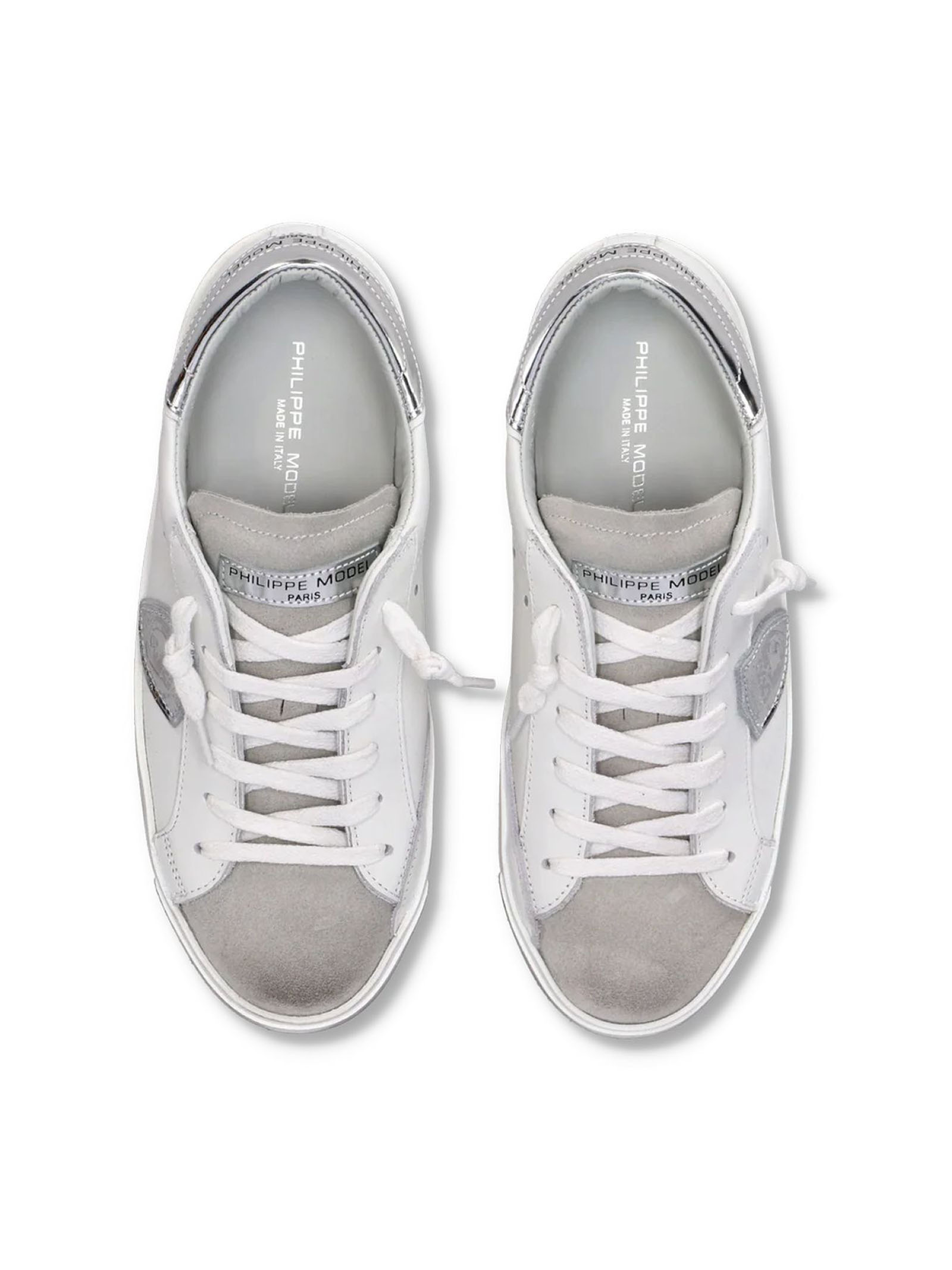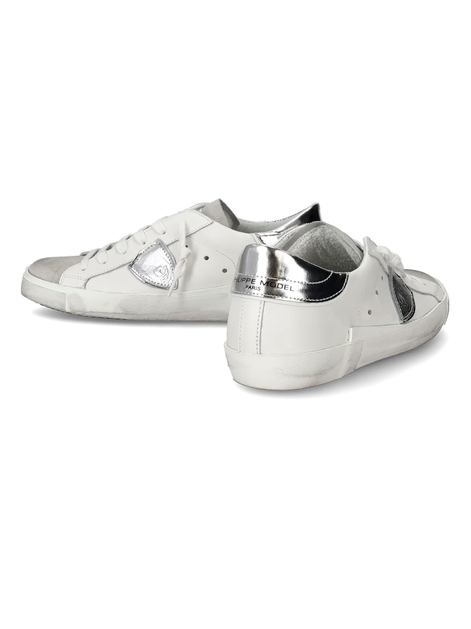 Sneaker bassa con tomaia in vitello bianco e suede con dettagli argentati, fodera interna in pelle e spugna di cotone, fasciatura artigianale con spazzolature per un effetto vissuto, soletta interna estraibile, altezza 2,5 cm