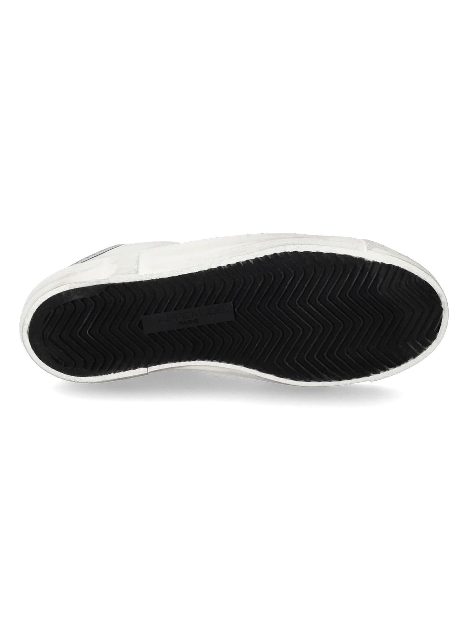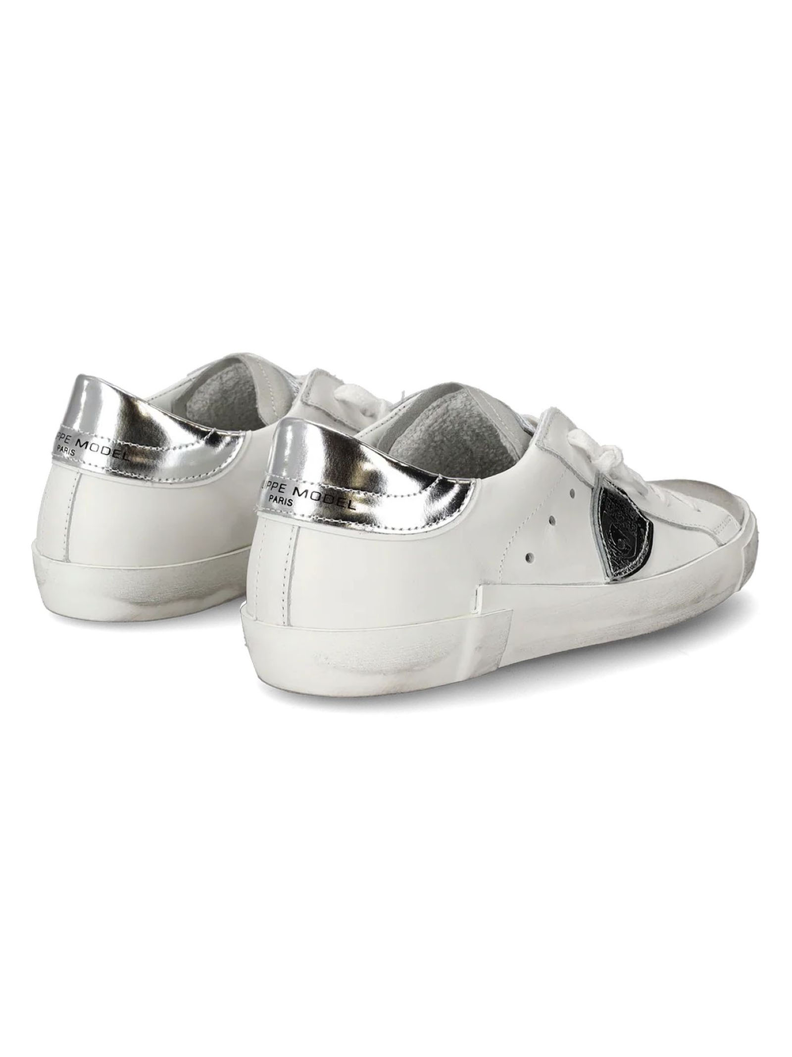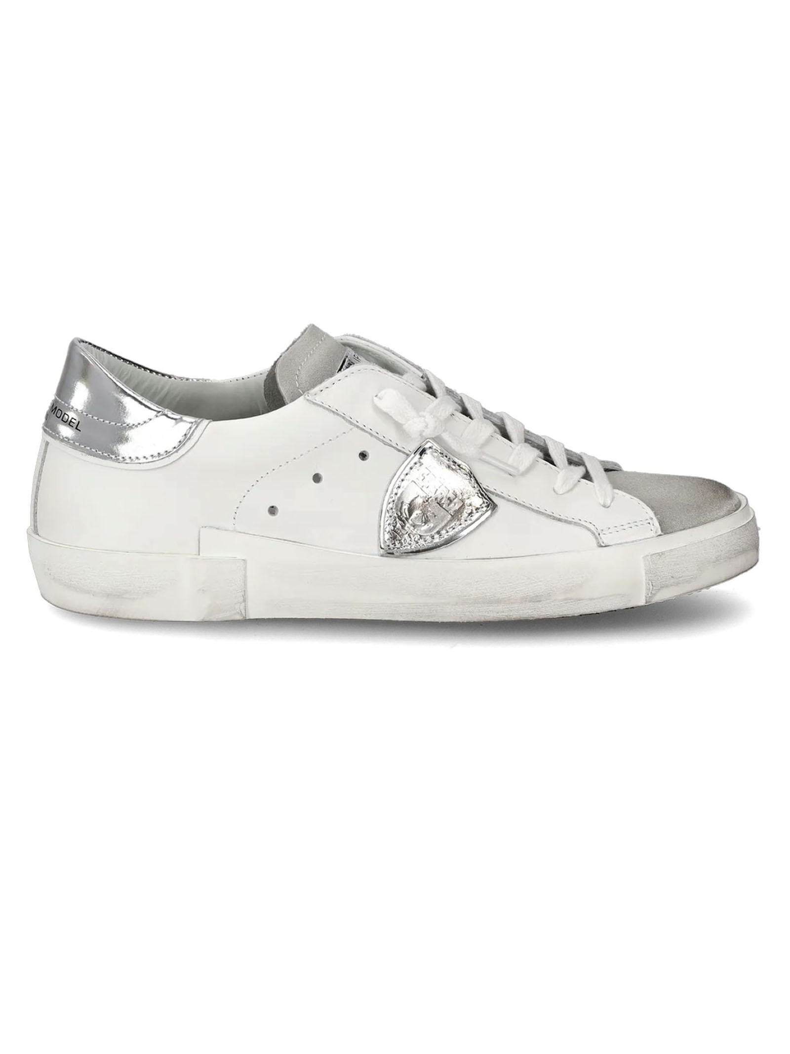 Sneaker bassa con tomaia in vitello bianco e suede con dettagli argentati, fodera interna in pelle e spugna di cotone, fasciatura artigianale con spazzolature per un effetto vissuto, soletta interna estraibile, altezza 2,5 cm
