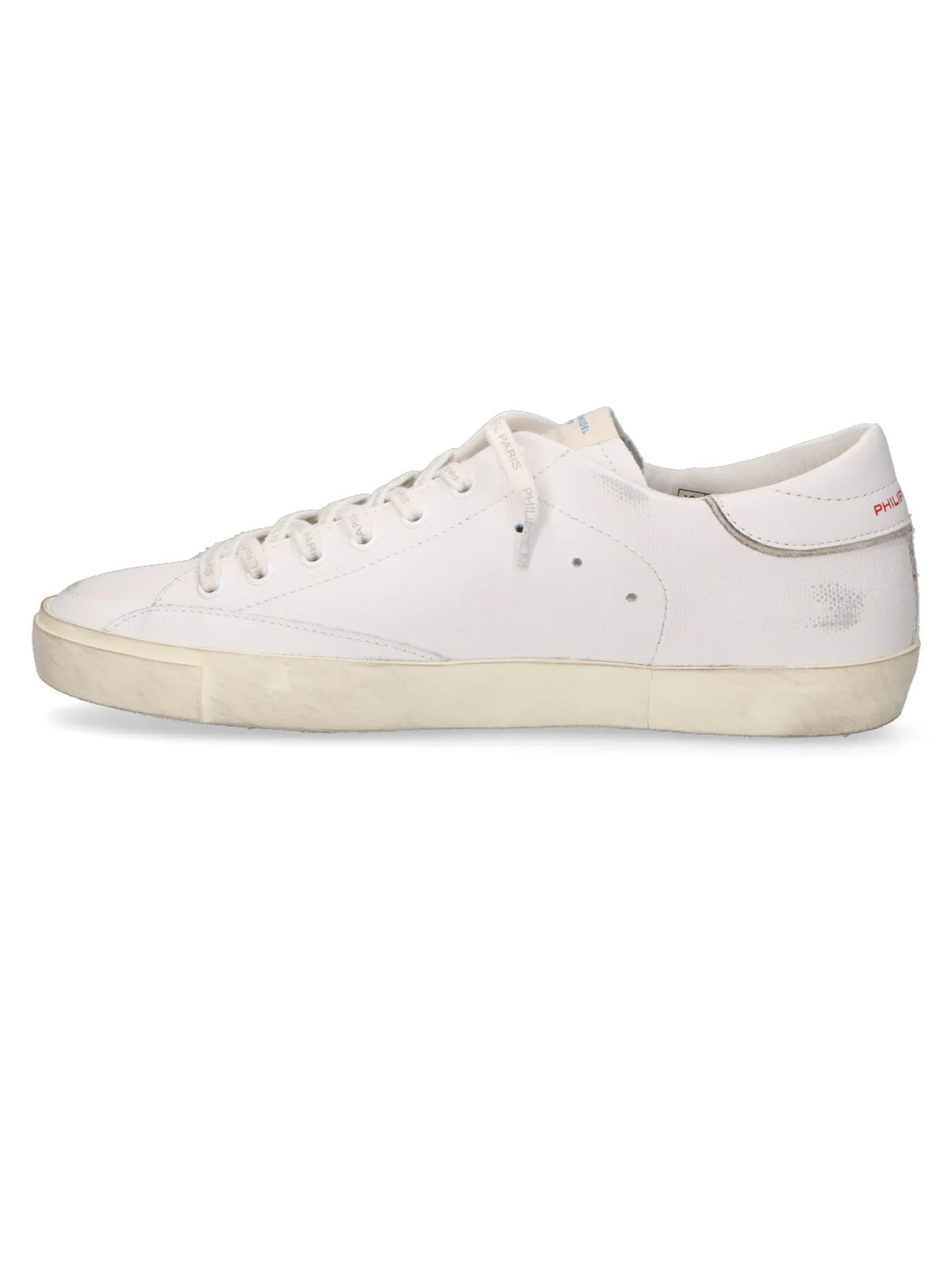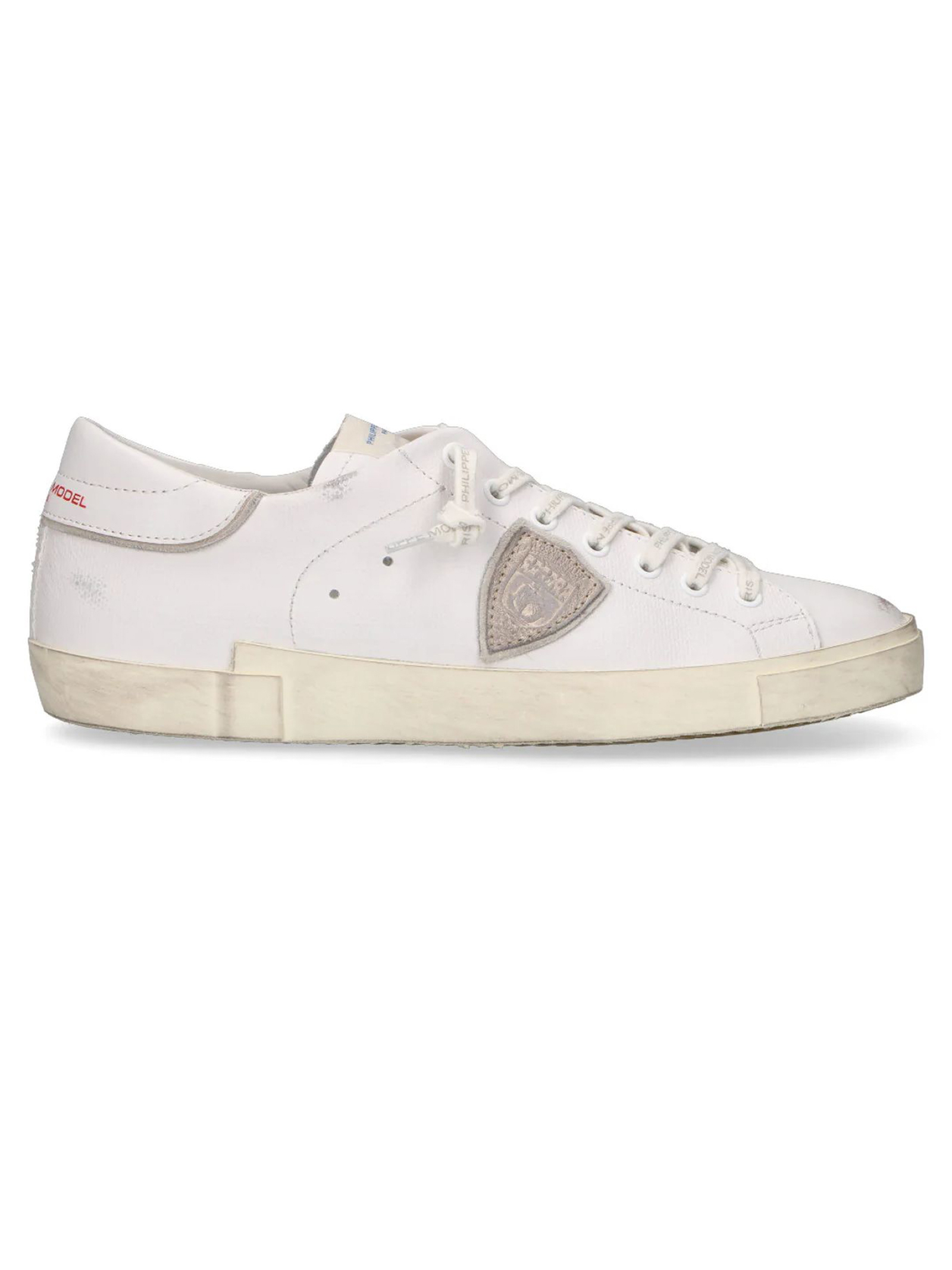 Sneakers Prsx in pelle bianca, Fodera in spugna, Scudetto "Philppe Model" in camoscio a lato, Suola in gomma spazzolata, alta 2,5 centimetri, Plantare estraibile con alzatacco 3 cm, Lacci in cotone