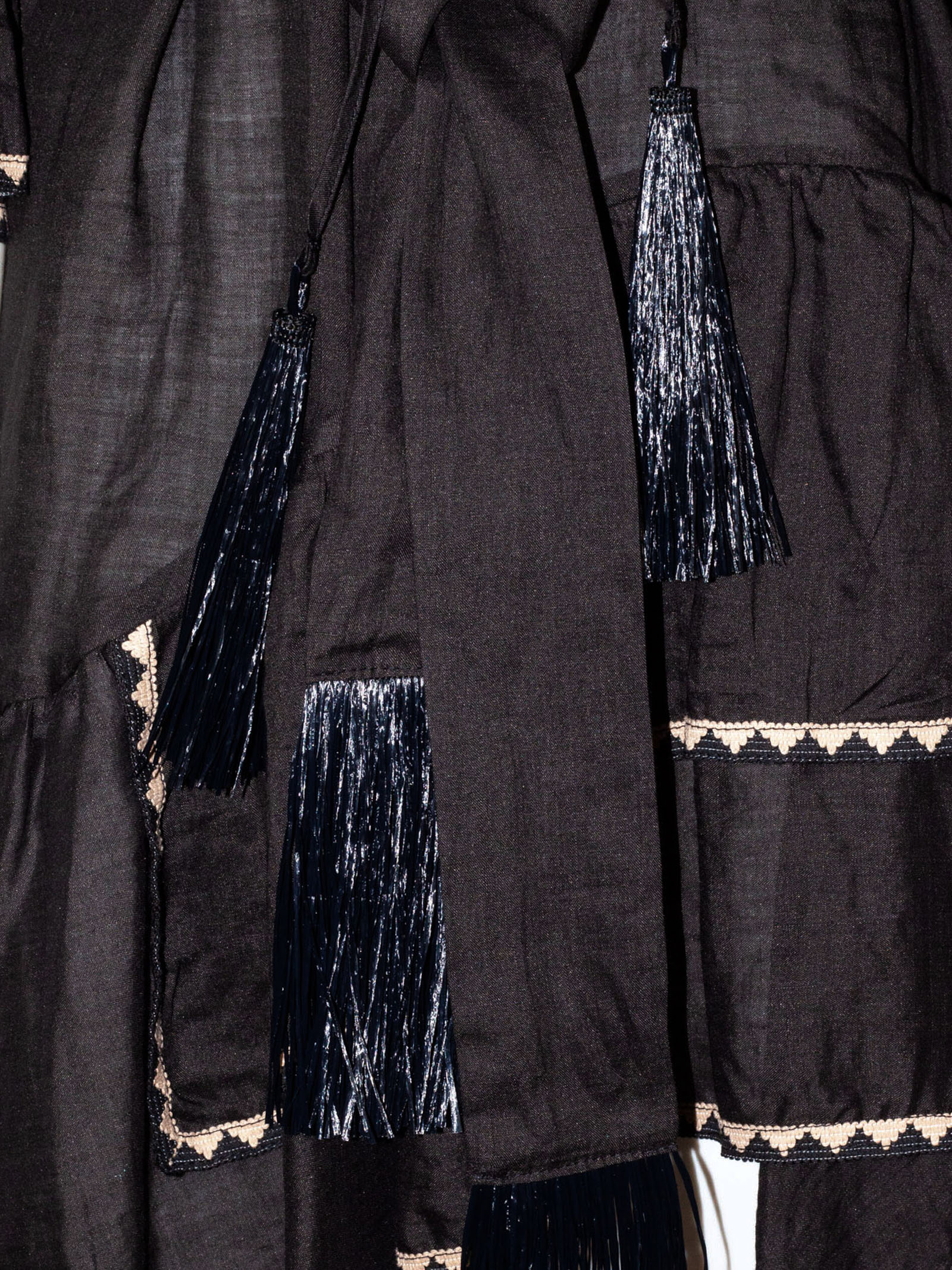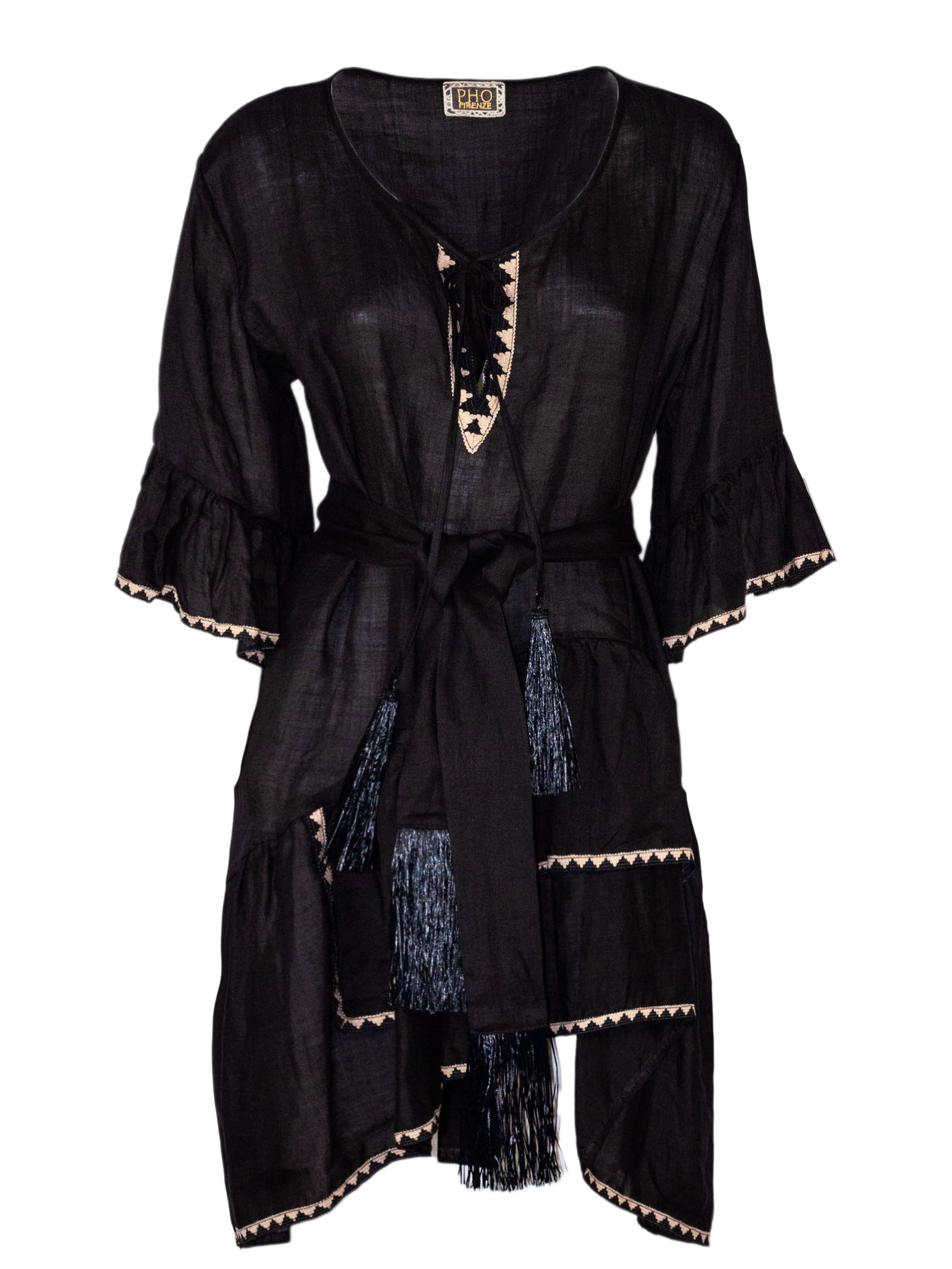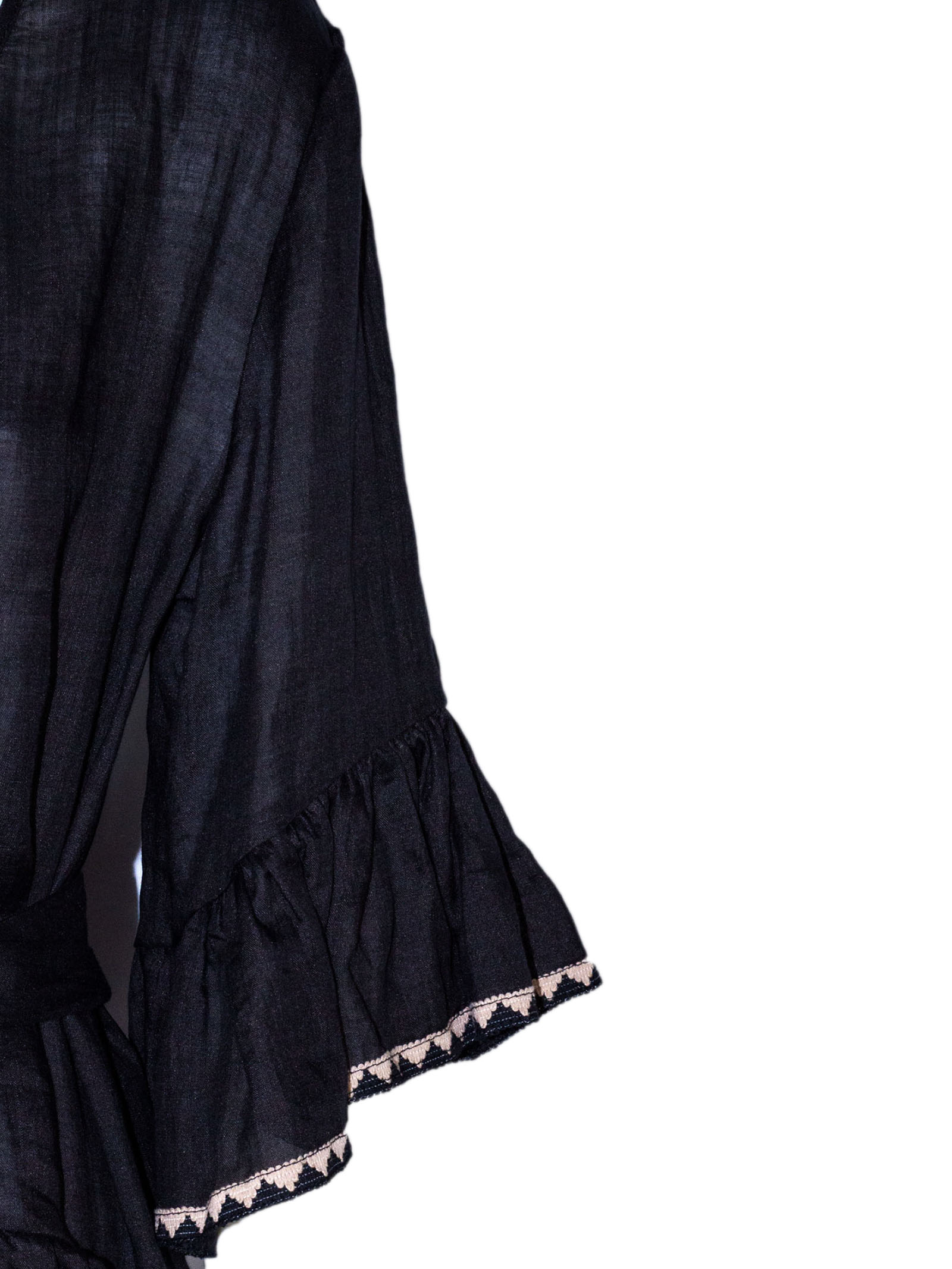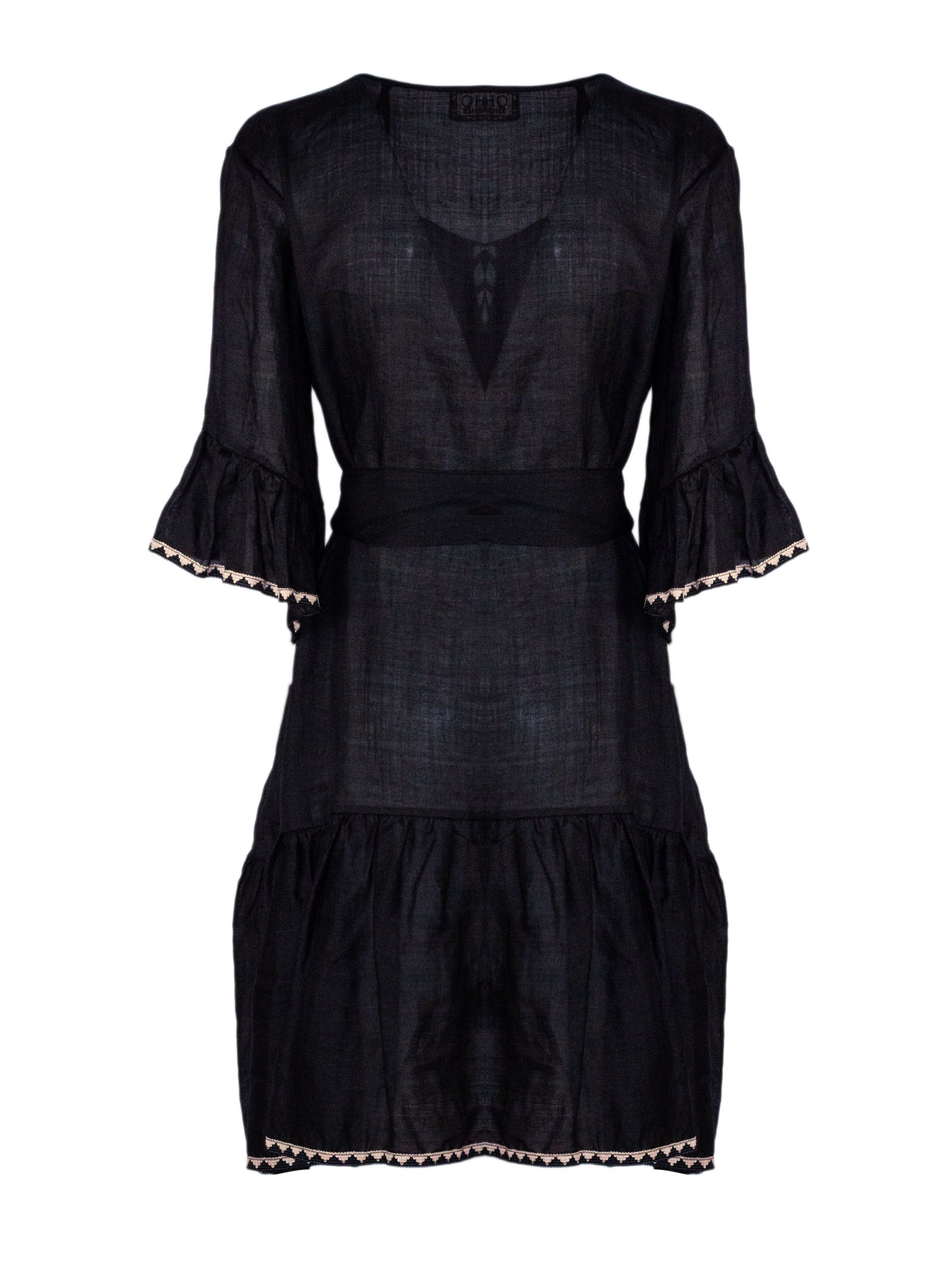 Abito corto in ramie nero con dettagli ricamati a contrasto, scollo a V con inserto decorativo sul davanti, maniche a tre quarti ampie con balza, cintura in vita tono su tono, nappine decorative sul laccetto frontale, gonna con balze e profili ricamati