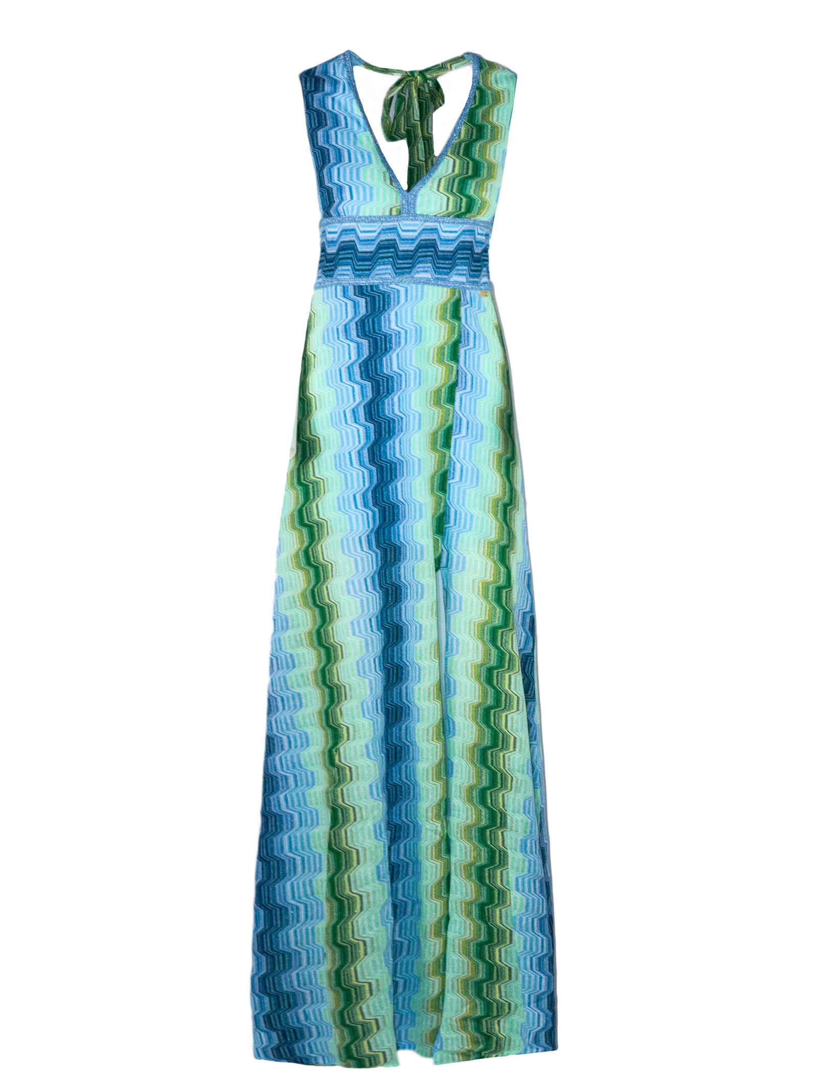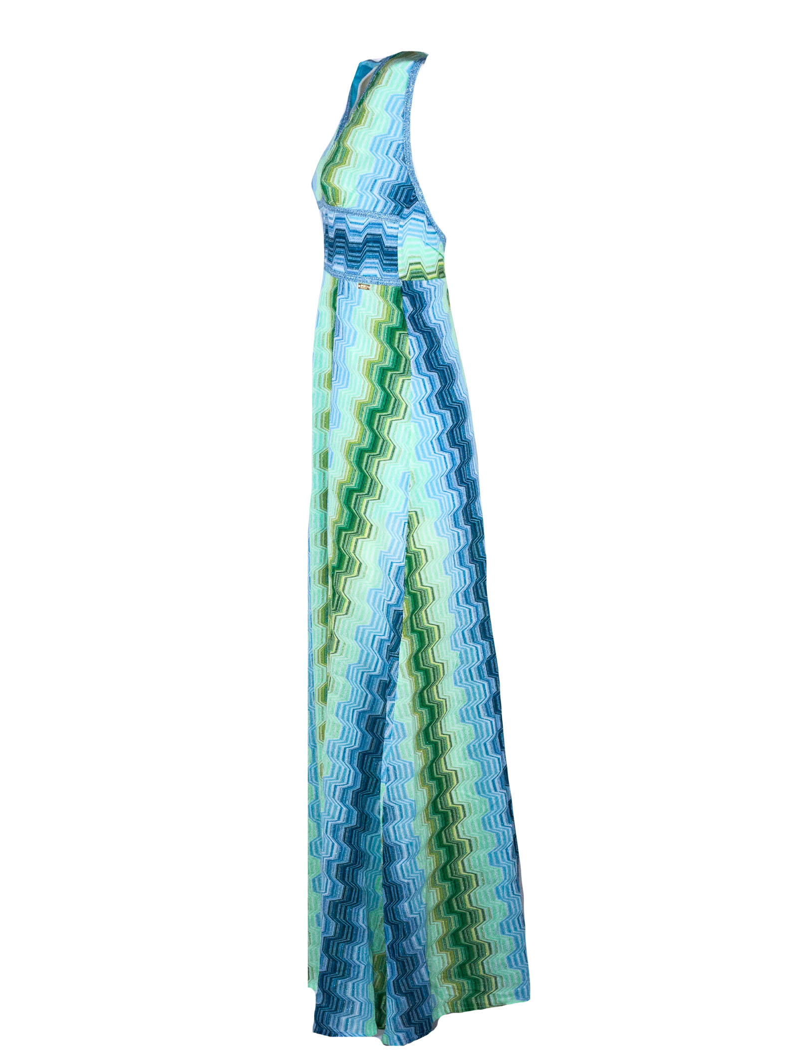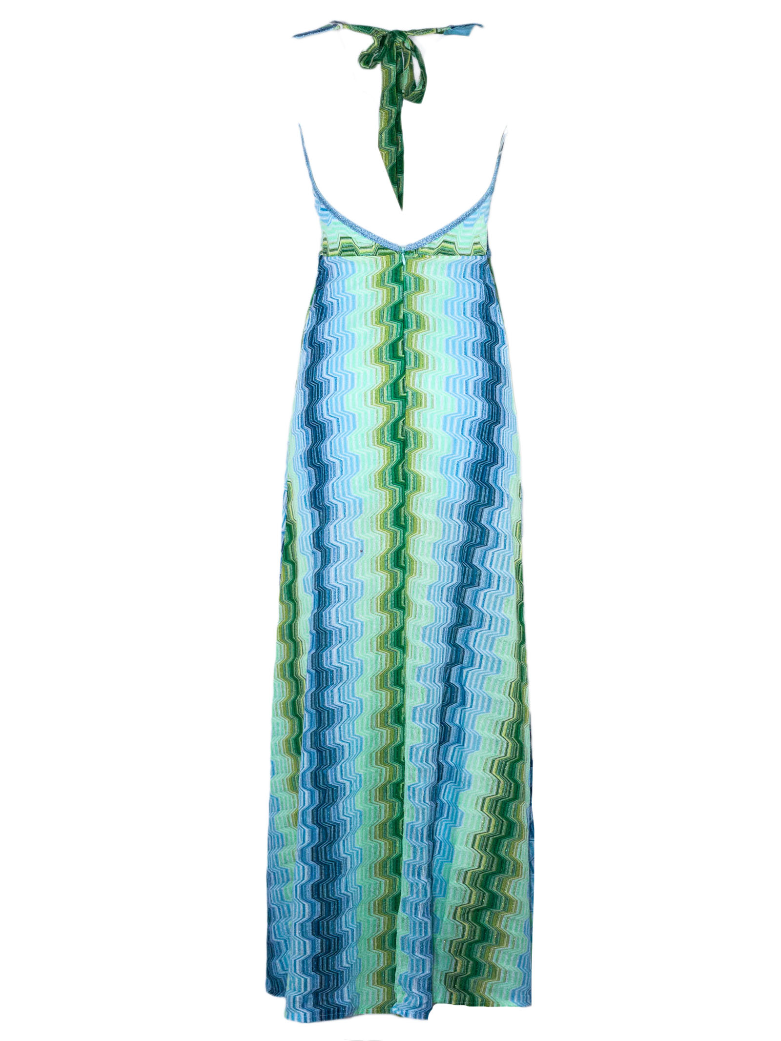 Abito in misto cotone fantasia zig zag nei toni del blu, azzurro e verde con body, chiusura laterale con zip nascosta, chiusura con nodo sul retro, scollo a V, senza maniche, punto vita definito, gonna ampia e fluida