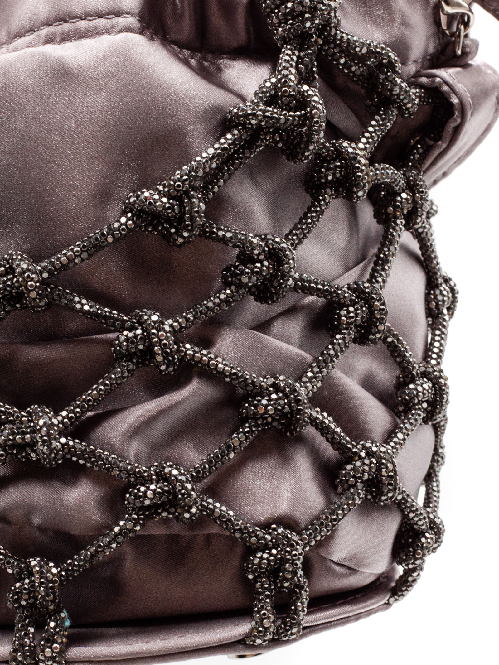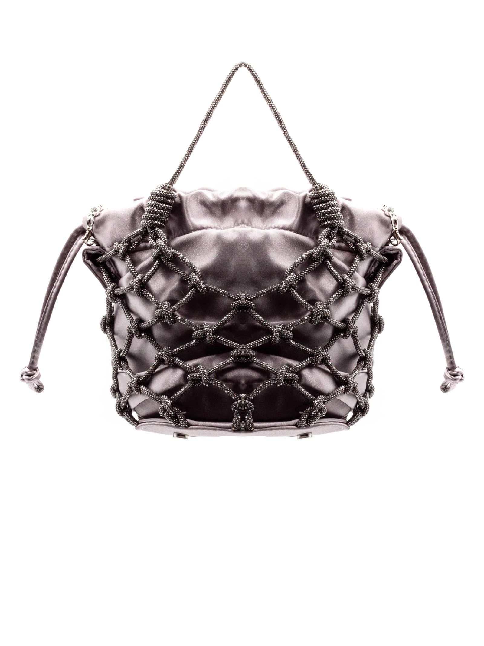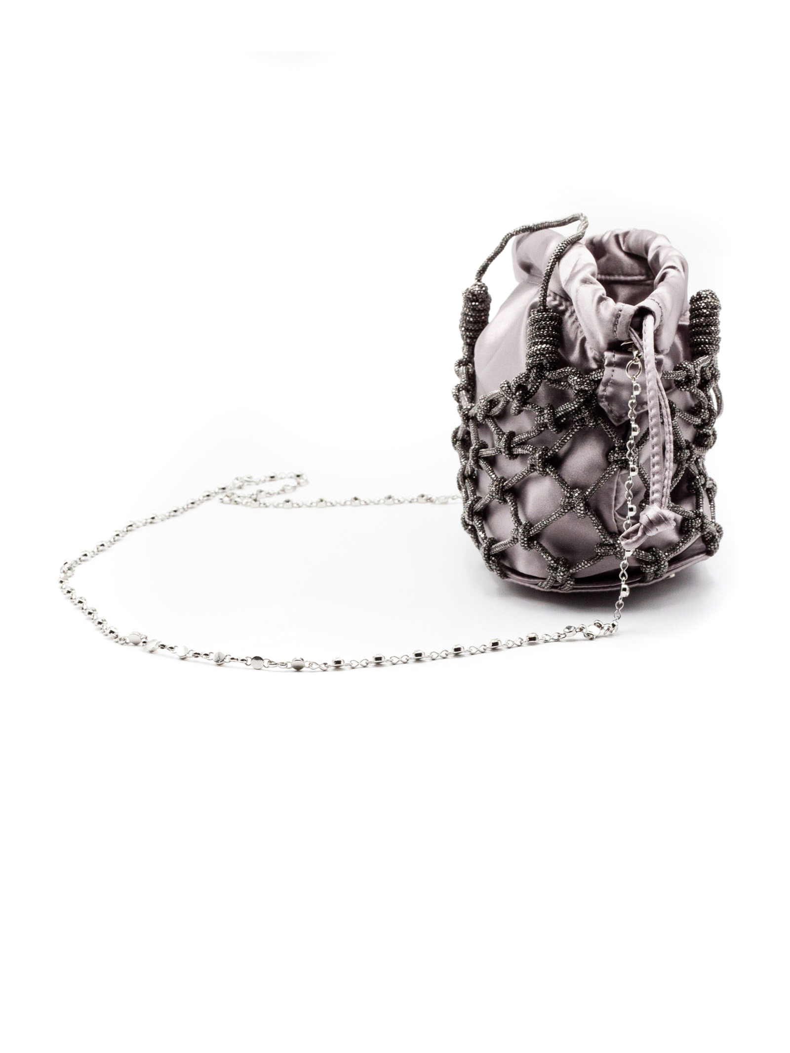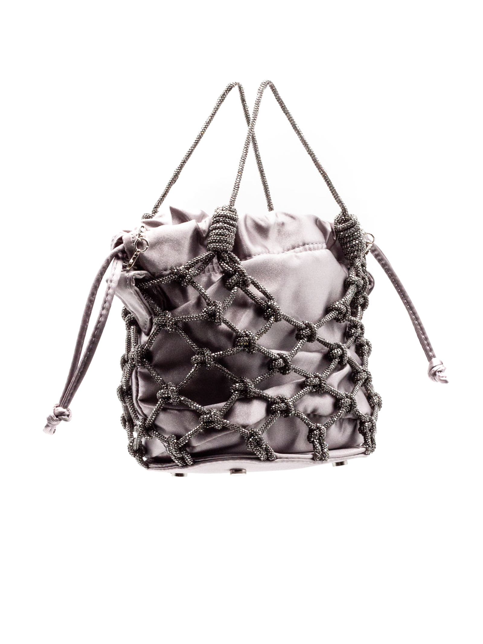 Borsa a secchiello design con rete intrecciata argento, struttura morbida, interno foderato in tessuto satin colore beige, manico doppio con catena dorata, tracolla con strass luminosi, chiusura con coulisse regolabile, piedini in metallo sul fondo, dimensioni A16 x L18 x P11 cm