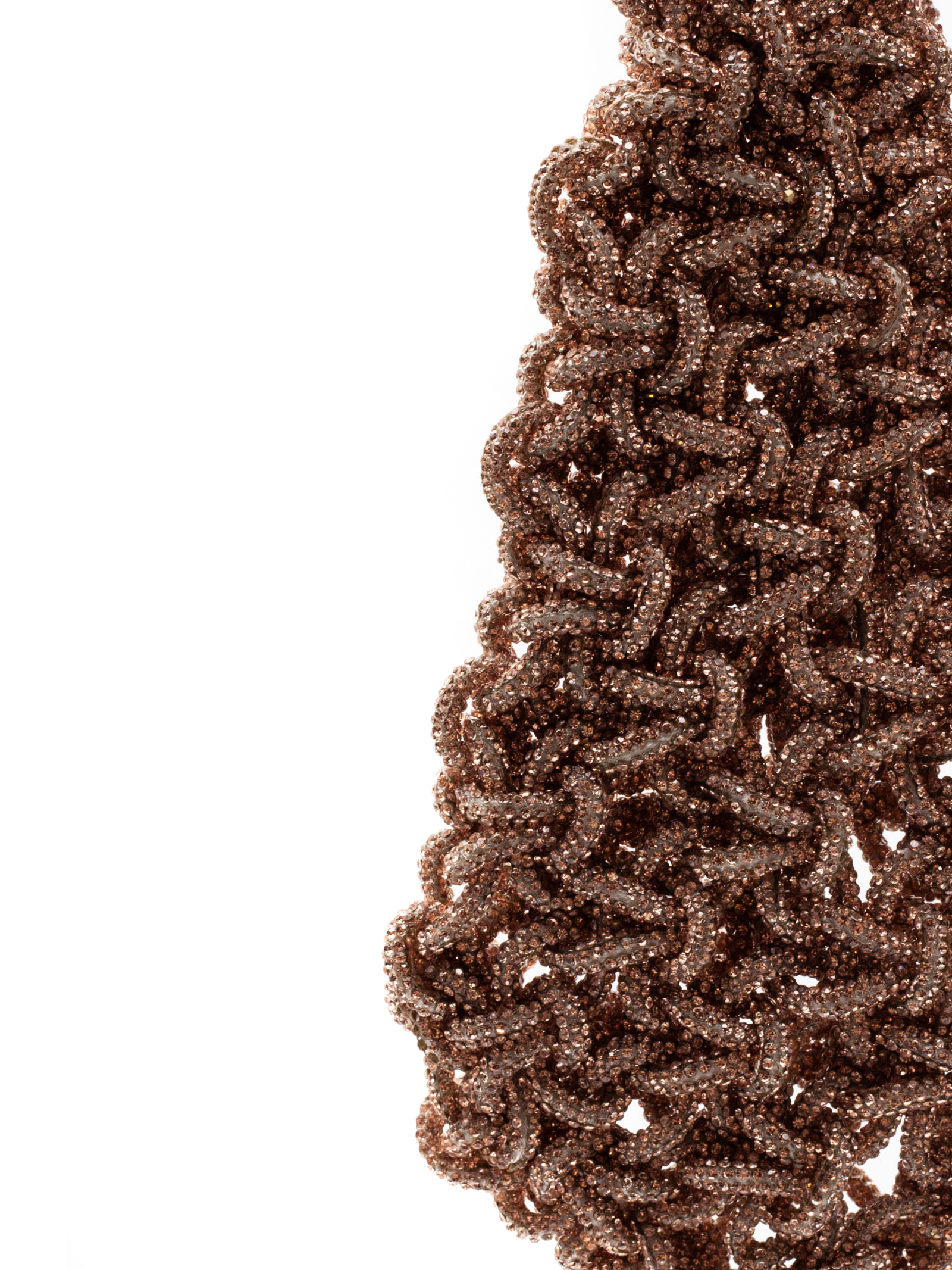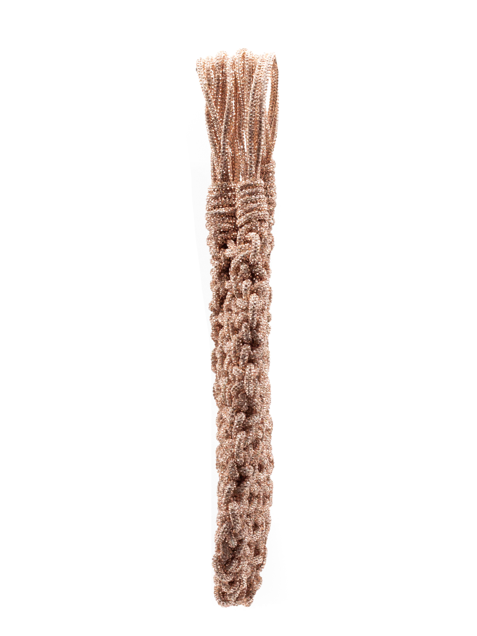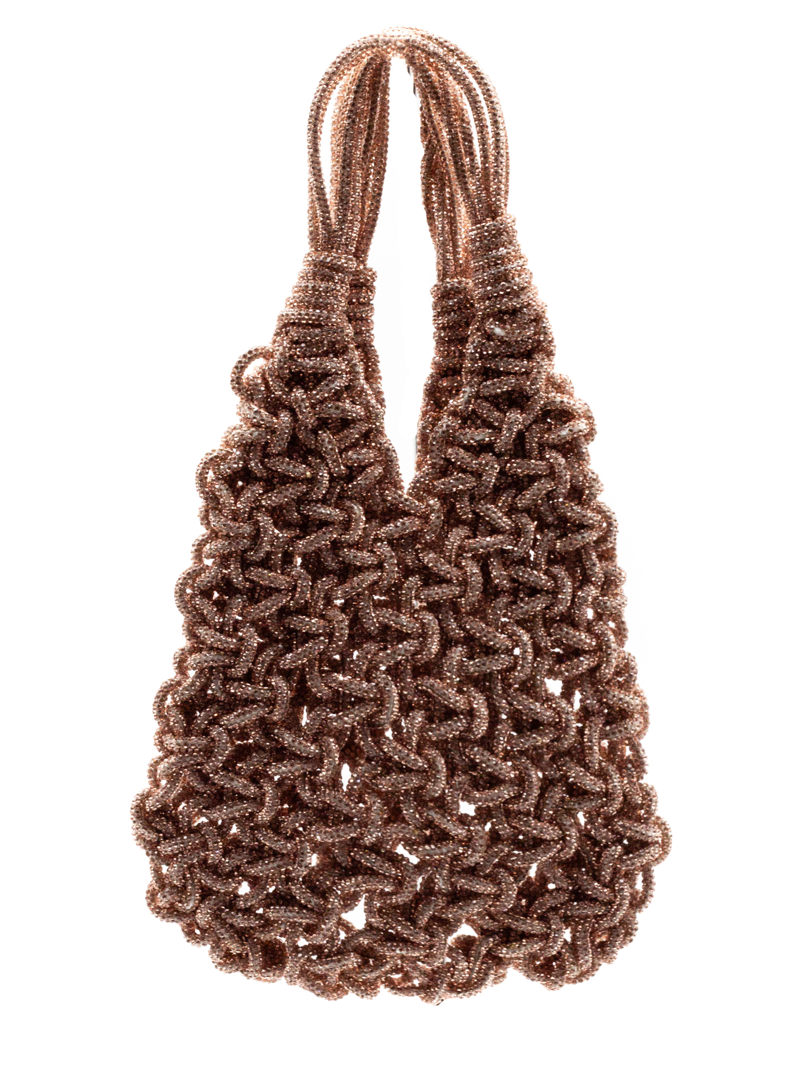Borsa a spalla dal design intrecciato oro, struttura morbida e flessibile, effetto rete, colore grigio argento luminoso, manico integrato coordinato, A22x L18 x P4 cm
