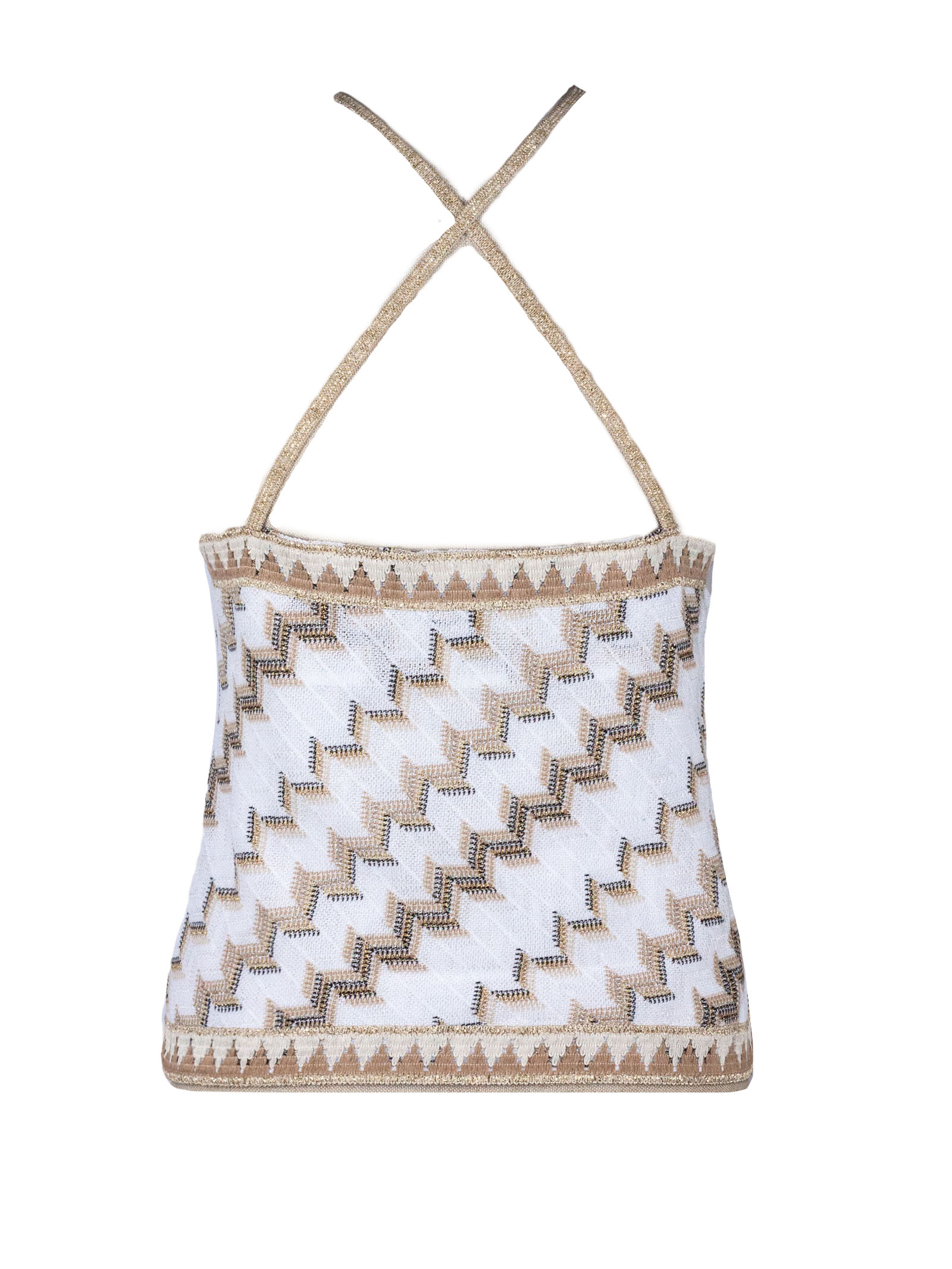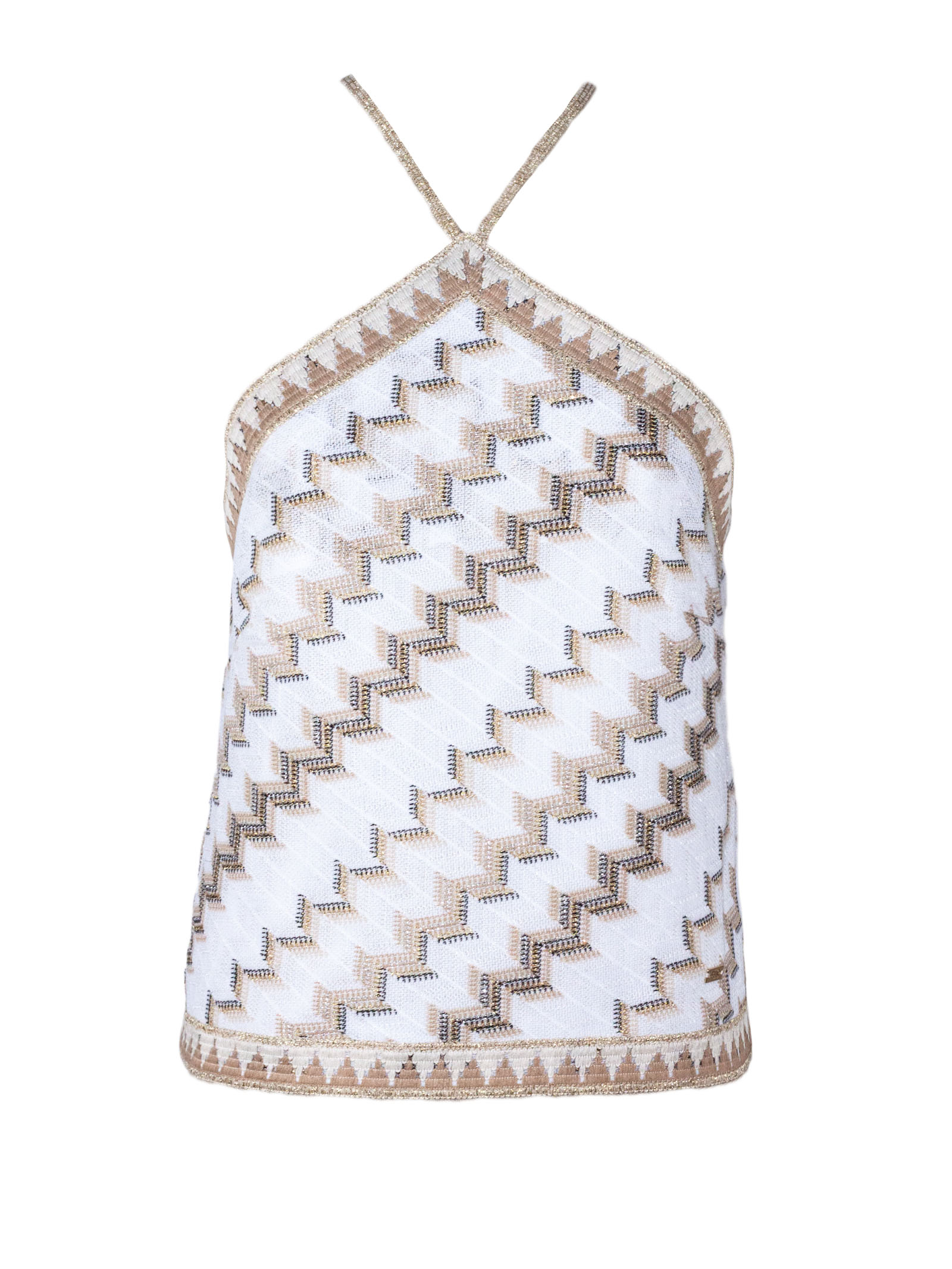 Top in misto cotone bianco con ricami geometrici a contrasto, scollo halter con spalline sottili, linea dritta e vestibilità confortevole, profili decorativi lungo scollo e fondo