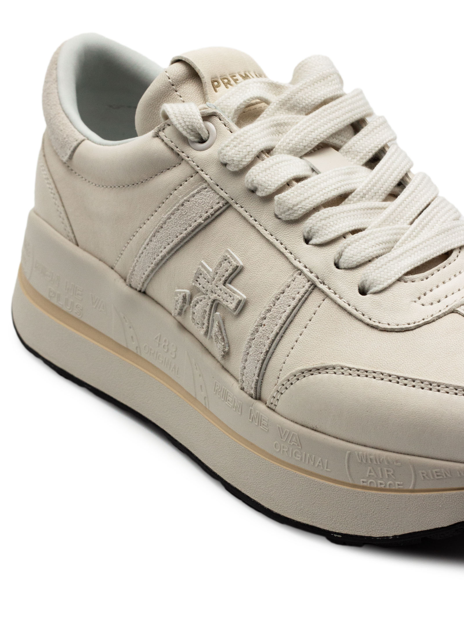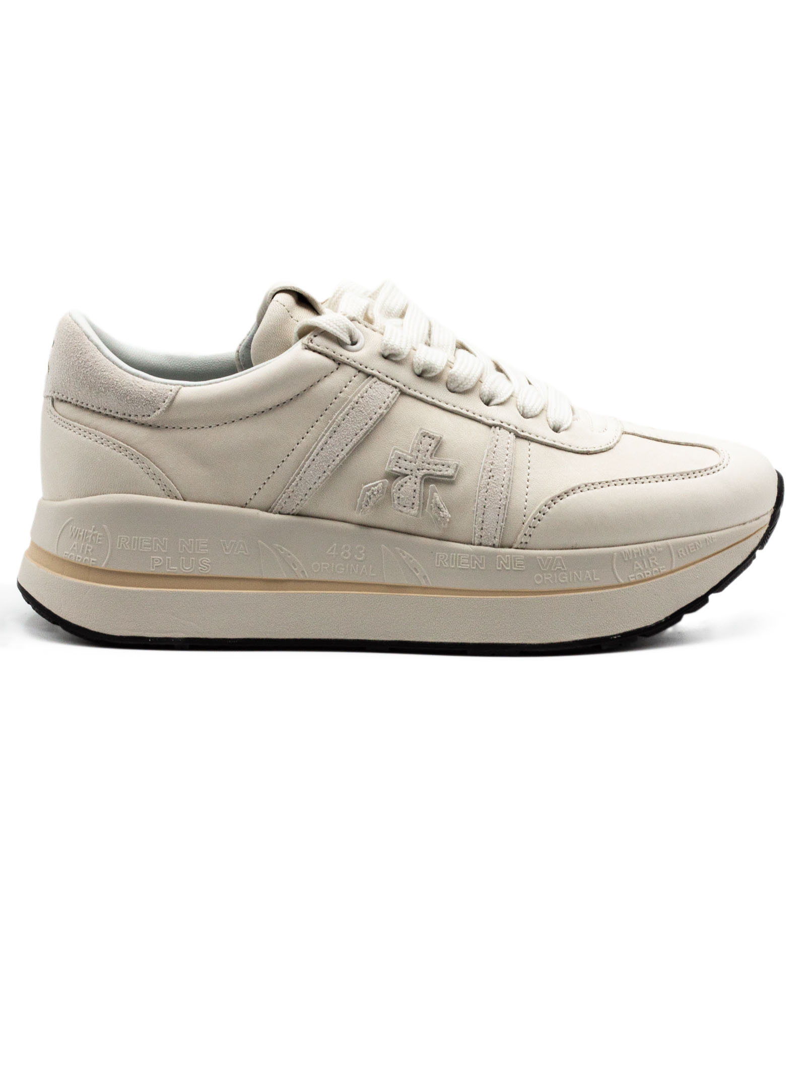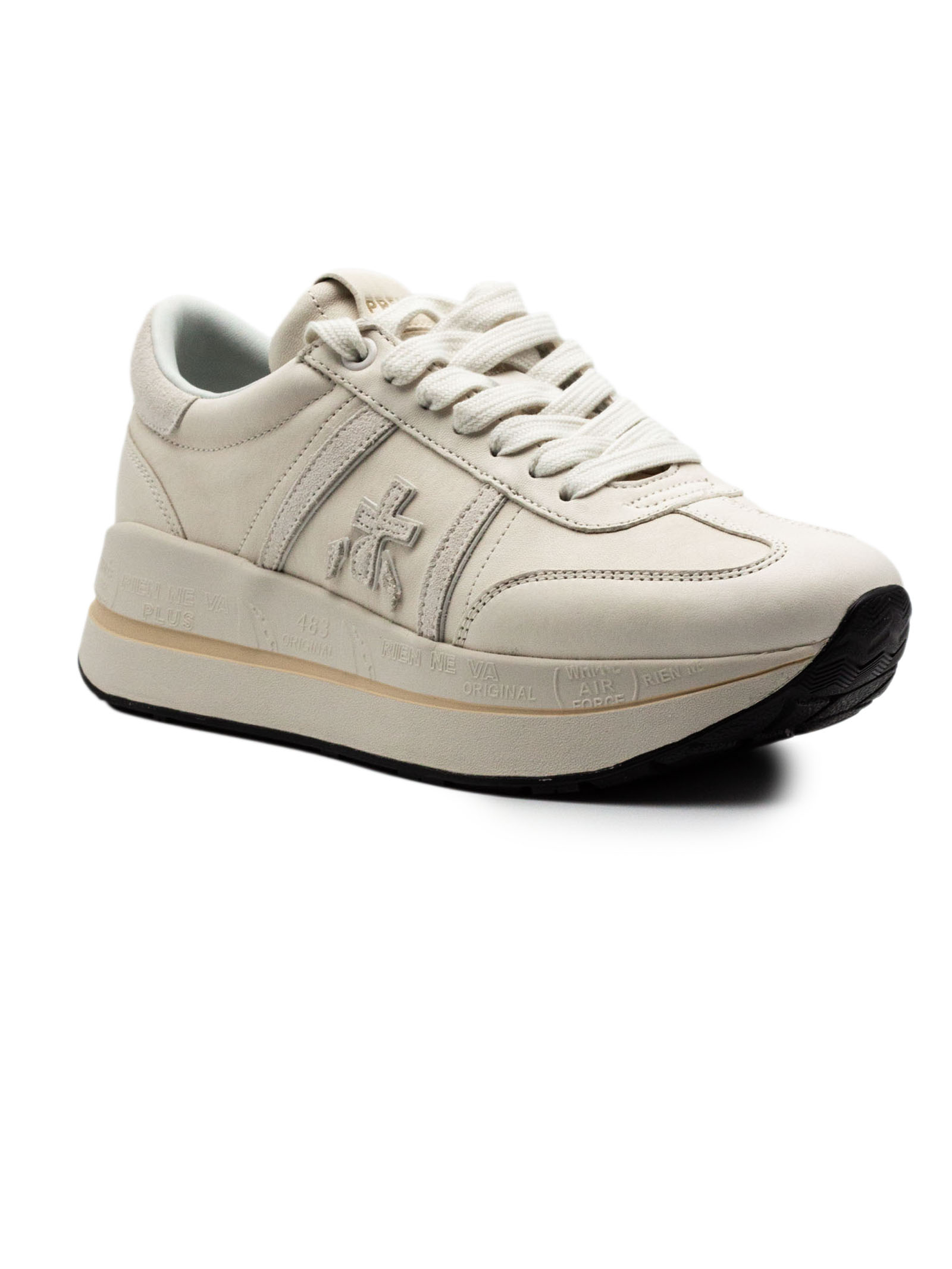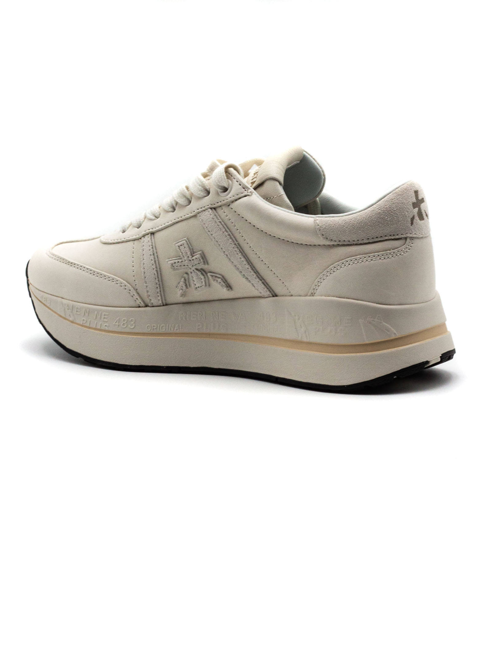 Sneakers Beth Coin in pelle bianca con chiusura frontale con lacci, rinforzo sul tallone a contrasto, linguetta con logo inciso, applicazione con logo, punta tonda, soletta con logo, fodera in pelle, suola chunky in gomma, altezza suola 4 cm