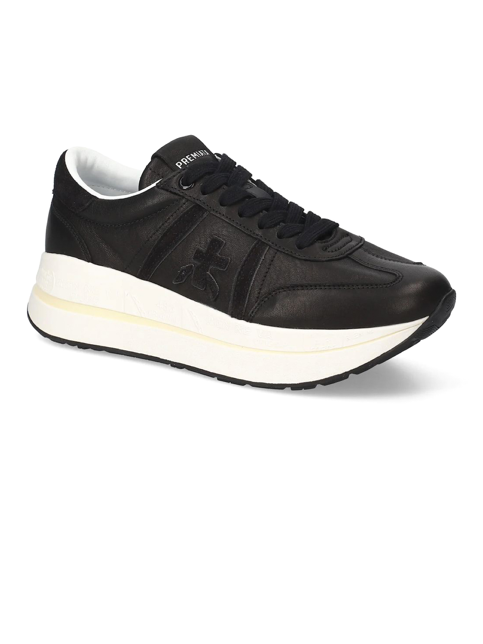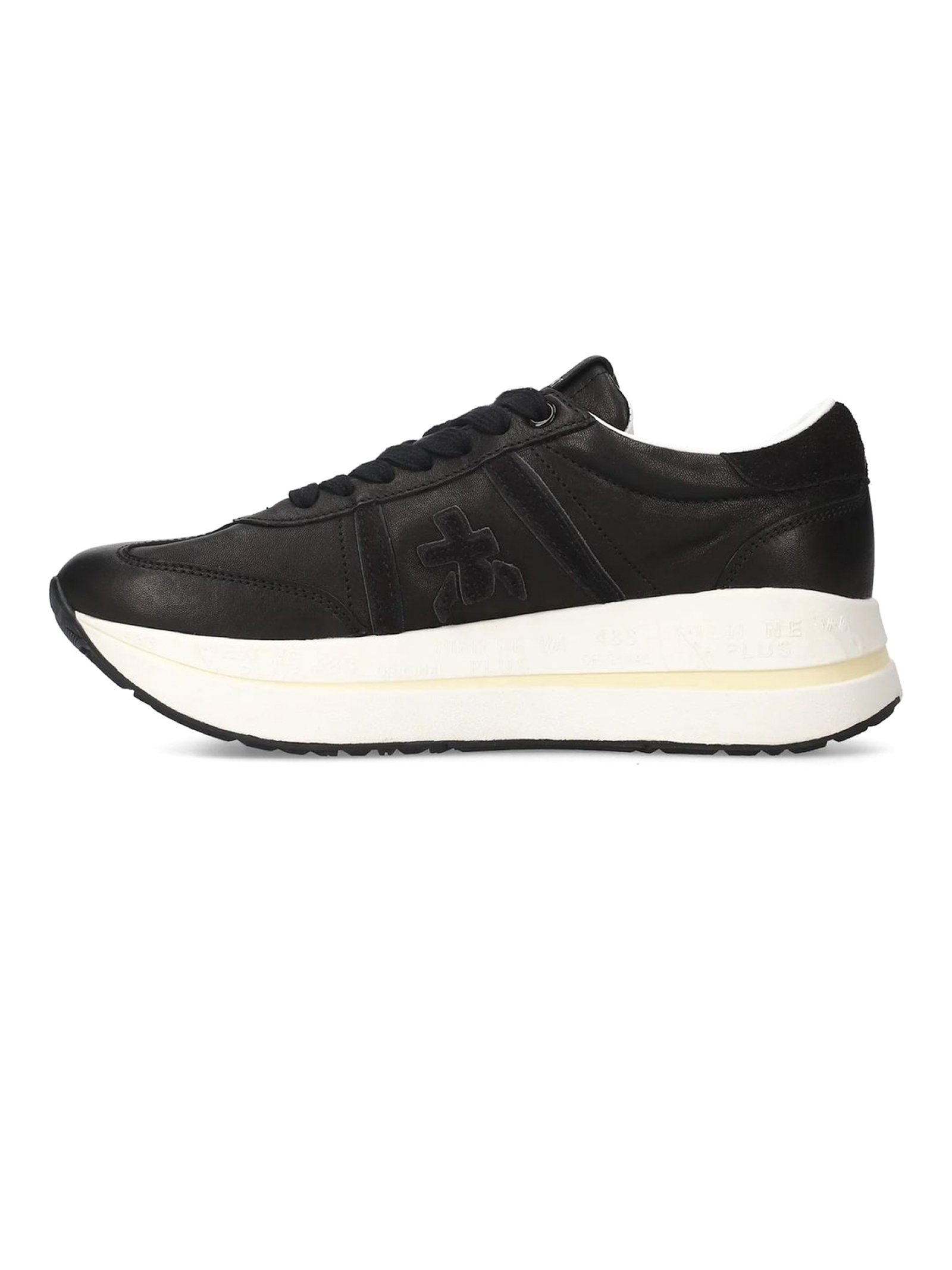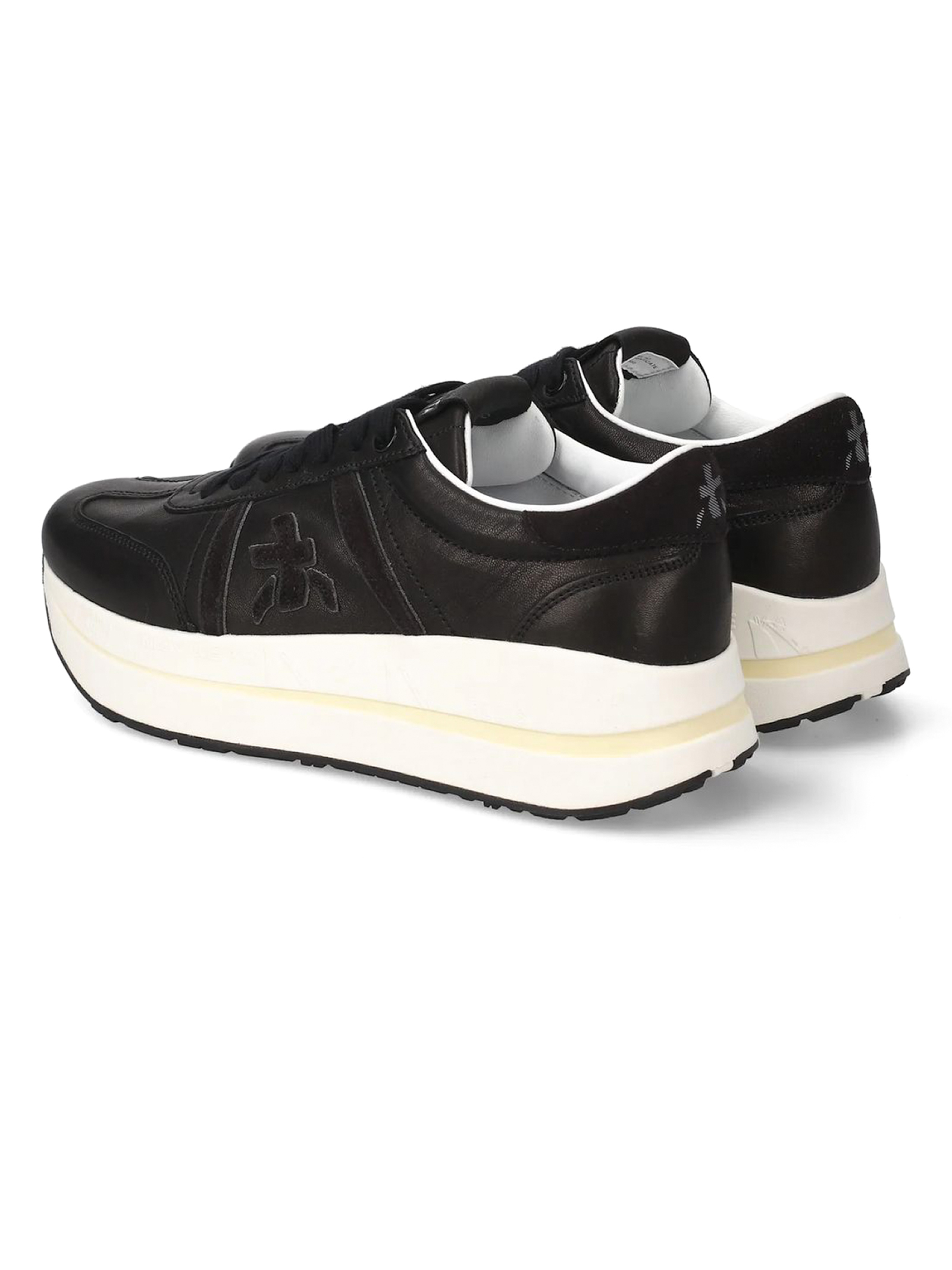 Sneakers Bethcoin in pelle nera con logo, suola con zeppa, chiusura con lacci, camoscio sul retro, occhielli decorativi, altezza suola 4 cm