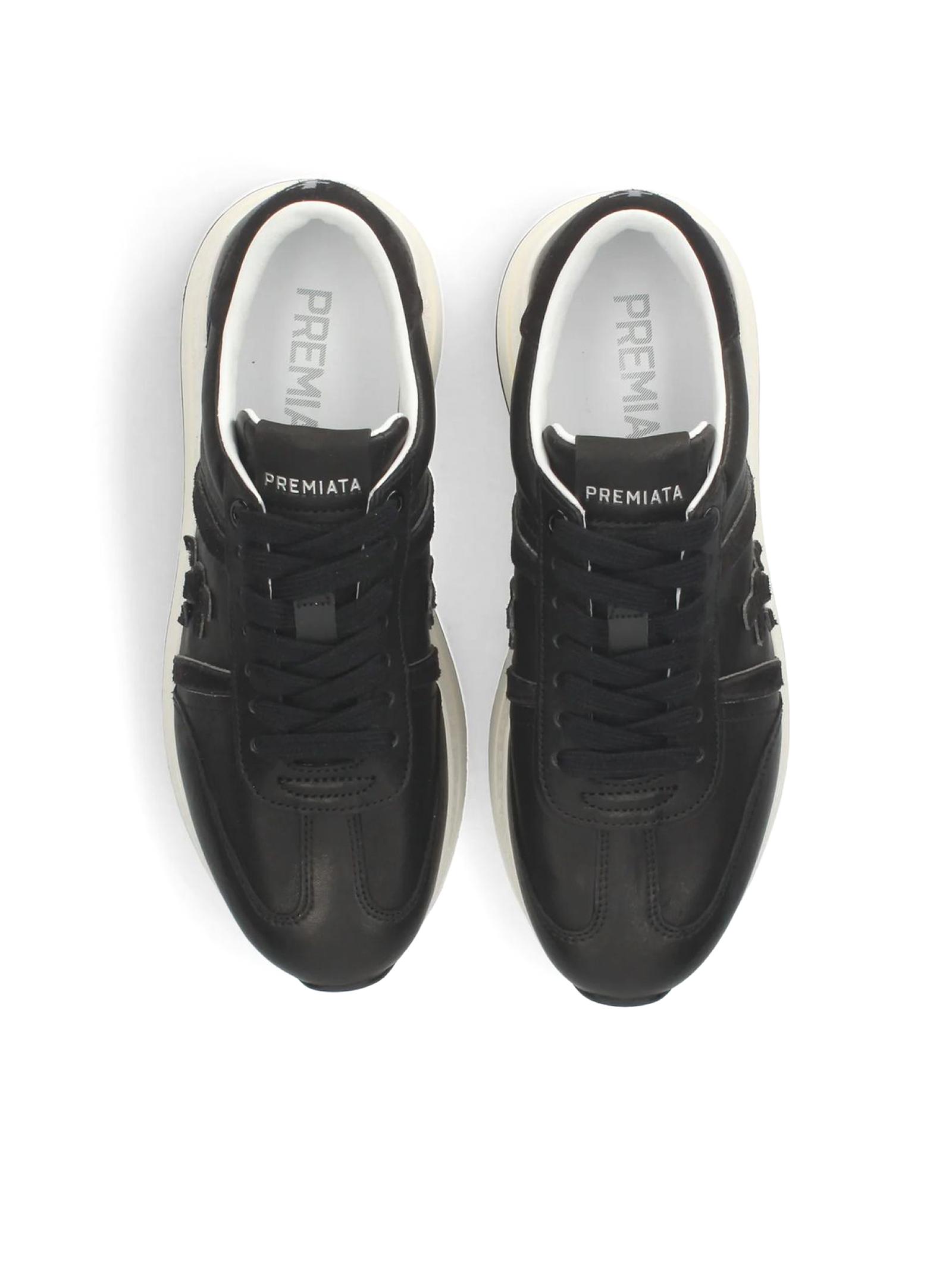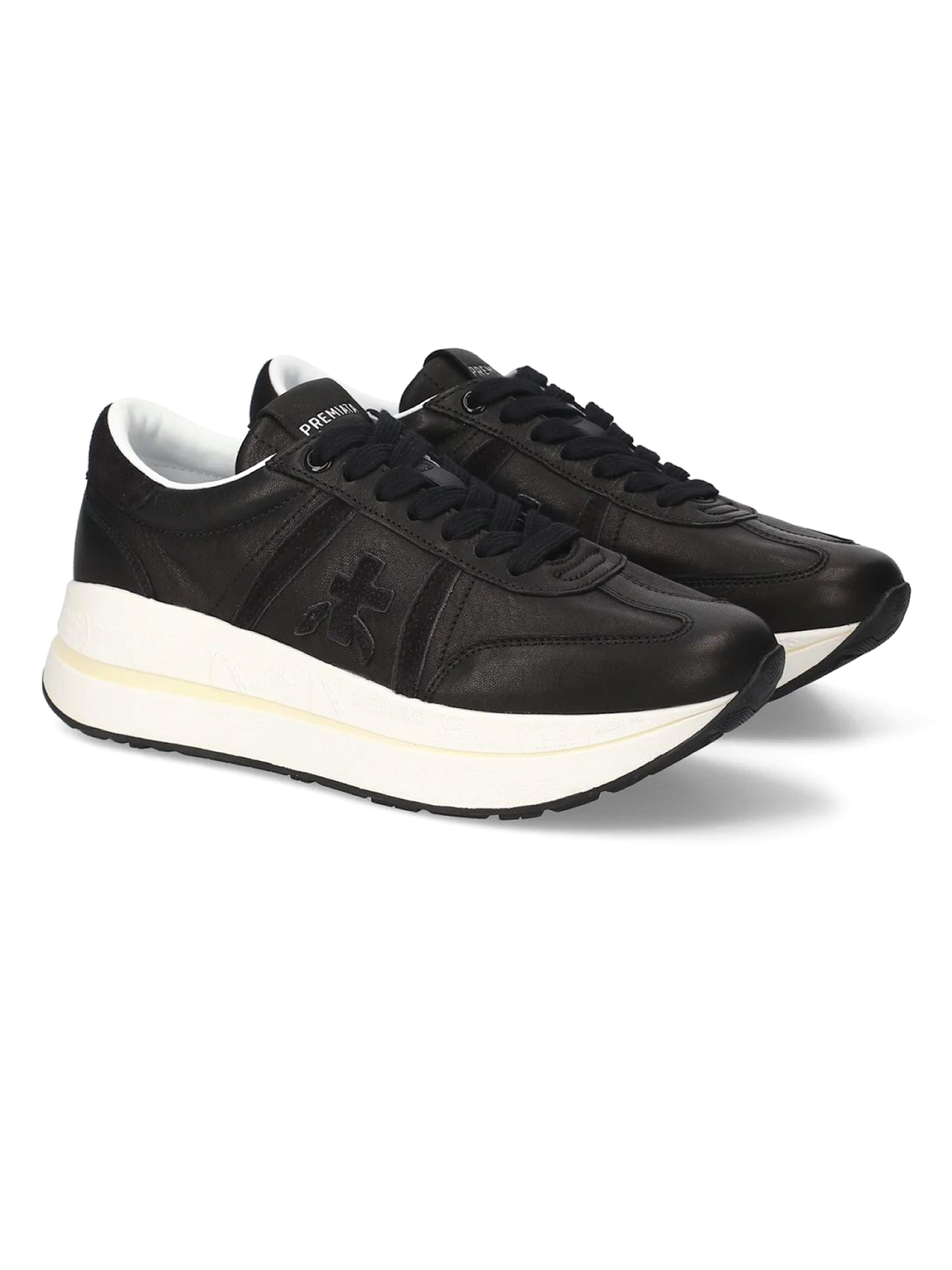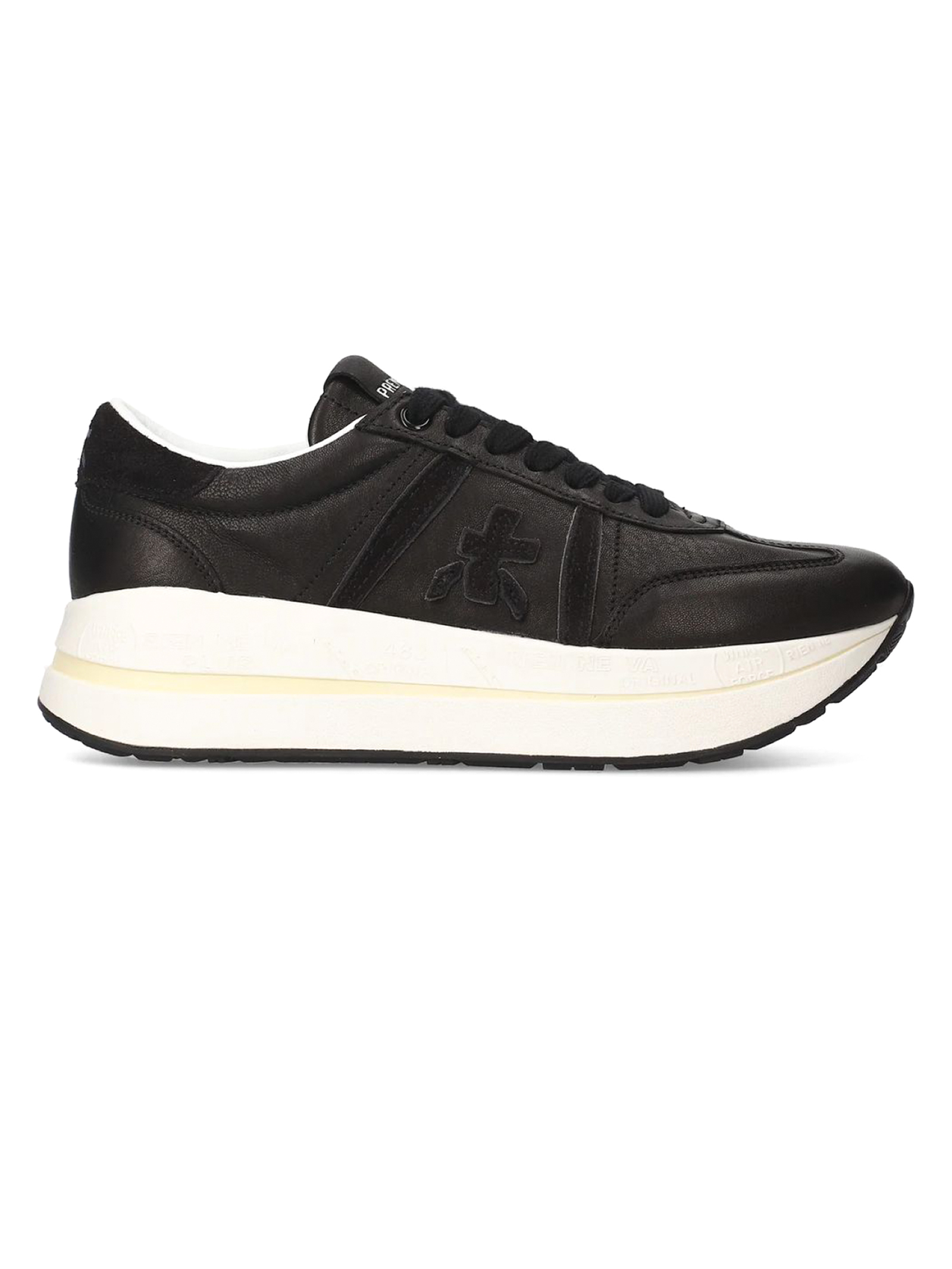 Sneakers Bethcoin in pelle nera con logo, suola con zeppa, chiusura con lacci, camoscio sul retro, occhielli decorativi, altezza suola 4 cm