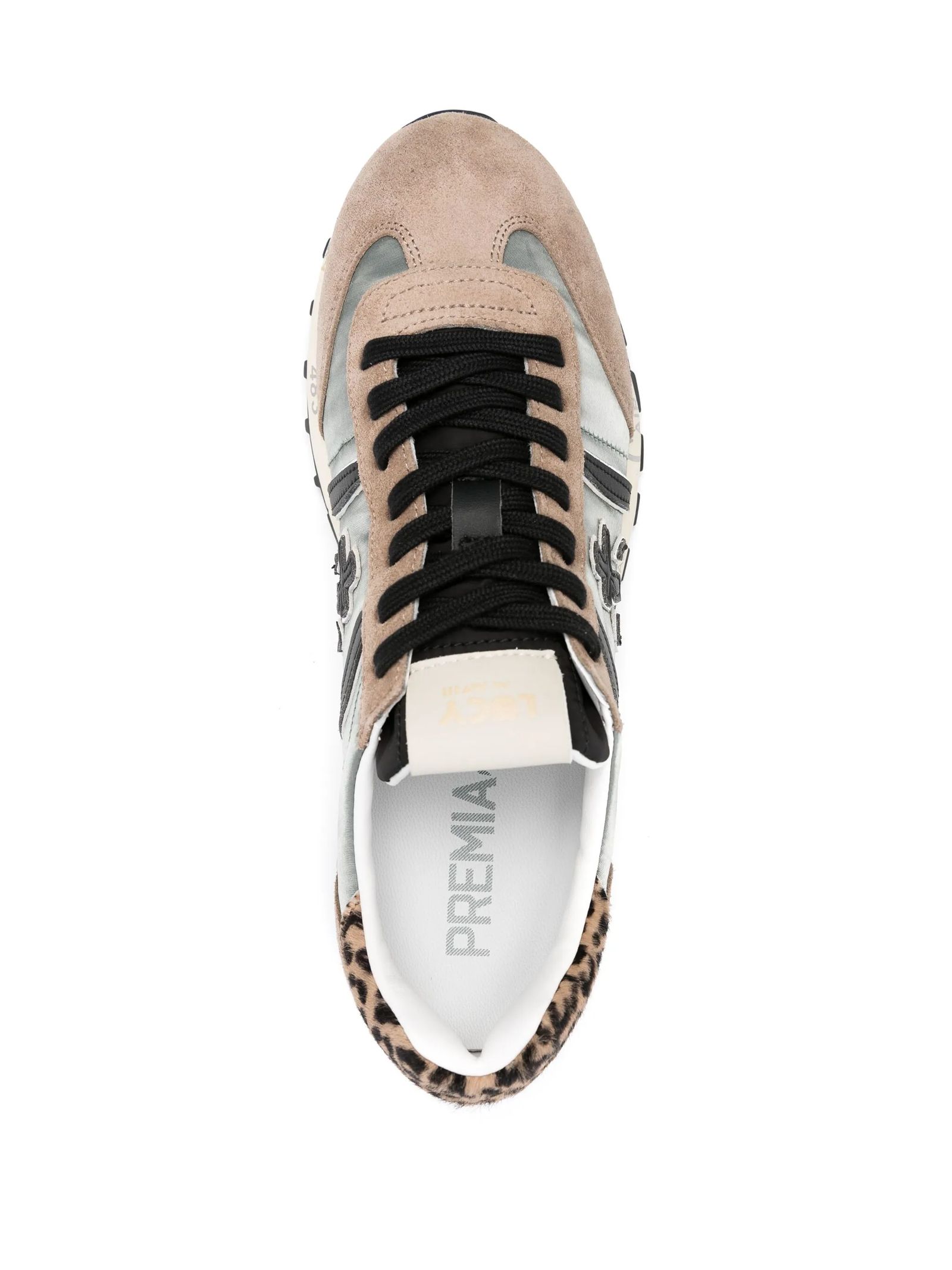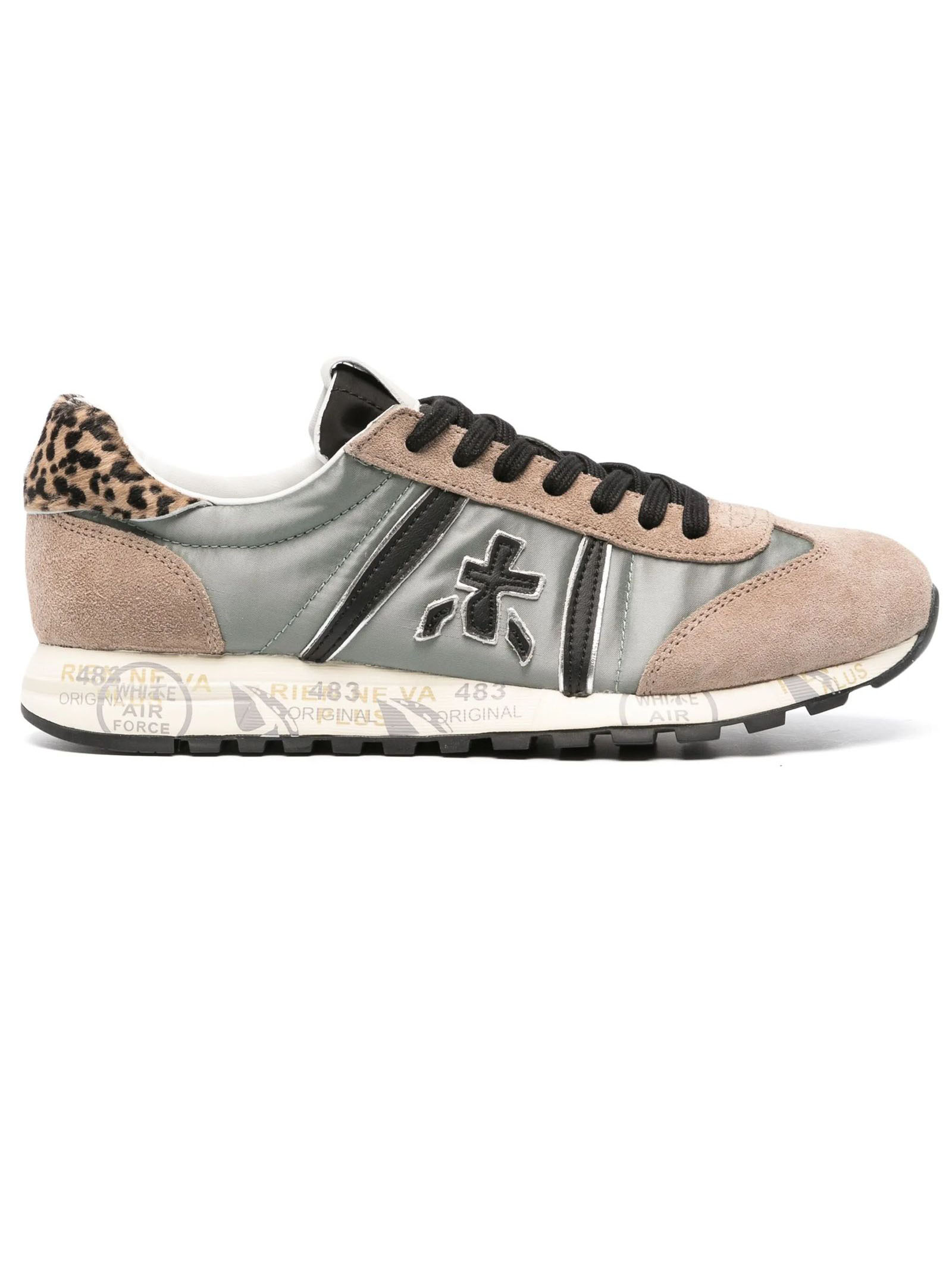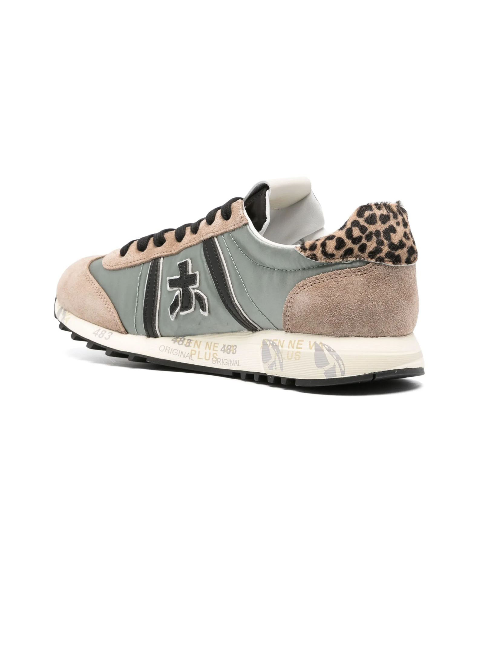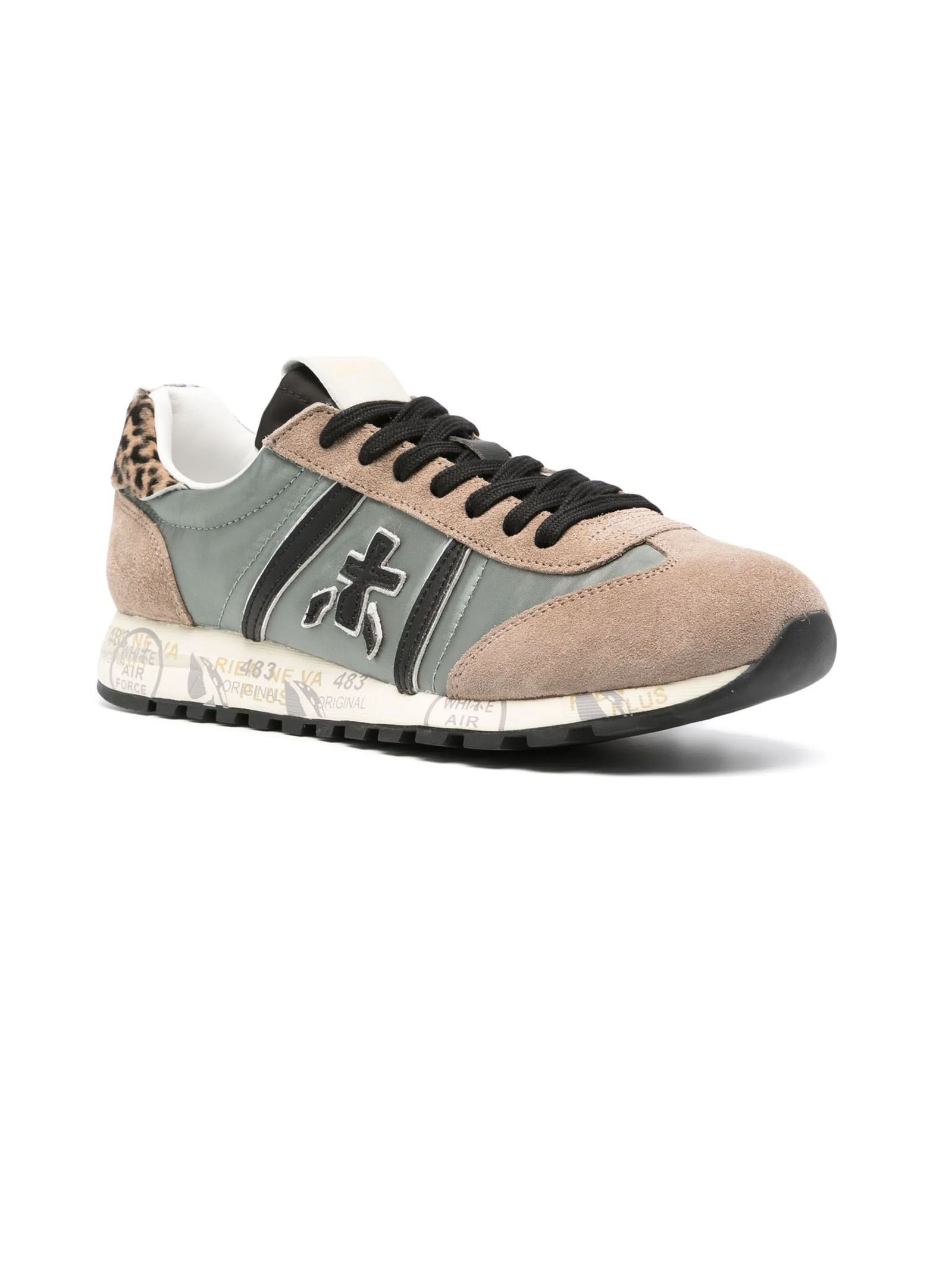 Sneakers Lucyd verde/beige, pelle scamosciata di vitello, design a inserti, chiusura frontale con lacci, rinforzo sul tallone a contrasto, inserto leopardato, imbottitura nella caviglia, applicazione sulla linguetta con logo, applicazione laterale con logo, rifinitura con effetto metallizzato laterale, punta tonda, soletta rimovibile, soletta con logo, logo sulla suola, suola piatta in gomma