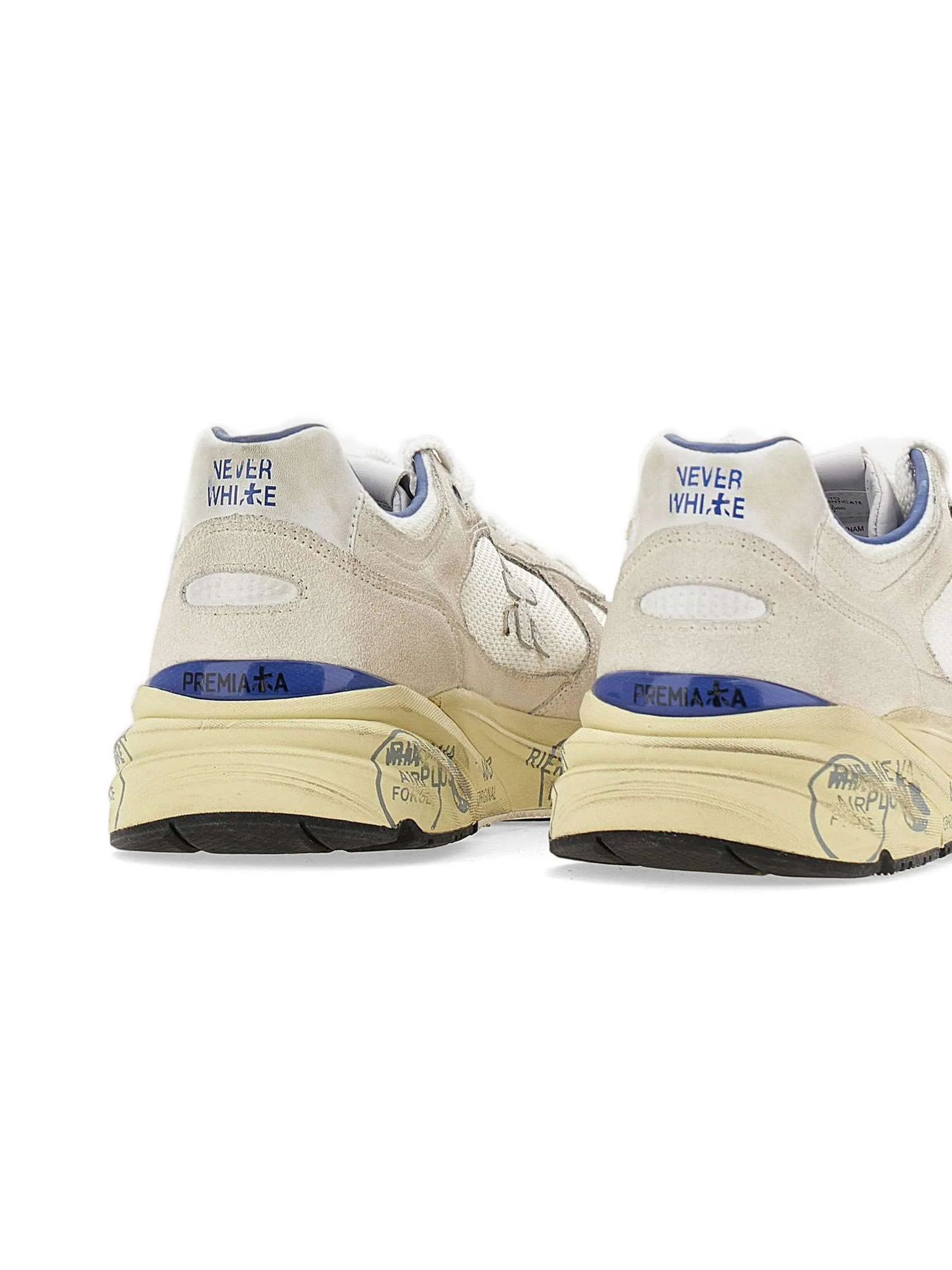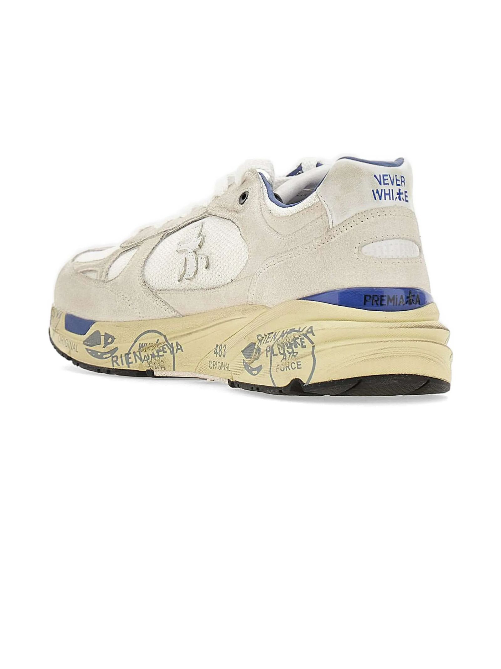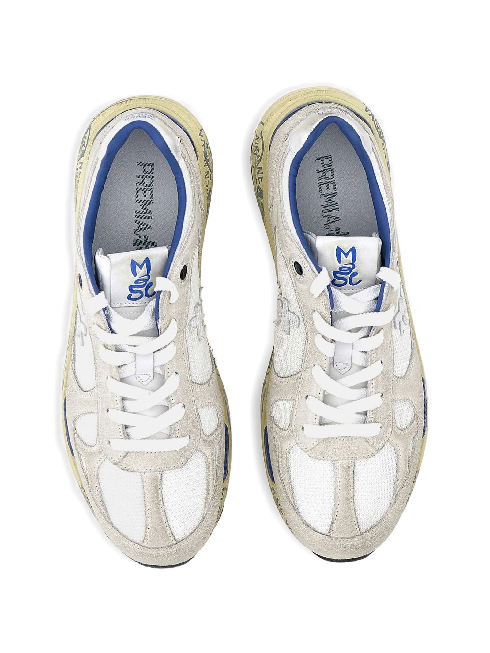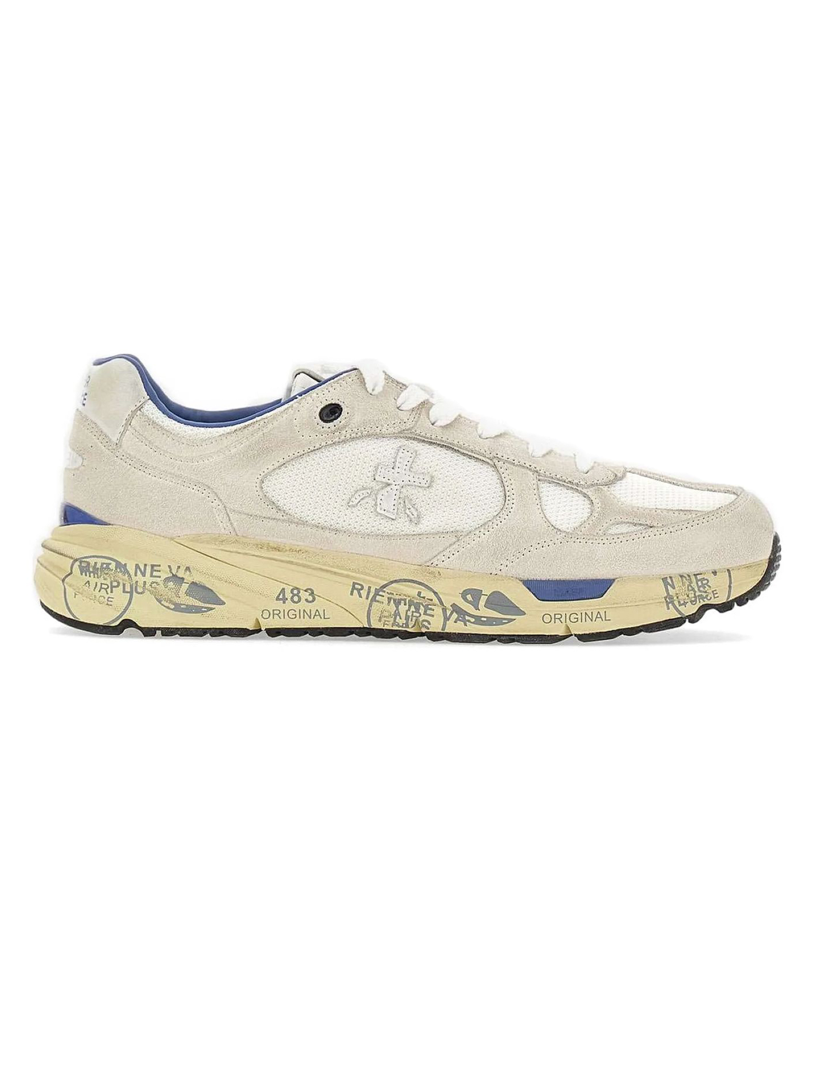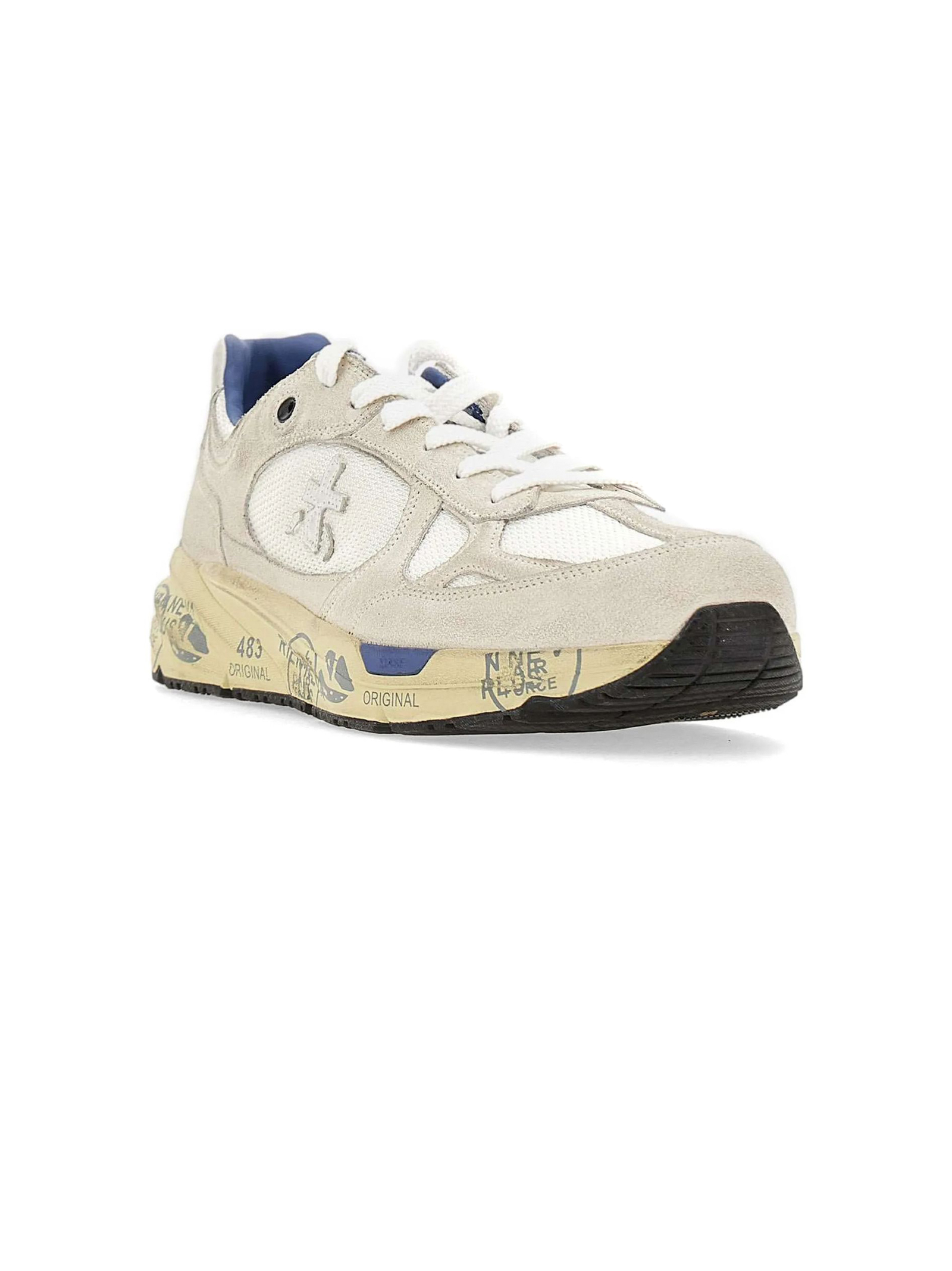 Sneakers Mase in suede e nylon bianco, rifiniture in pelle, chiusura frontale con lacci, rinforzo sul tallone a contrasto, linguetta con logo inciso, applicazione con logo, punta tonda, decorazione in cristalli, soletta con logo, fodera in pelle, suola chunky in gomma, altezza suola 3,5 cm