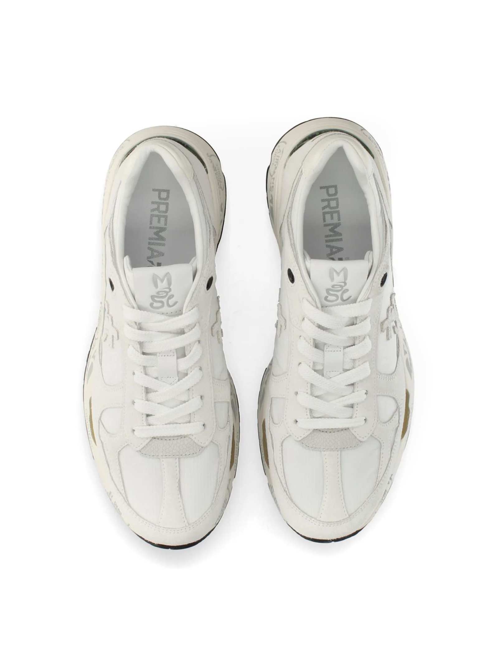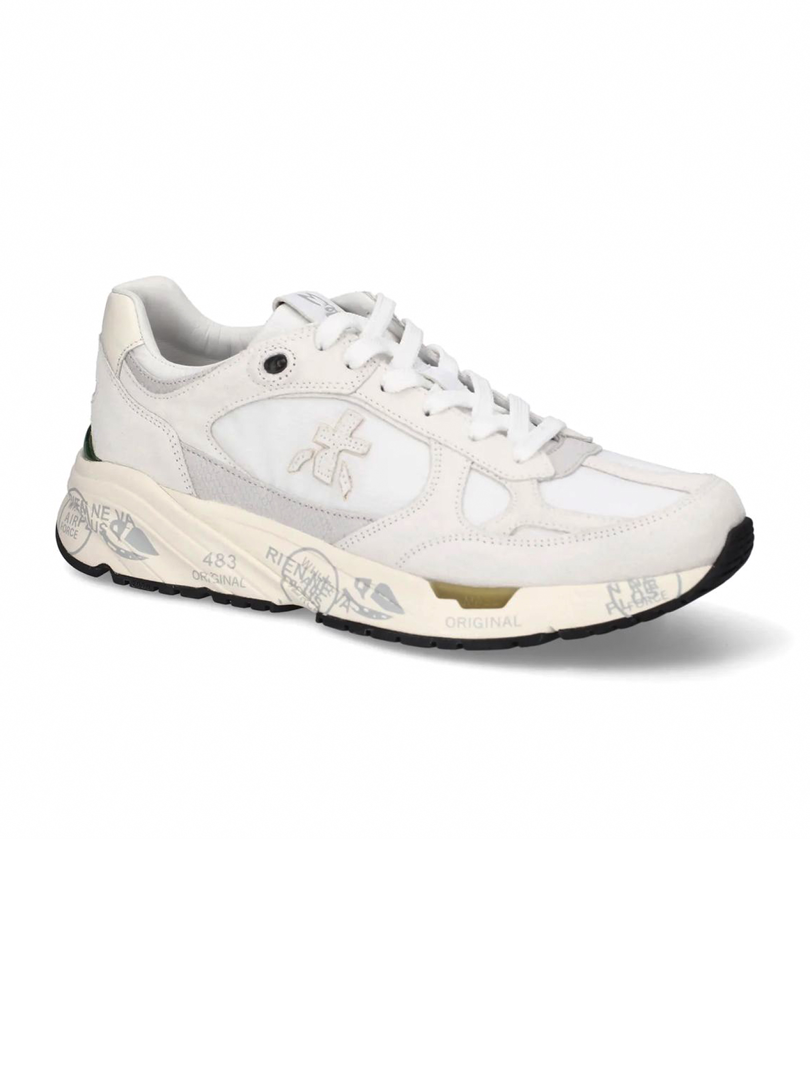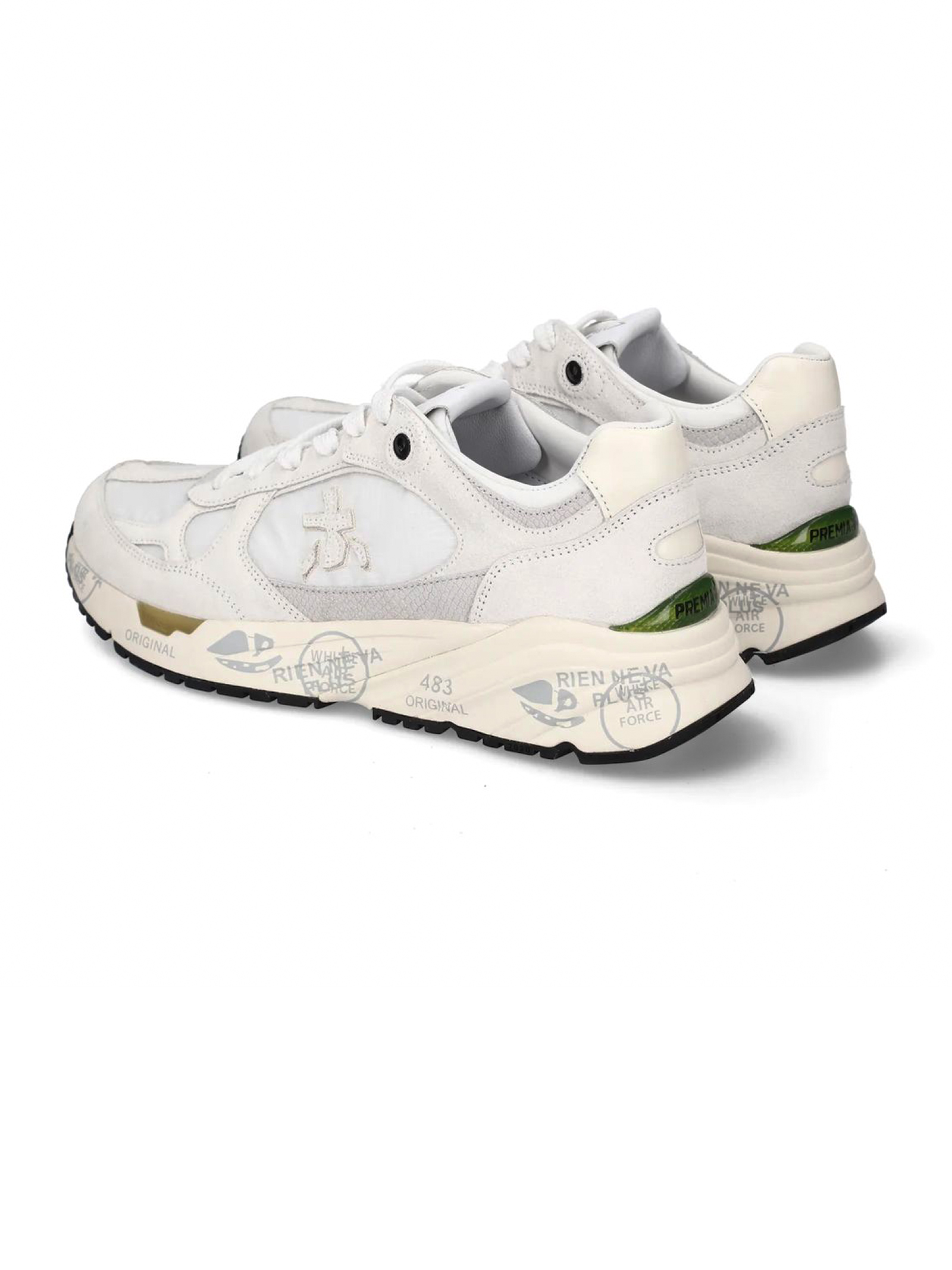 Sneakers Mase in suede e nylon bianco, rifiniture in pelle, chiusura frontale con lacci, rinforzo sul tallone a contrasto, linguetta con logo inciso, applicazione con logo, punta tonda, decorazione in cristalli, soletta con logo, fodera in pelle, suola chunky in gomma, altezza suola 3,5 cm