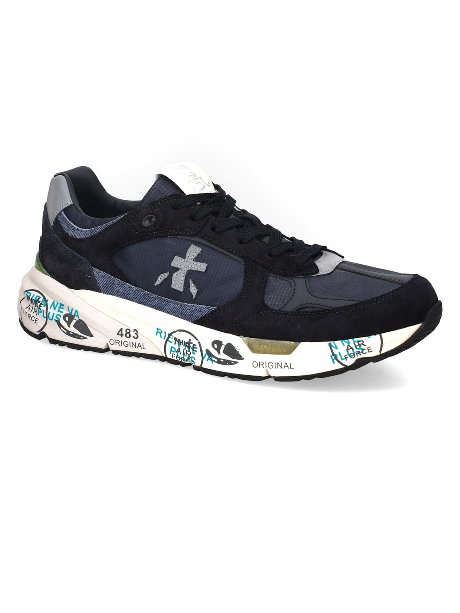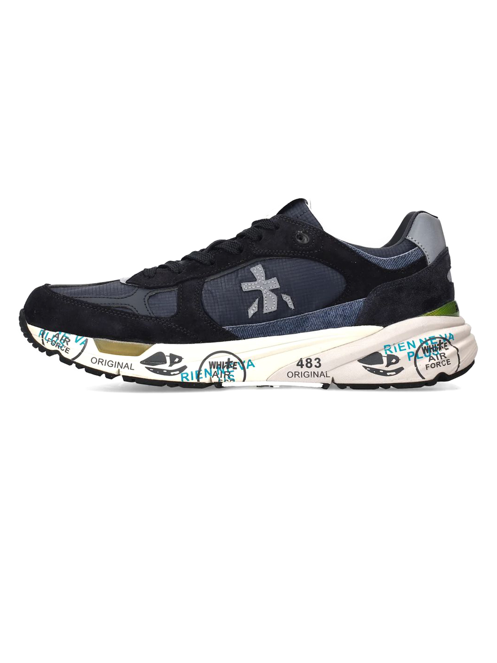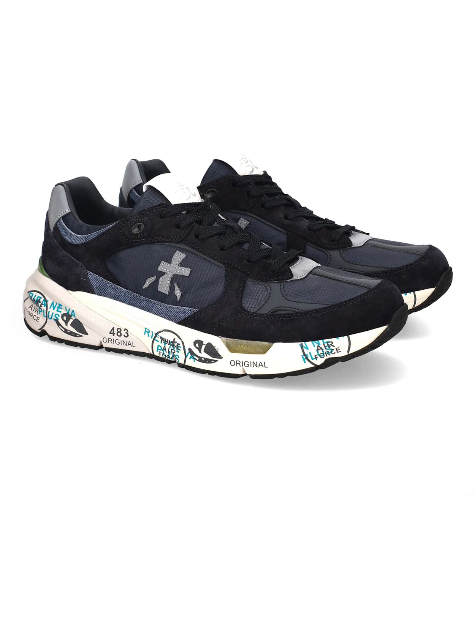 Sneakers Mase in suede e nylon blu, rifiniture in pelle, chiusura frontale con lacci, rinforzo sul tallone a contrasto, linguetta con logo inciso, applicazione con logo, punta tonda, decorazione in cristalli, soletta con logo, fodera in pelle, suola chunky in gomma, altezza suola 3,5 cm