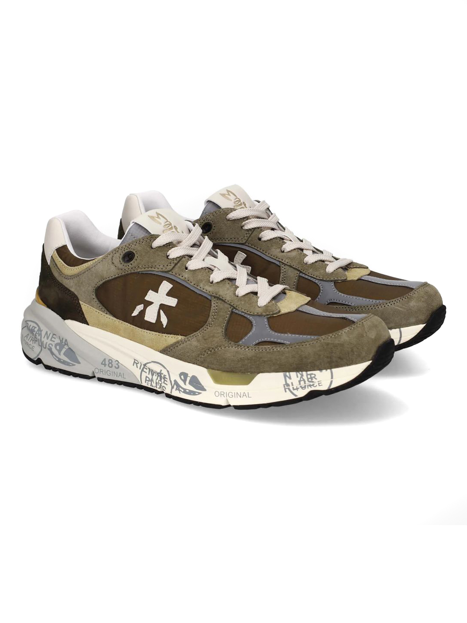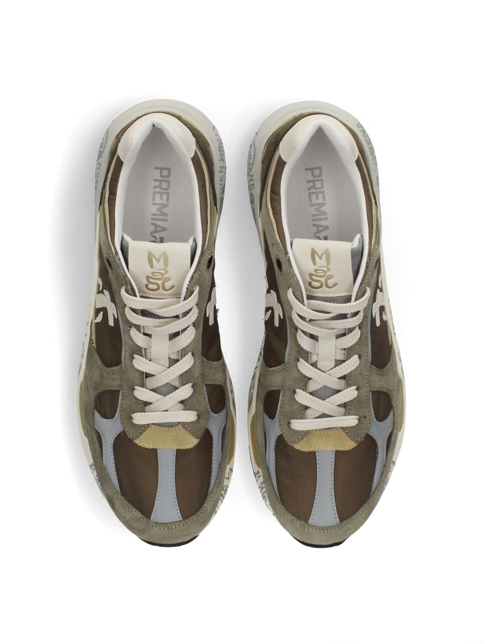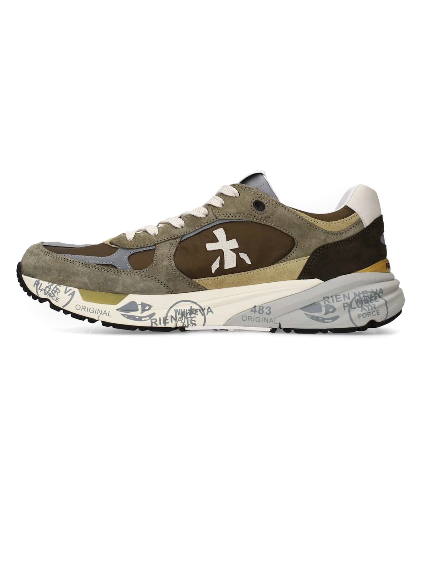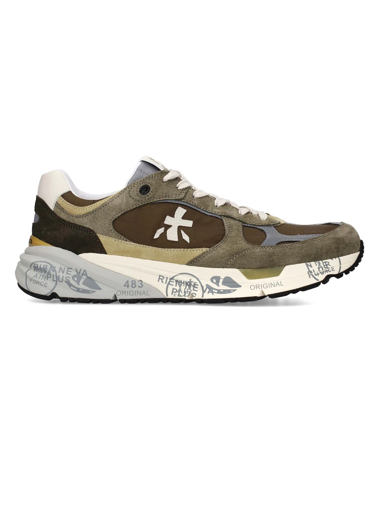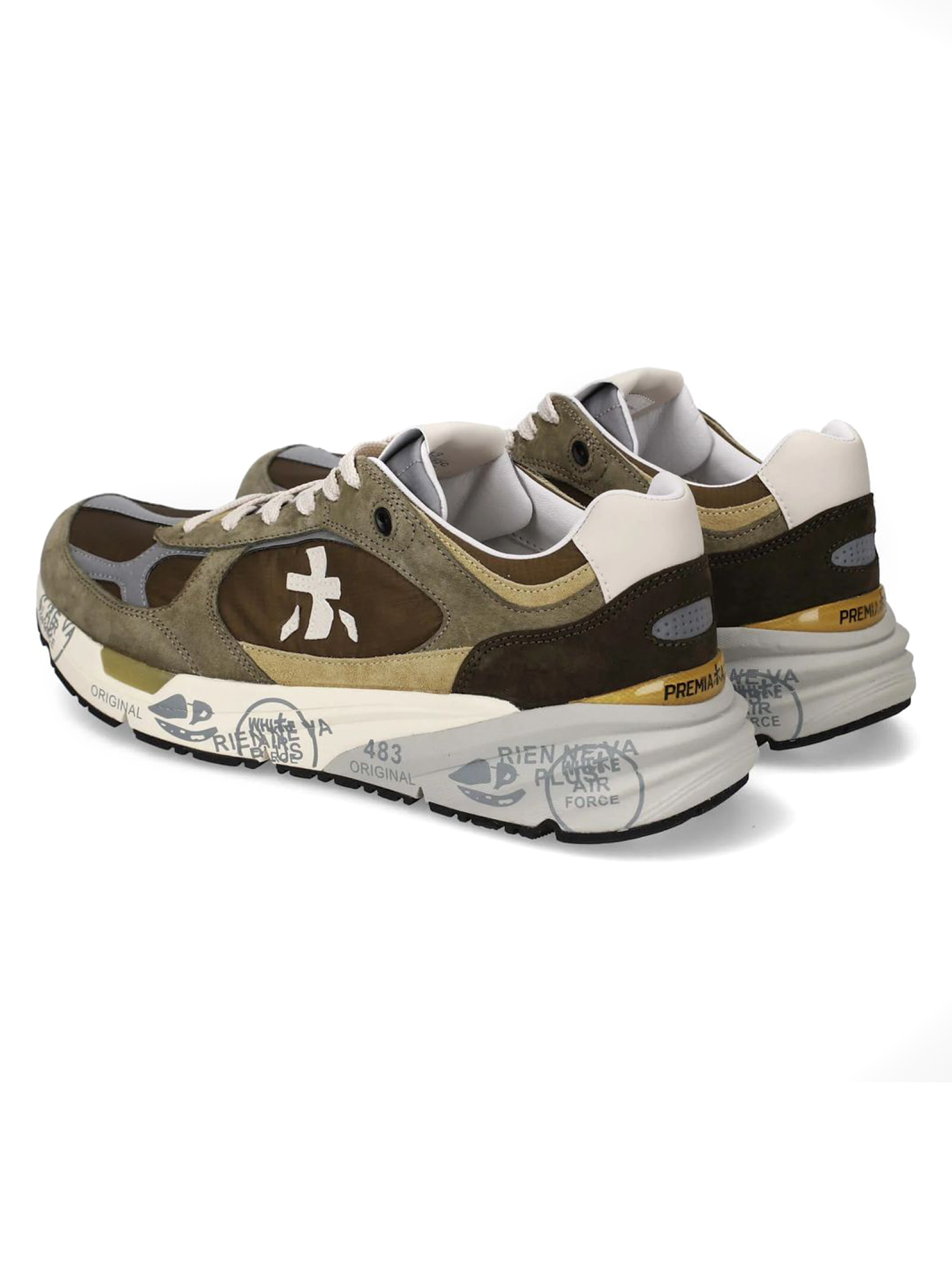 Sneakers Mase in suede e nylon verde, rifiniture in pelle, chiusura frontale con lacci, rinforzo sul tallone a contrasto, linguetta con logo inciso, applicazione con logo, punta tonda, soletta con logo, fodera in pelle, suola chunky in gomma, altezza suola 3,5 cm