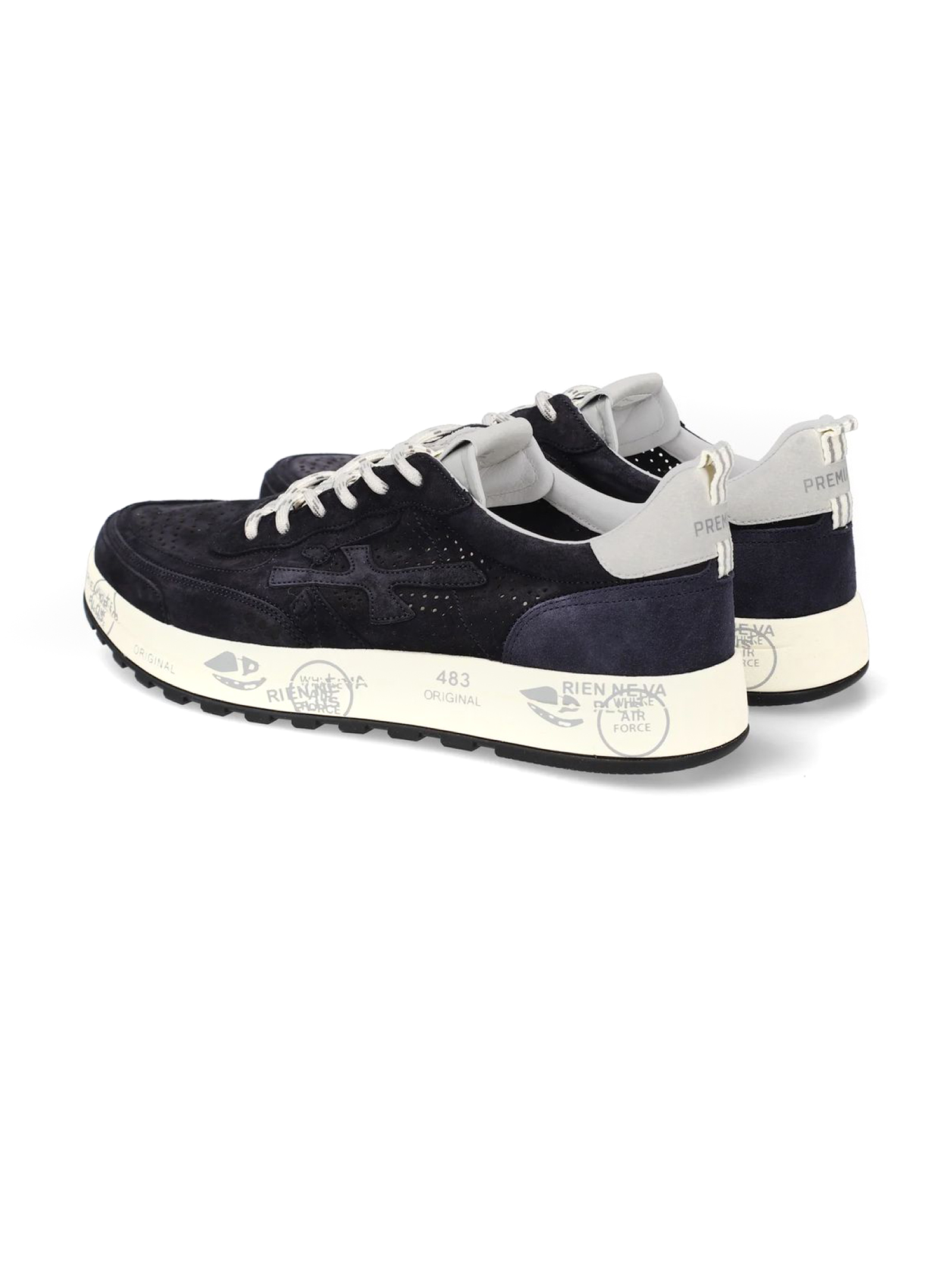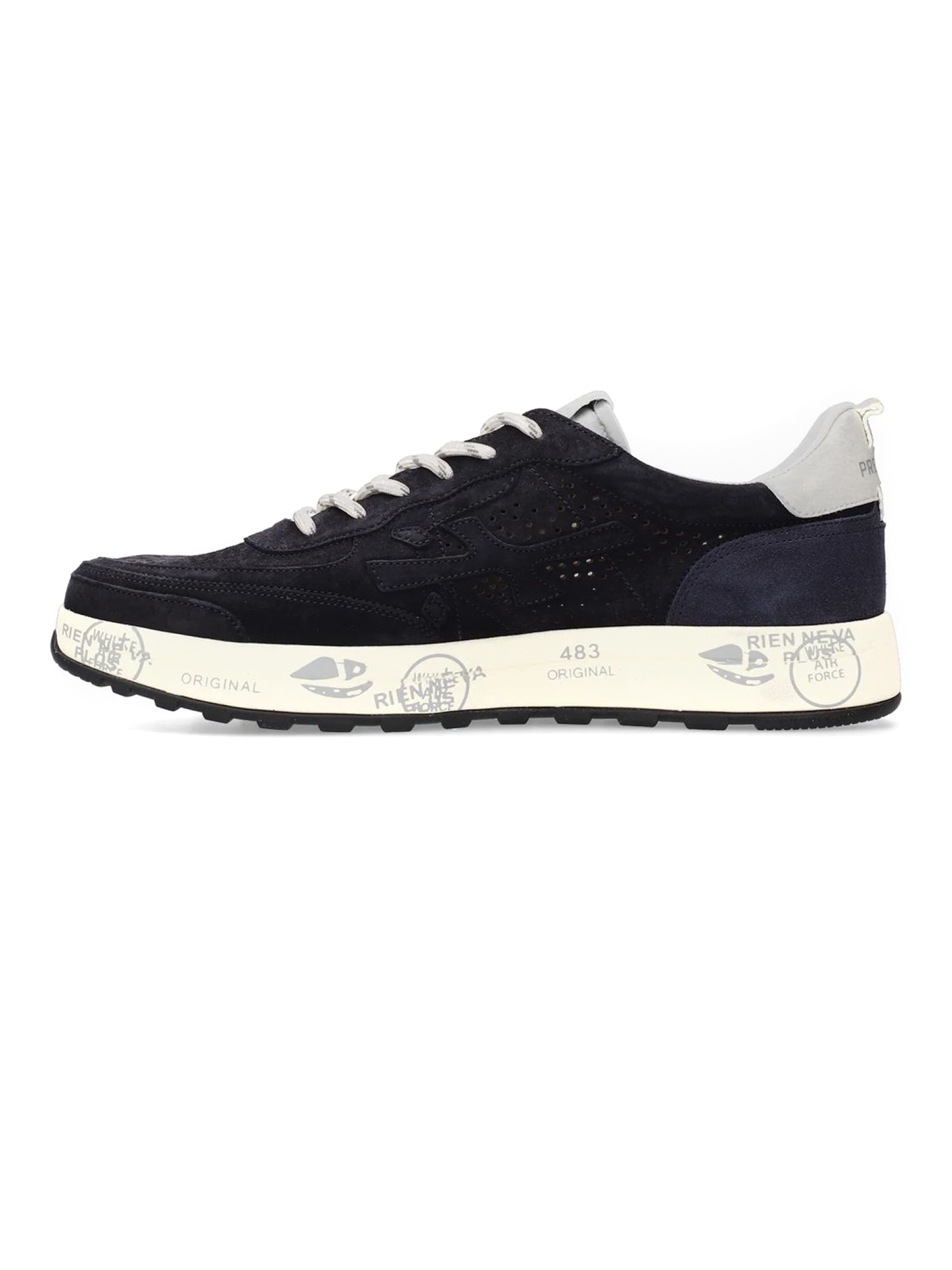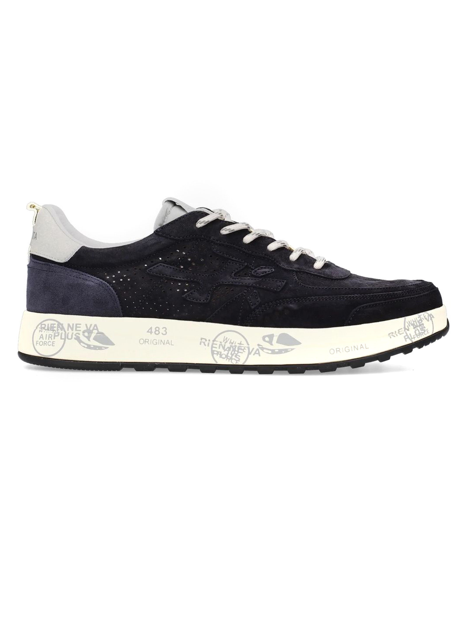 Sneakers Nous in camoscio blu con dettaglio traforato, chiusura frontale con lacci, rinforzo sul tallone a contrasto, linguetta con logo inciso, applicazione con logo, punta tonda, soletta con logo, fodera in pelle, suola chunky in gomma, altezza suola 3,5 cm