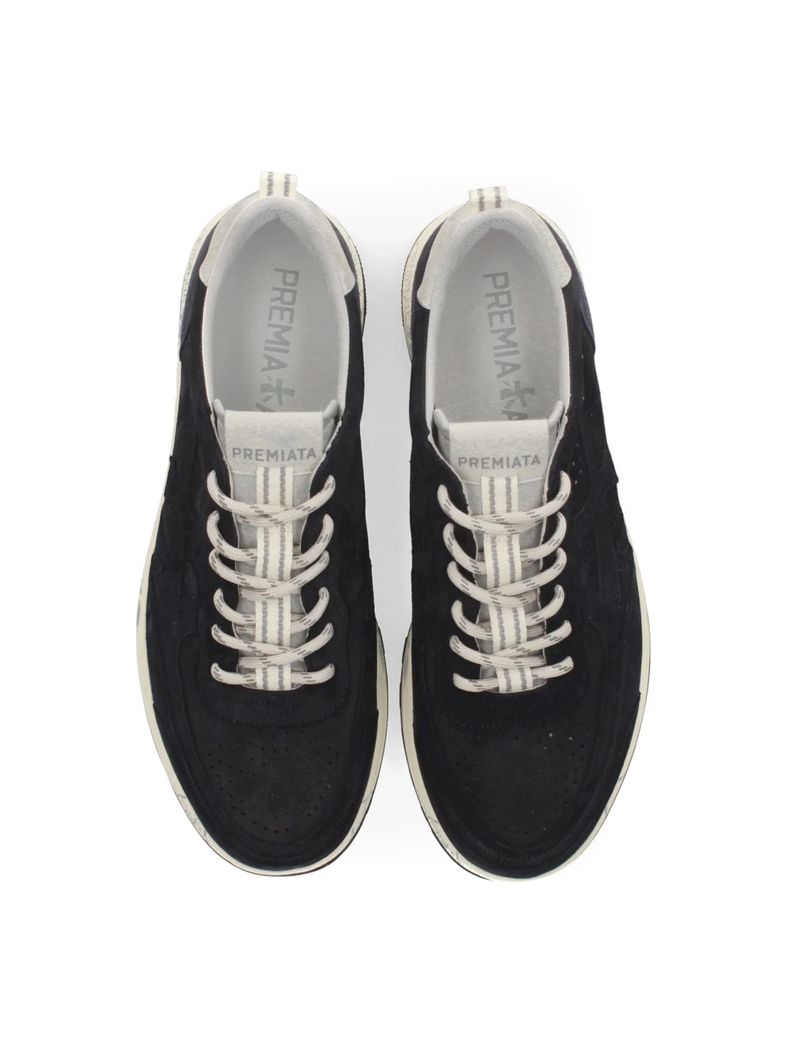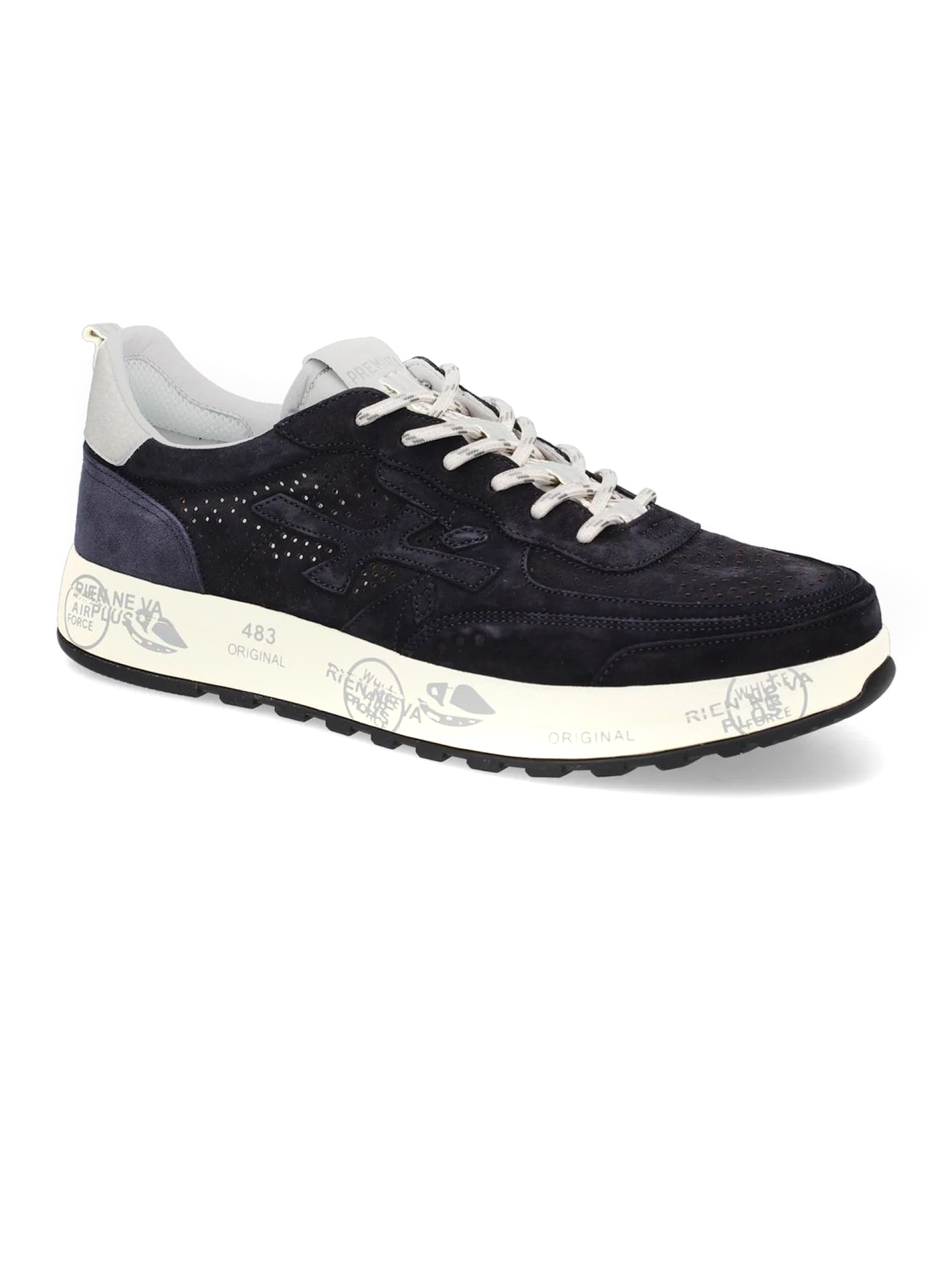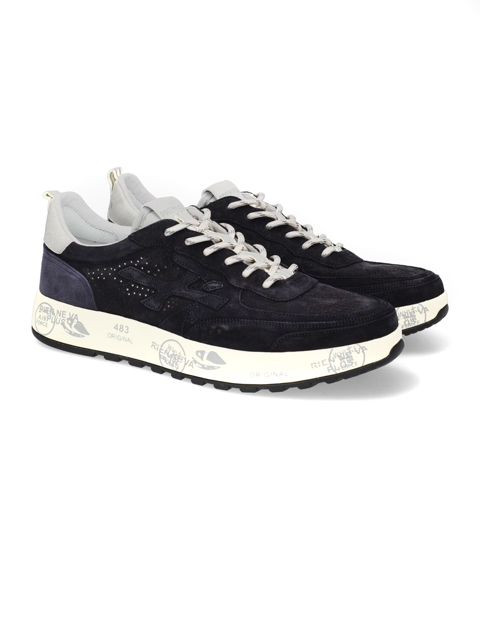 Sneakers Nous in camoscio blu con dettaglio traforato, chiusura frontale con lacci, rinforzo sul tallone a contrasto, linguetta con logo inciso, applicazione con logo, punta tonda, soletta con logo, fodera in pelle, suola chunky in gomma, altezza suola 3,5 cm