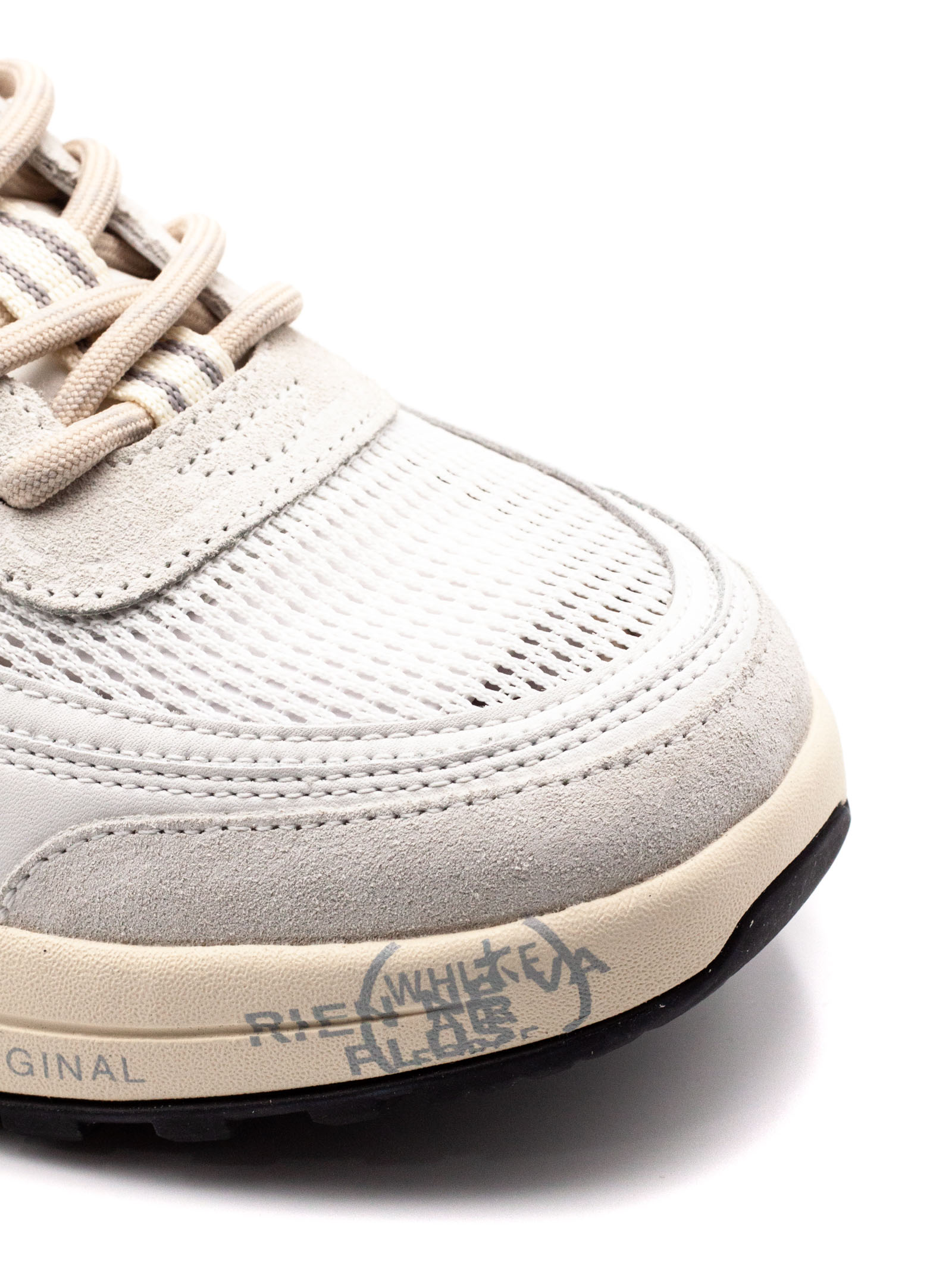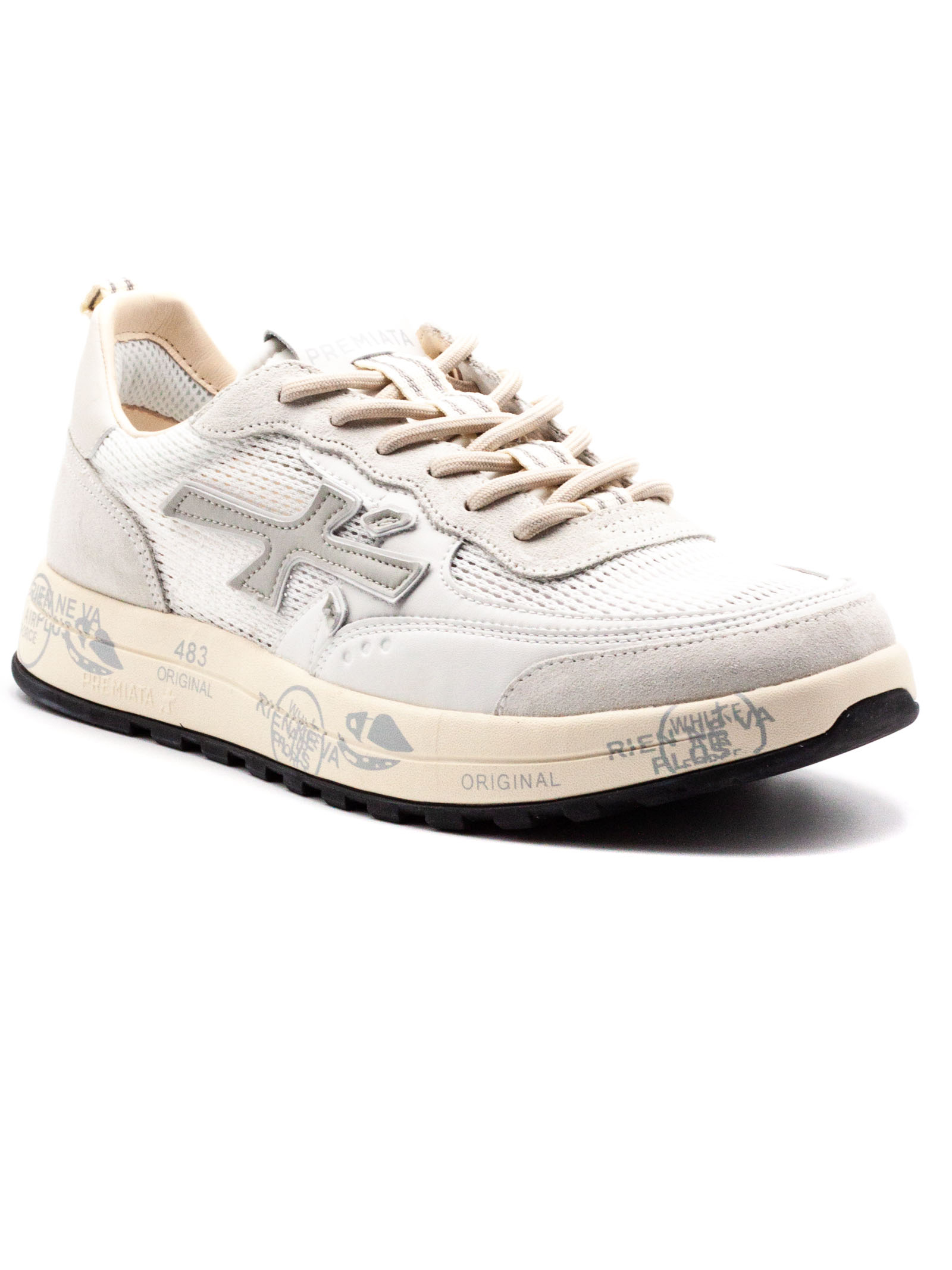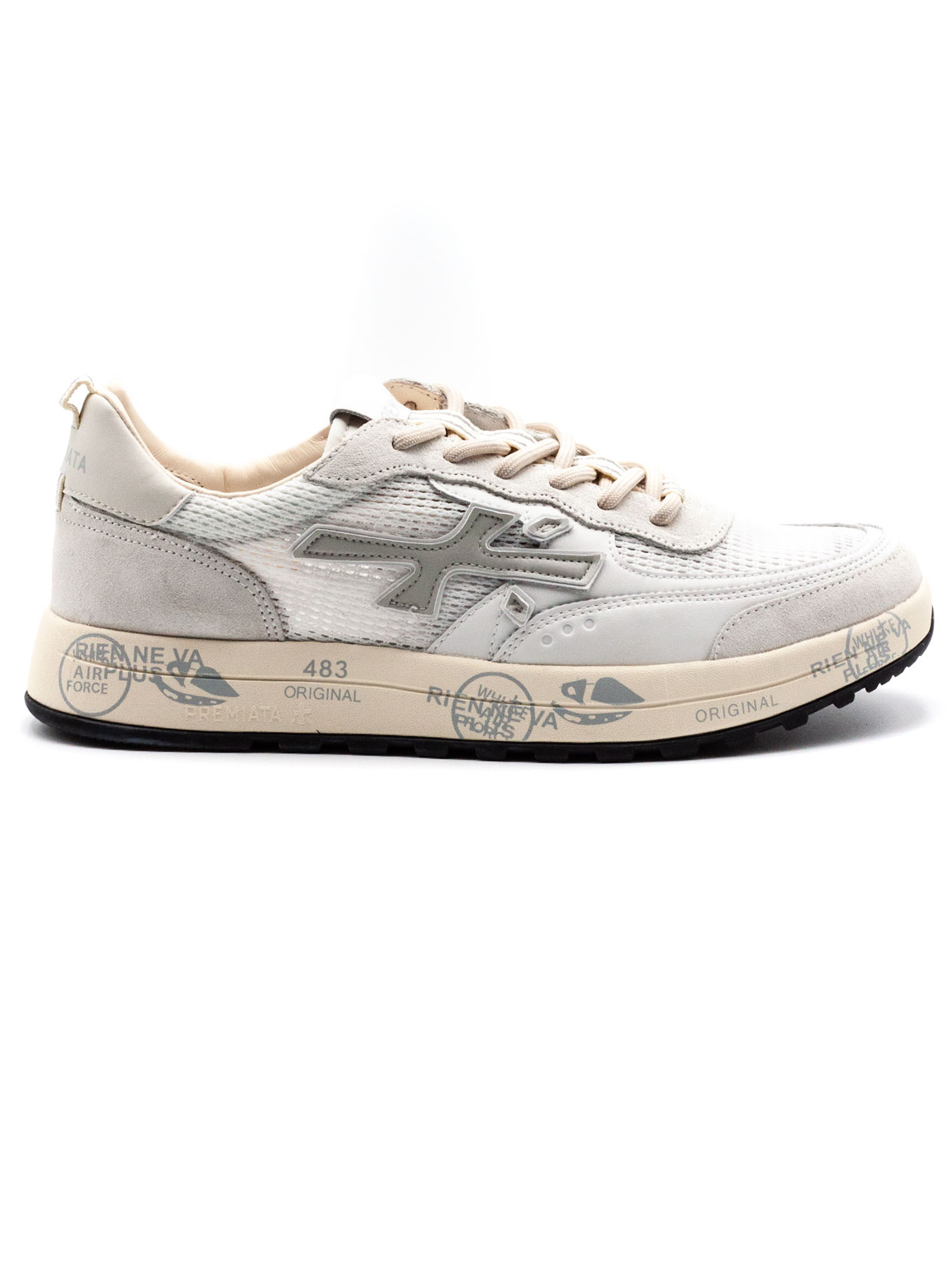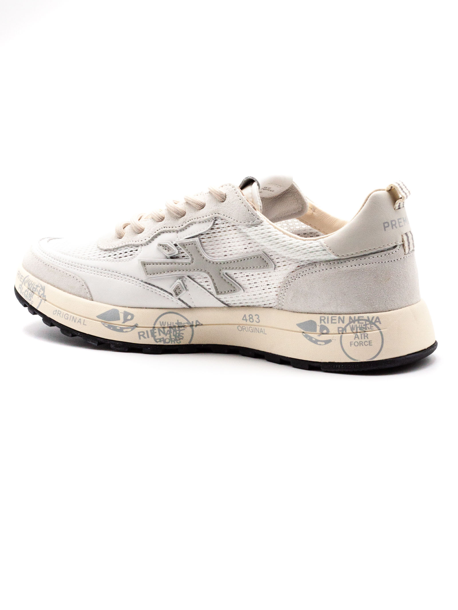 Sneakers Nous in pelle bianca con dettaglio traforato, chiusura frontale con lacci, rinforzo sul tallone a contrasto, linguetta con logo inciso, applicazione con logo, punta tonda, soletta con logo, fodera in pelle, suola chunky in gomma, altezza suola 3,5 cm