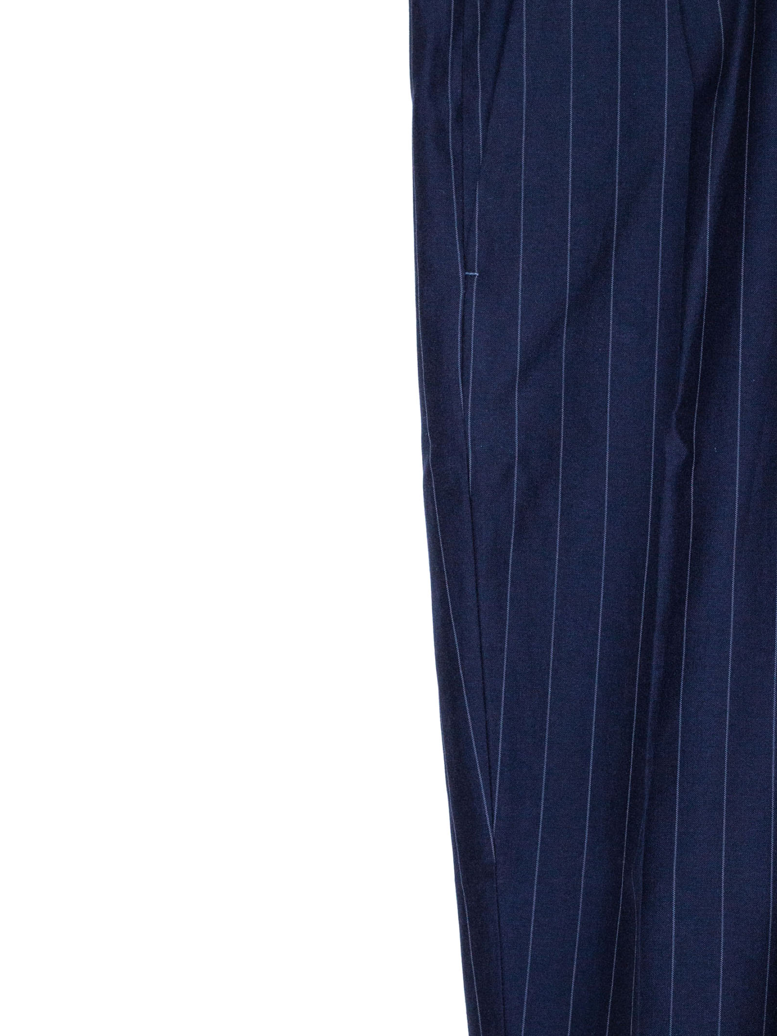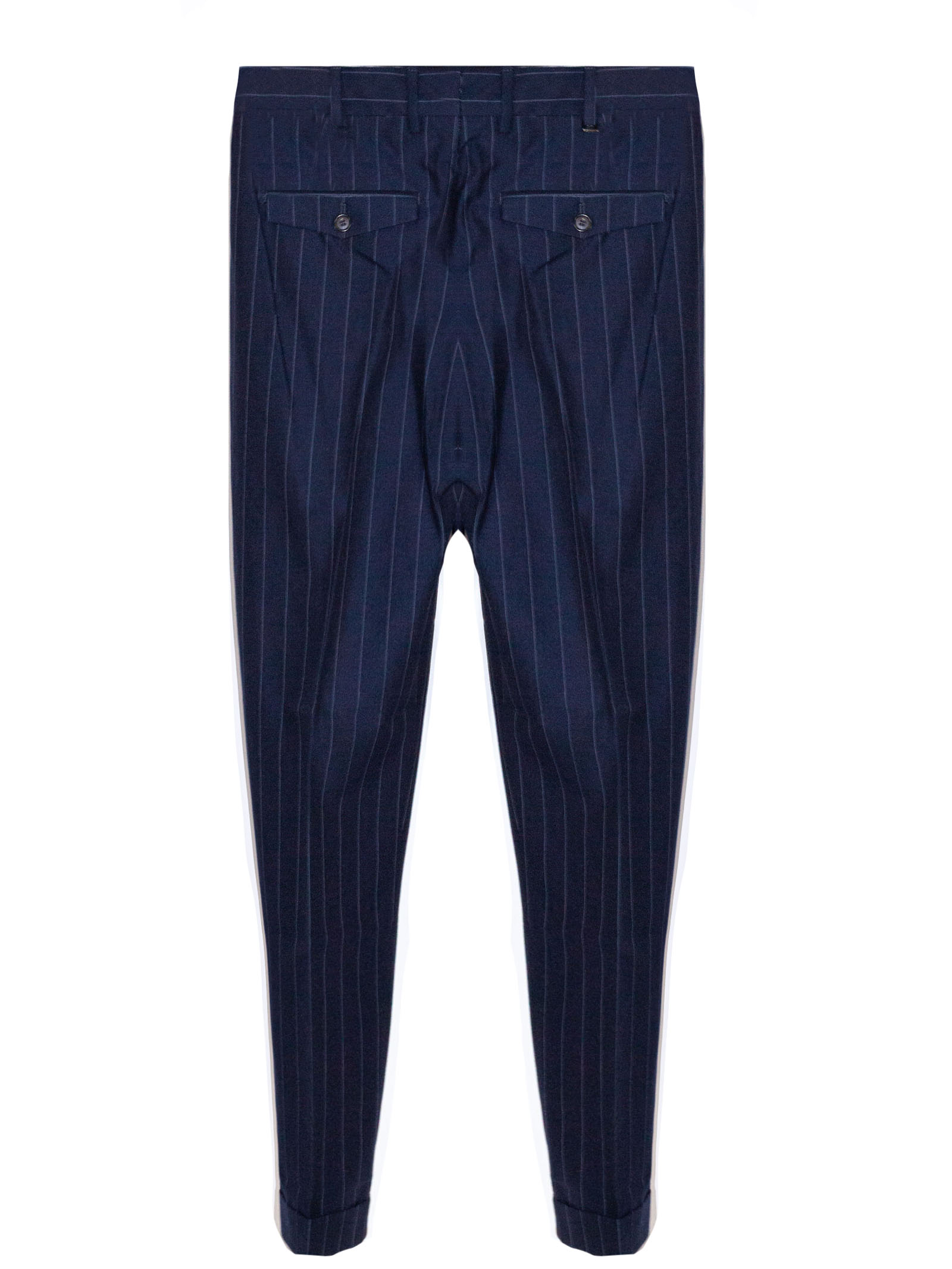 Pantalone blu navy a righe sottili, taglio sartoriale con pince frontali, vita con passanti, chiusura con zip e bottone, tasche laterali e posteriori, fondo con risvolto, vestibilità affusolata, tessuto misto cotone e lana vergine