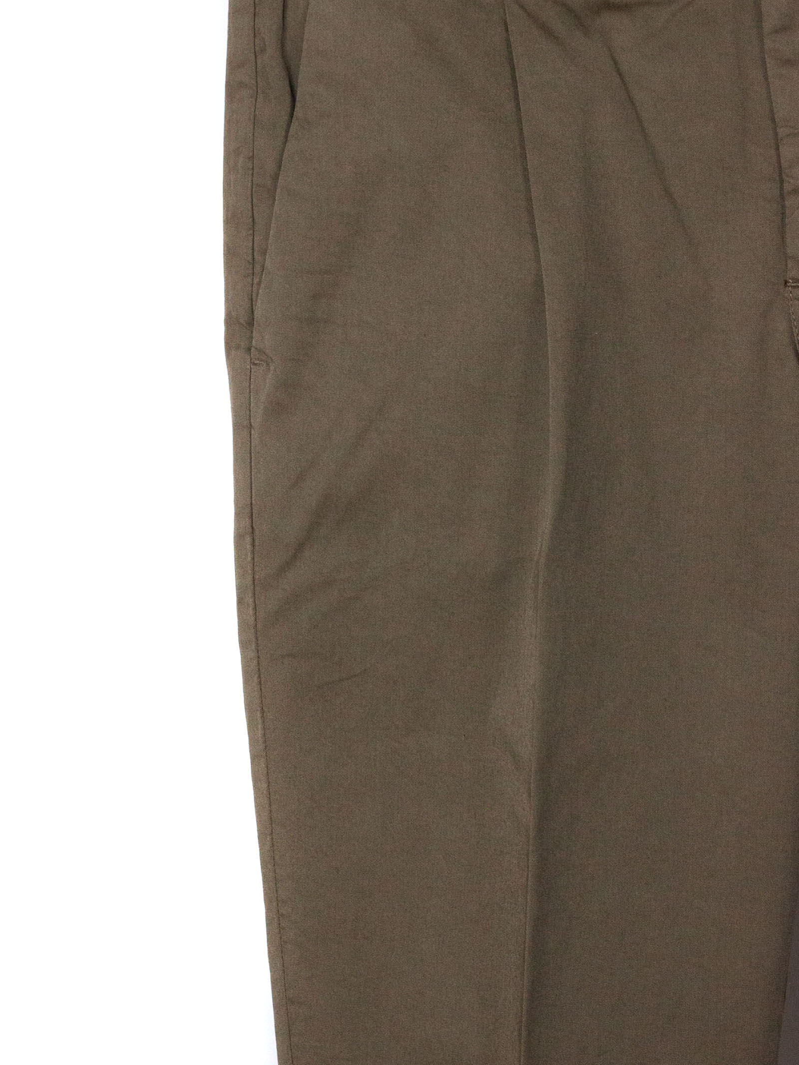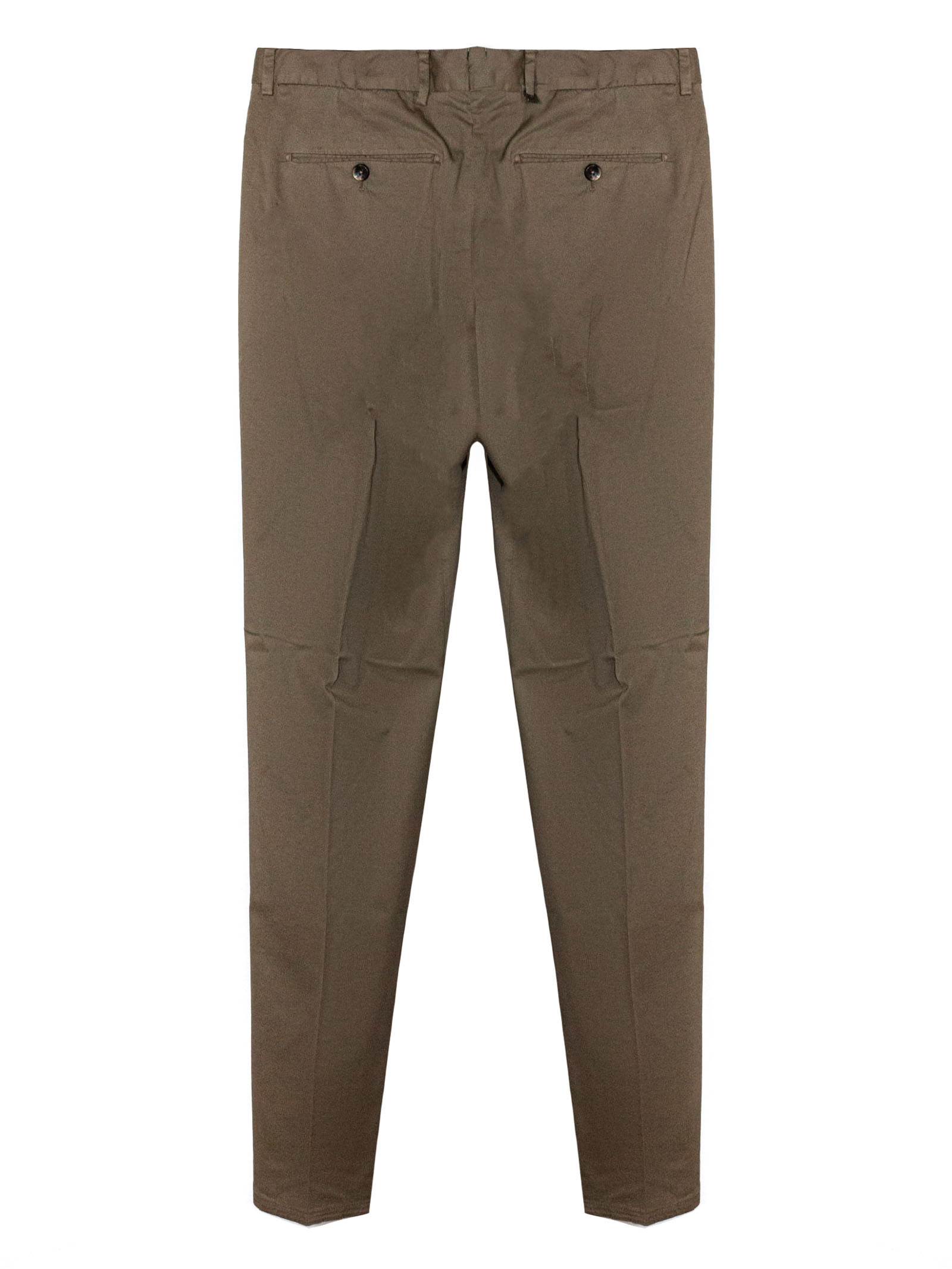 Pantalone in cotone beige con design elegante e versatile, vita regolare con passanti per cintura, chiusura frontale con bottone e zip nascosta, taglio slim con linea affusolata, pieghe frontali, tasche laterali oblique, tasche posteriori a filetto