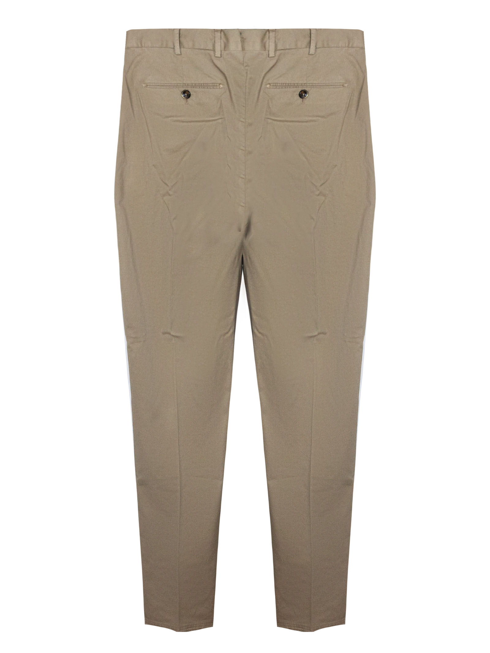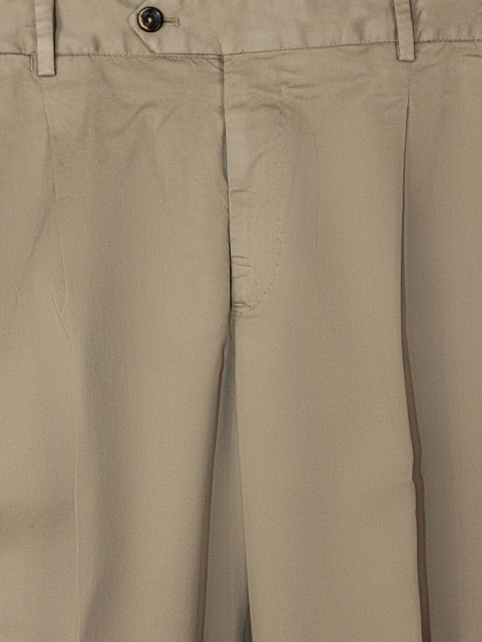 Pantalone in cotone nocciola con design elegante e versatile, vita regolare con passanti per cintura, chiusura frontale con bottone e zip nascosta, taglio slim con linea affusolata, pieghe frontali, tasche laterali oblique, tasche posteriori a filetto