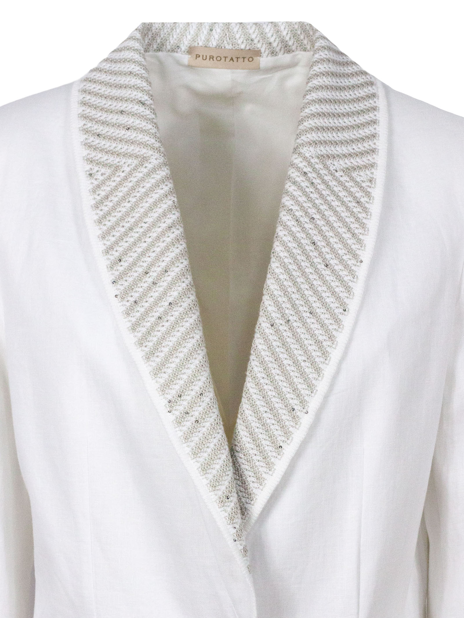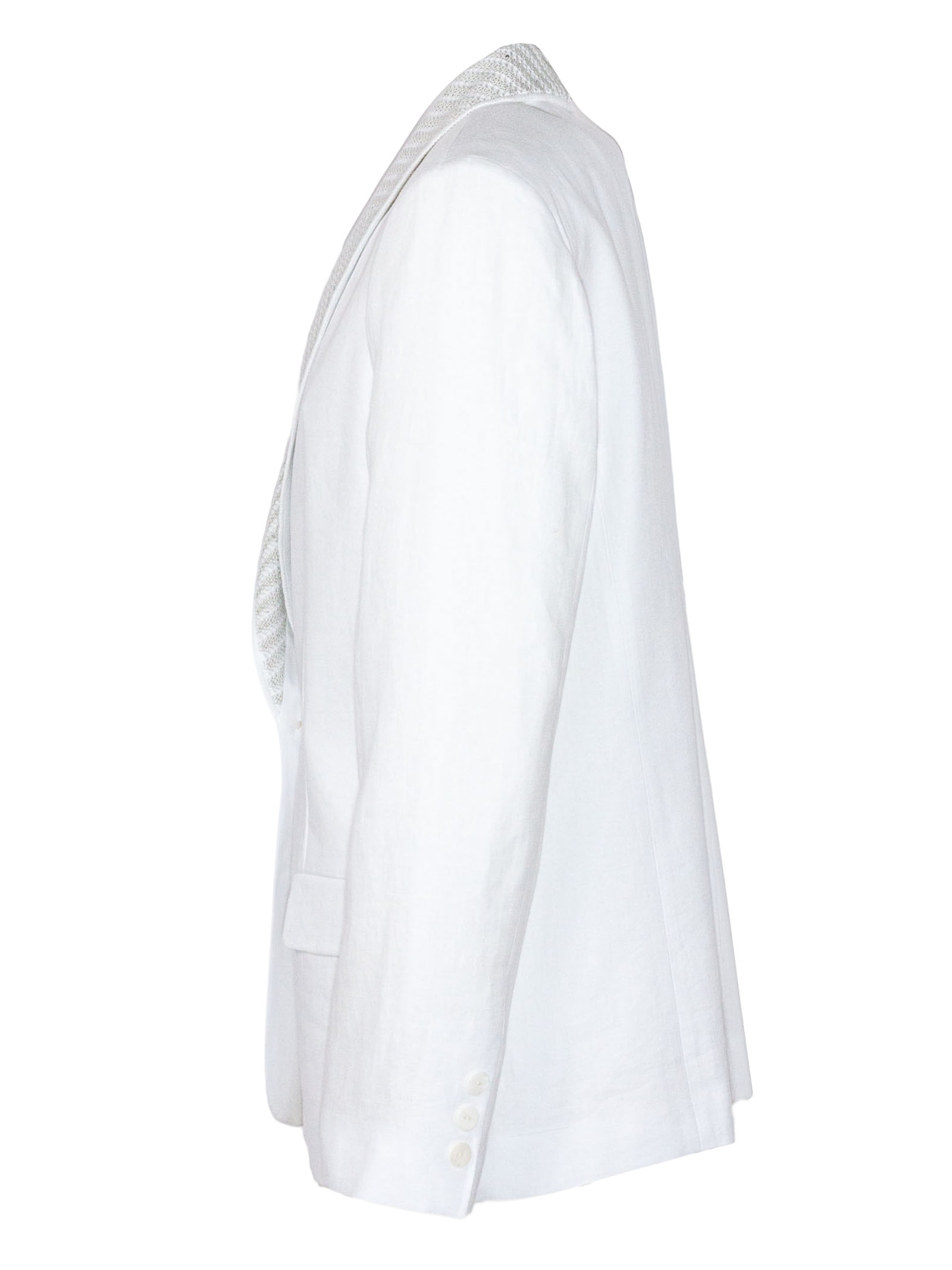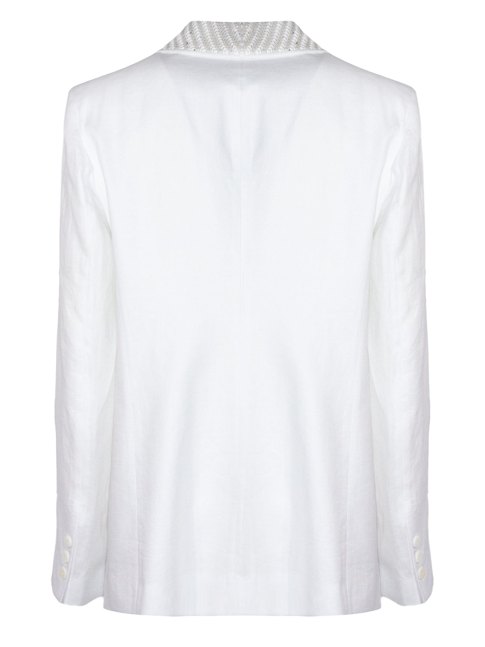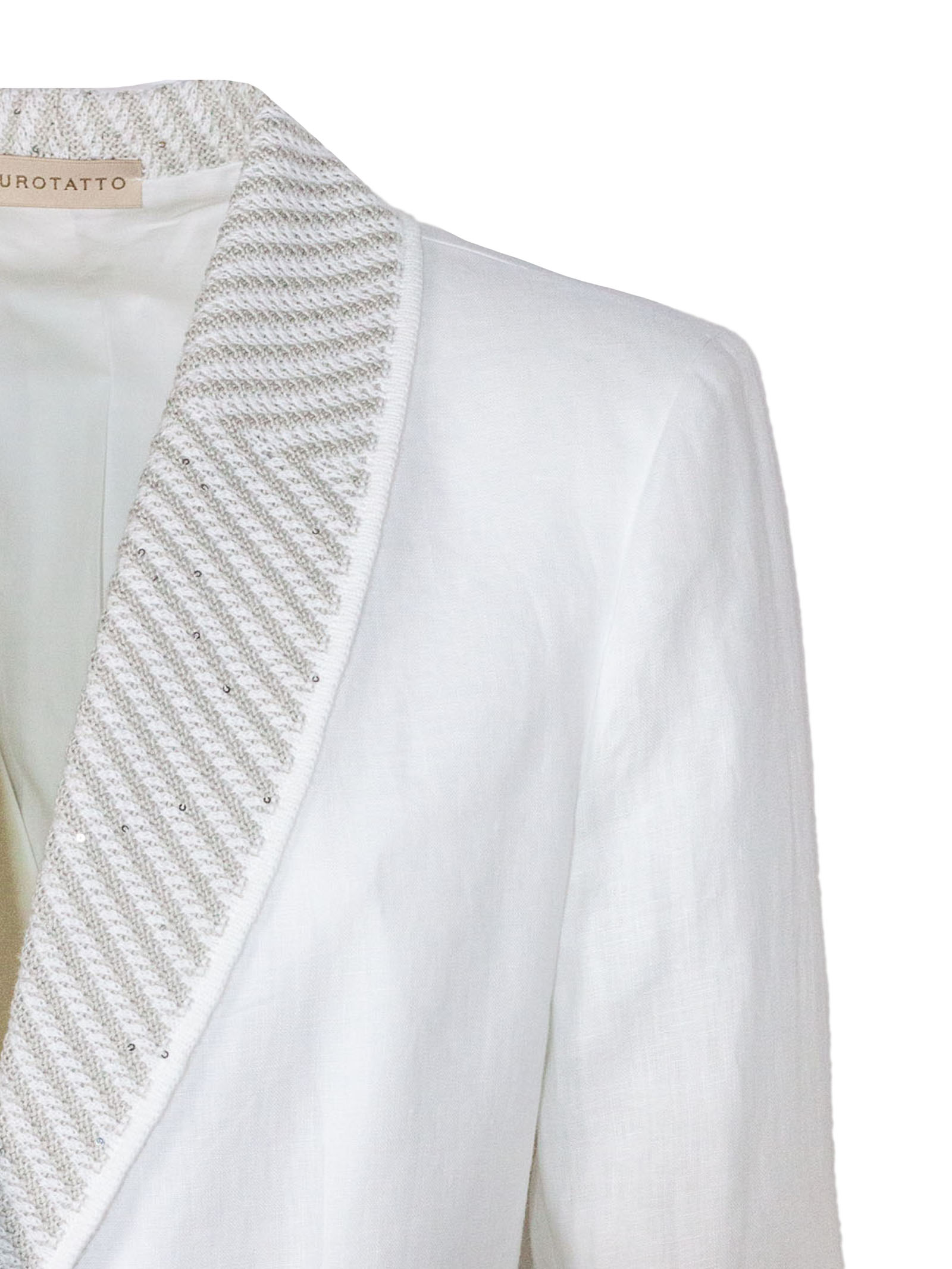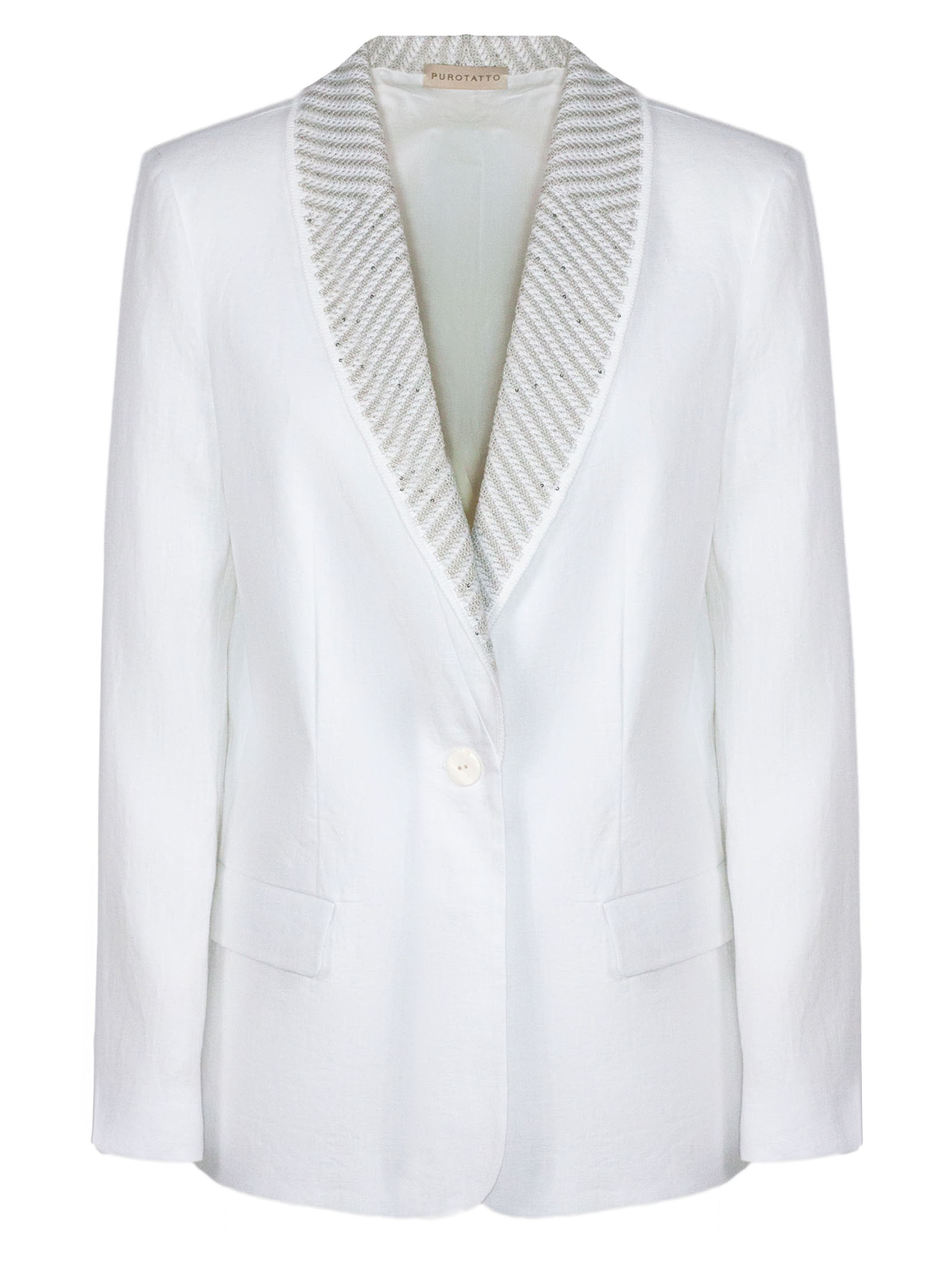 Blazer bianco monopetto in lino, linea sartoriale, chiusura a un bottone, rever ampio con ricamo luminoso, tasche con patta, tessuto leggero, vestibilità regolare