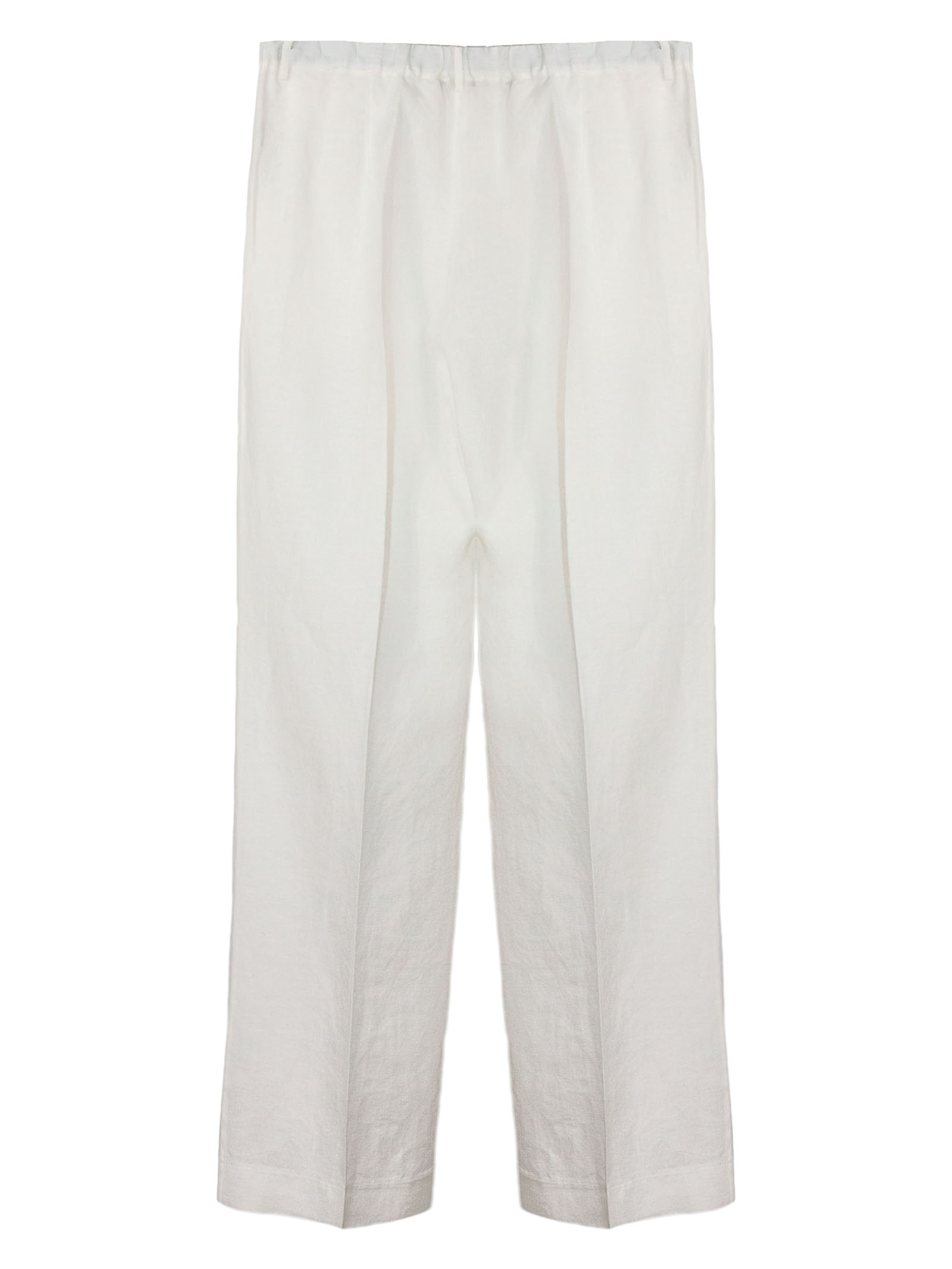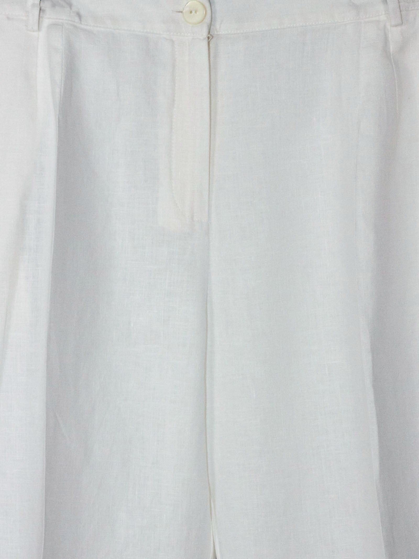 Pantalone gamba larga in lino bianco con chiusura zip e gancio nascosta, piega frontale