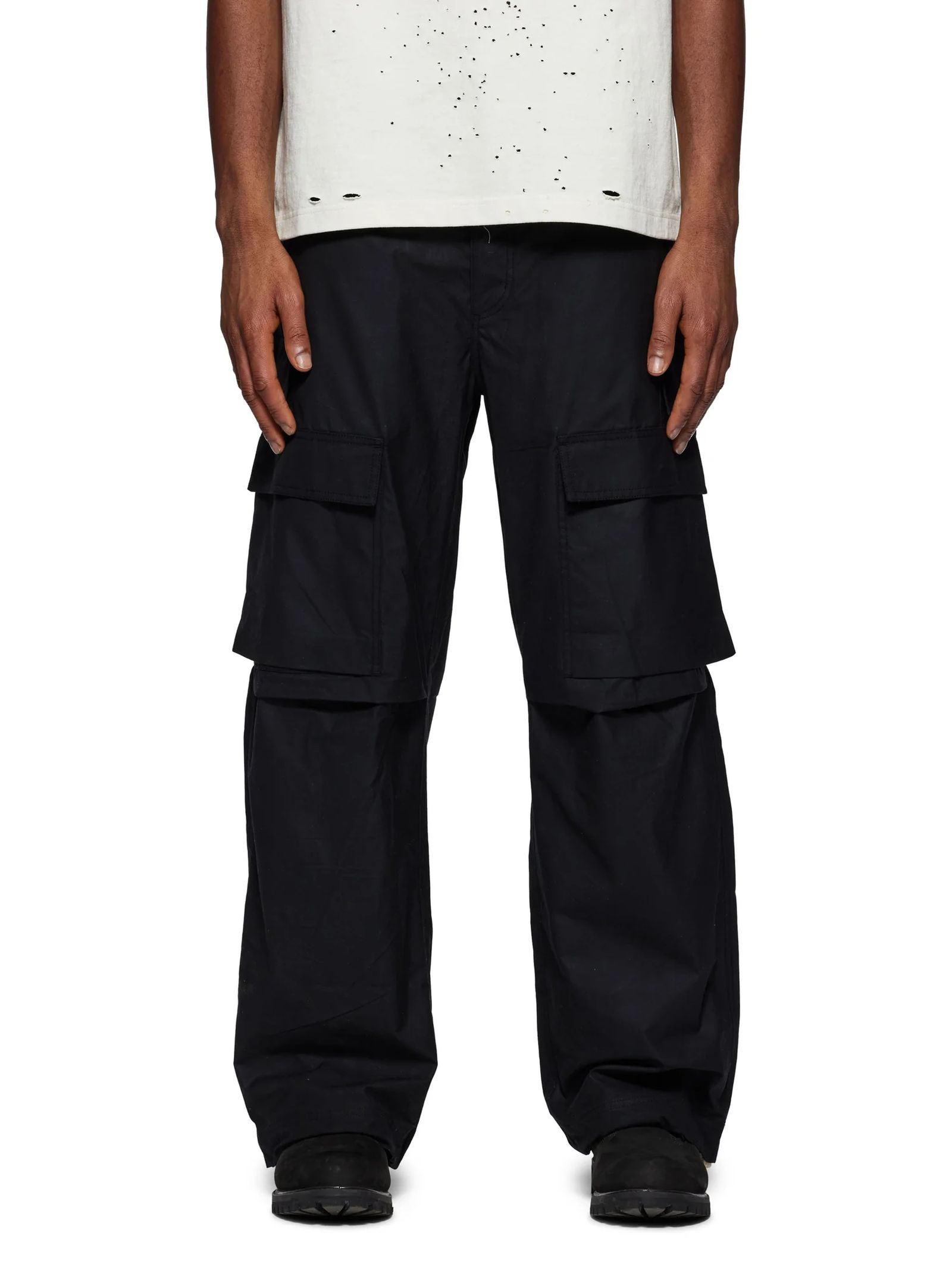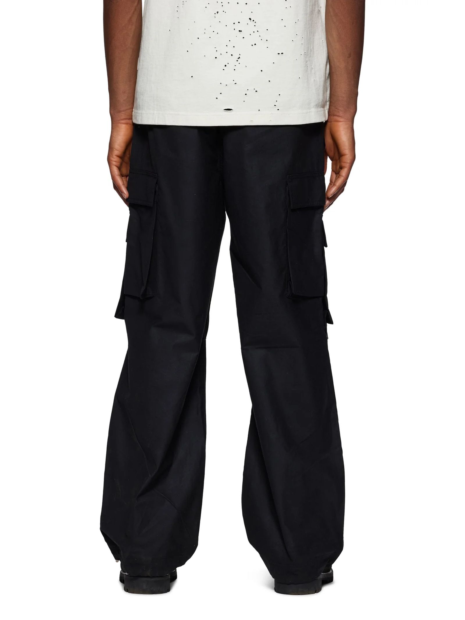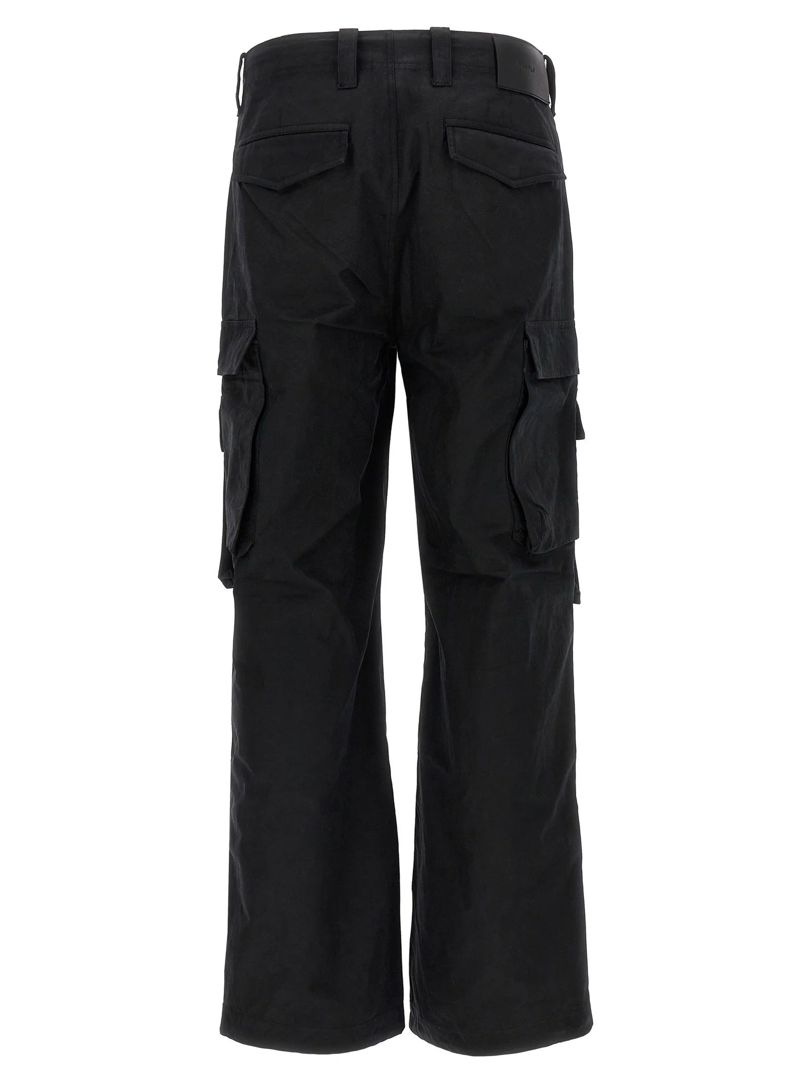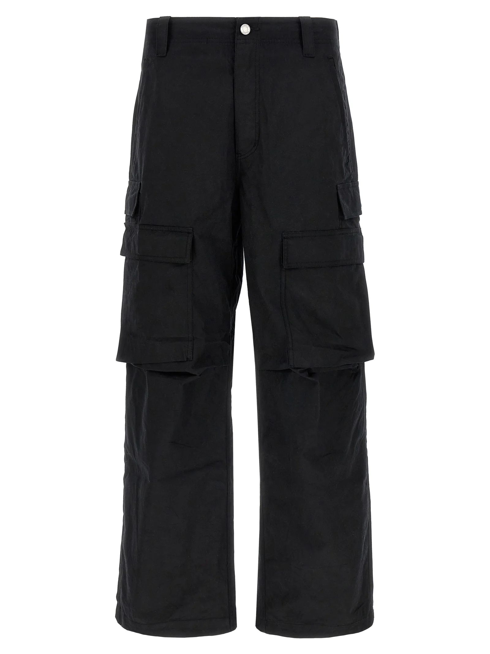 Cargo in cotone nero, chiusura con zip nascosta e bottone, passanti, due tasche a filetto laterali, due tasche posteriori con patta