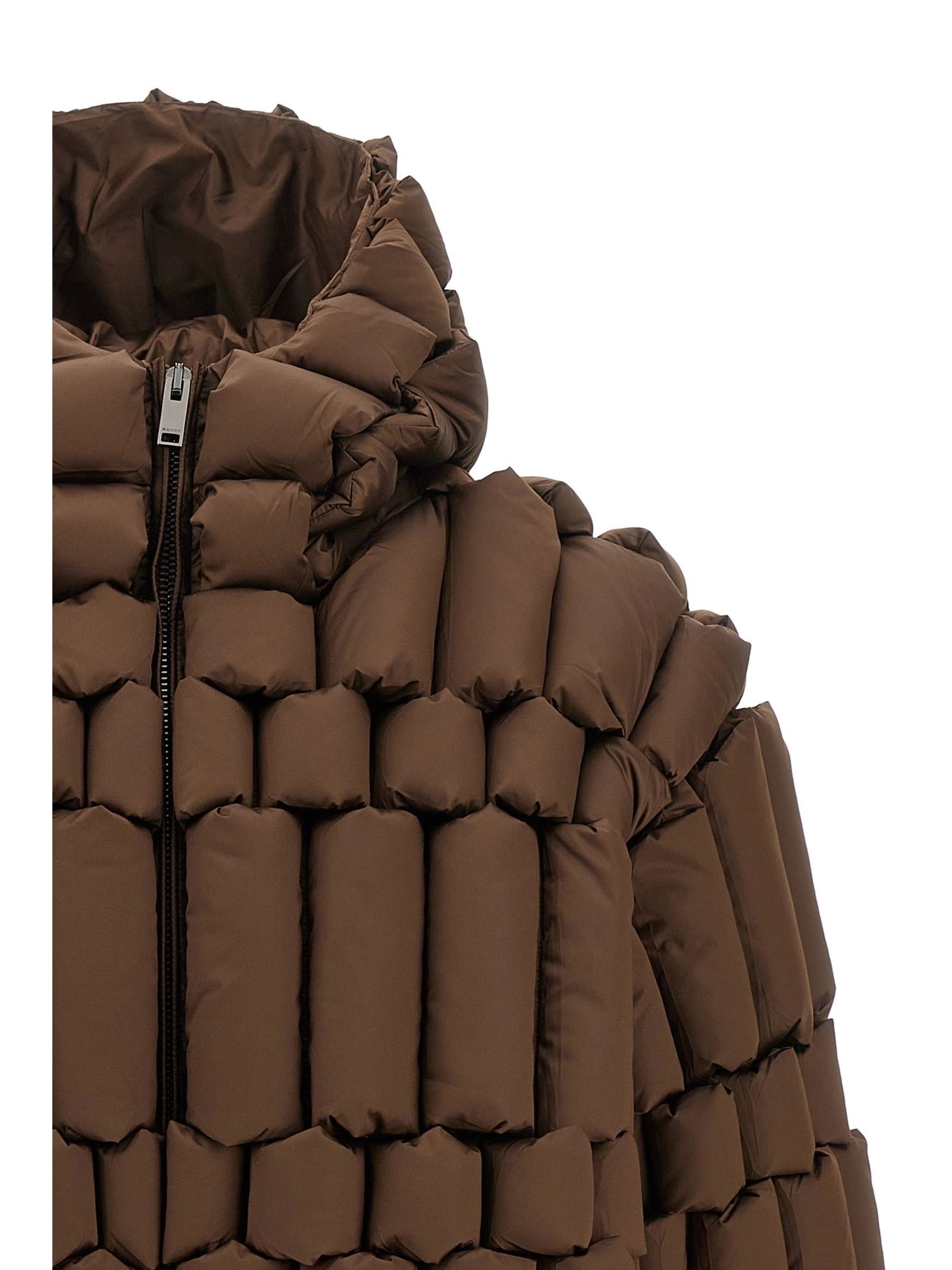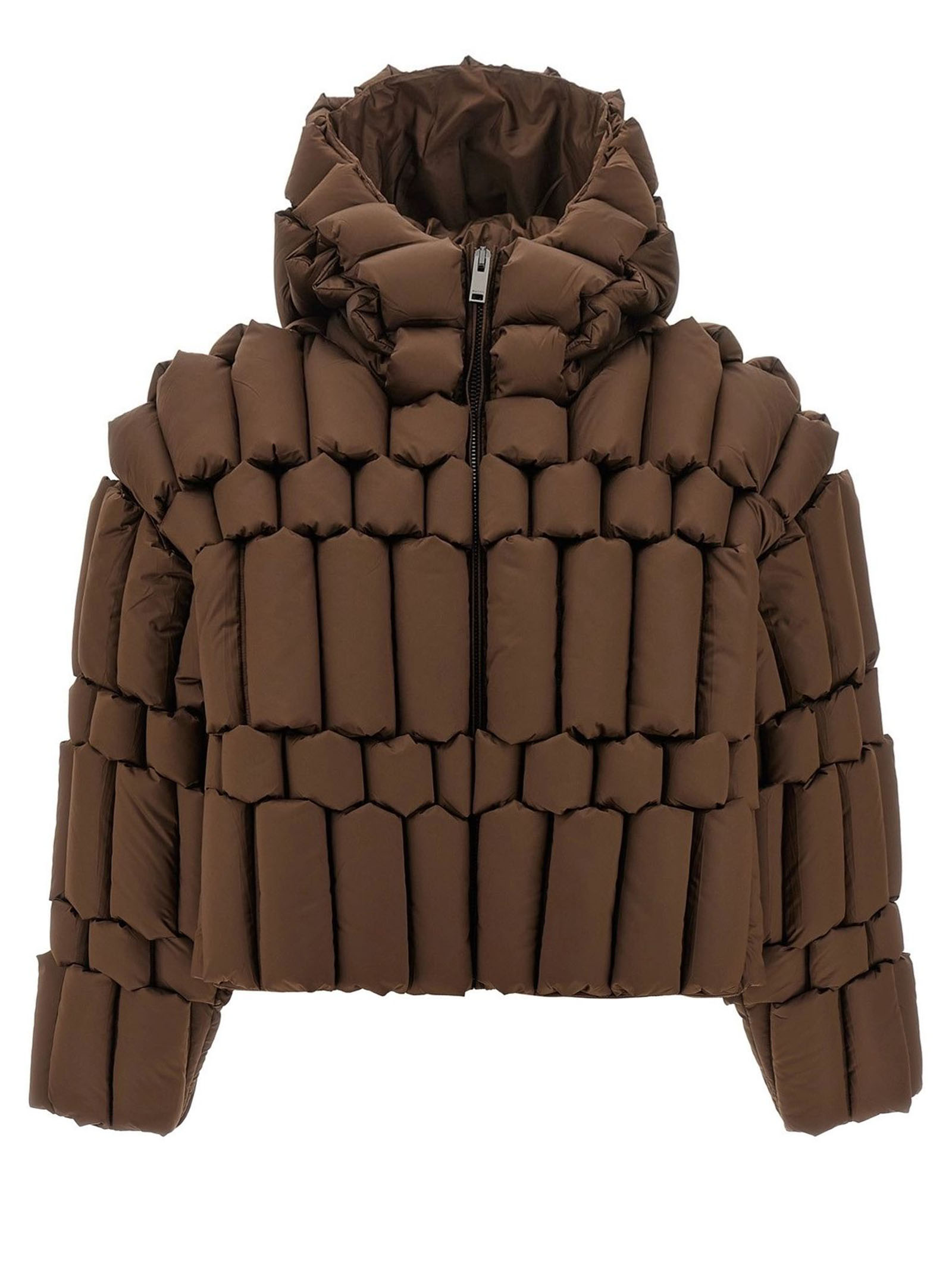 Piumino in nylon con struttura in 3D intrecciata e imbottita in piuma d'oca, modello crop, cappuccio, collo alto, chiusura zip frontale, tasche, manica lunga con spalla scesa, fondo capo asimmetrico