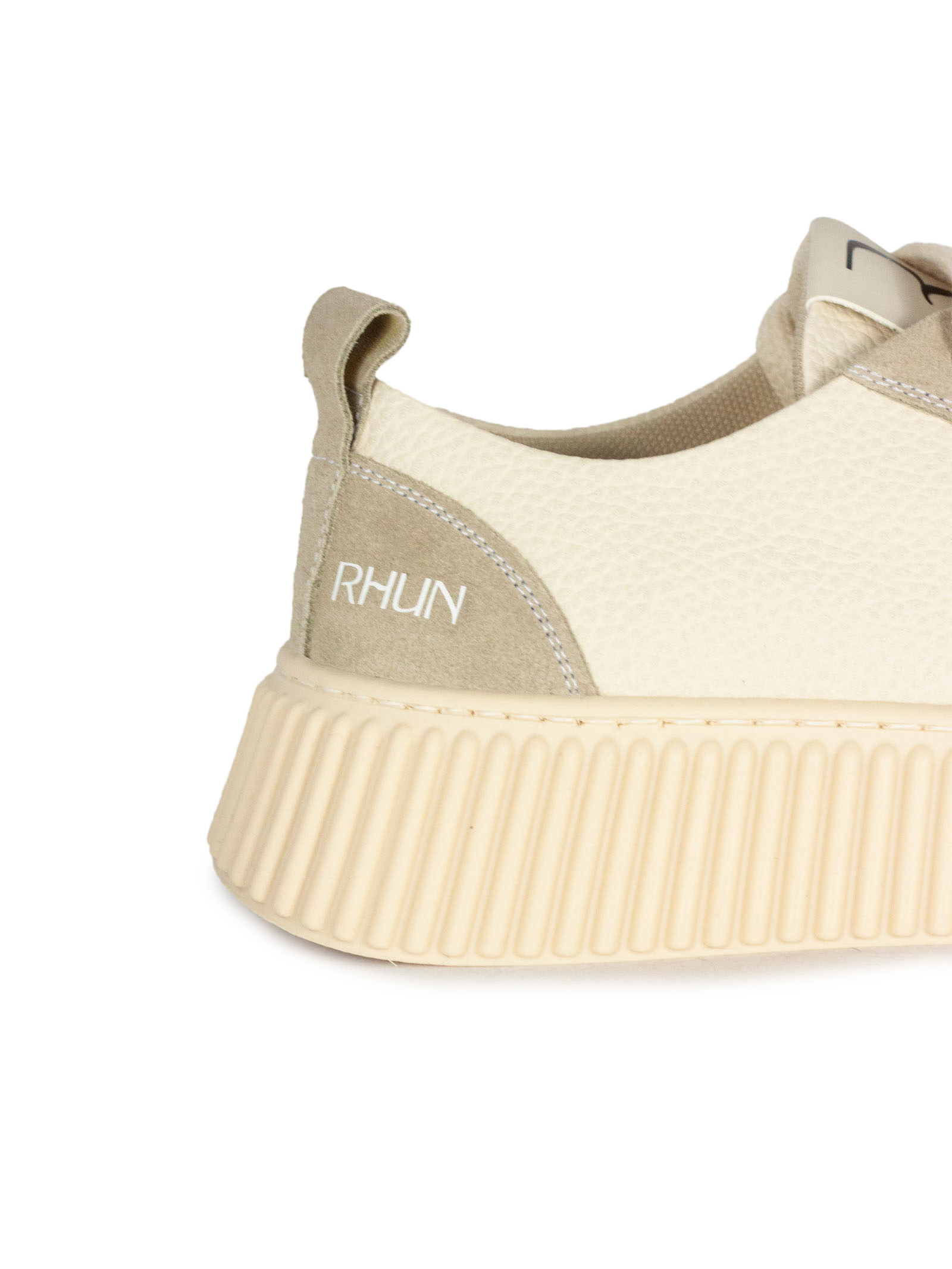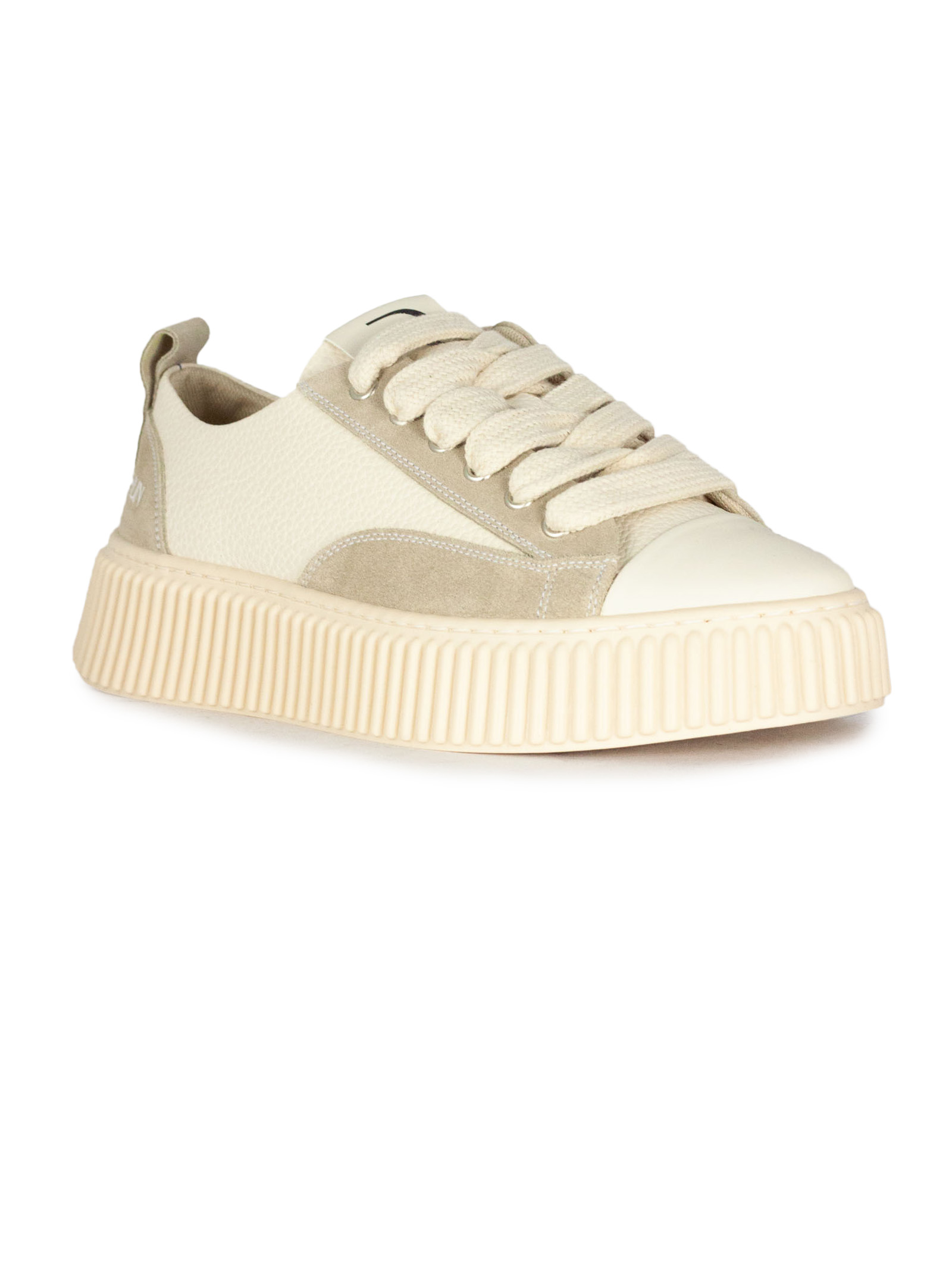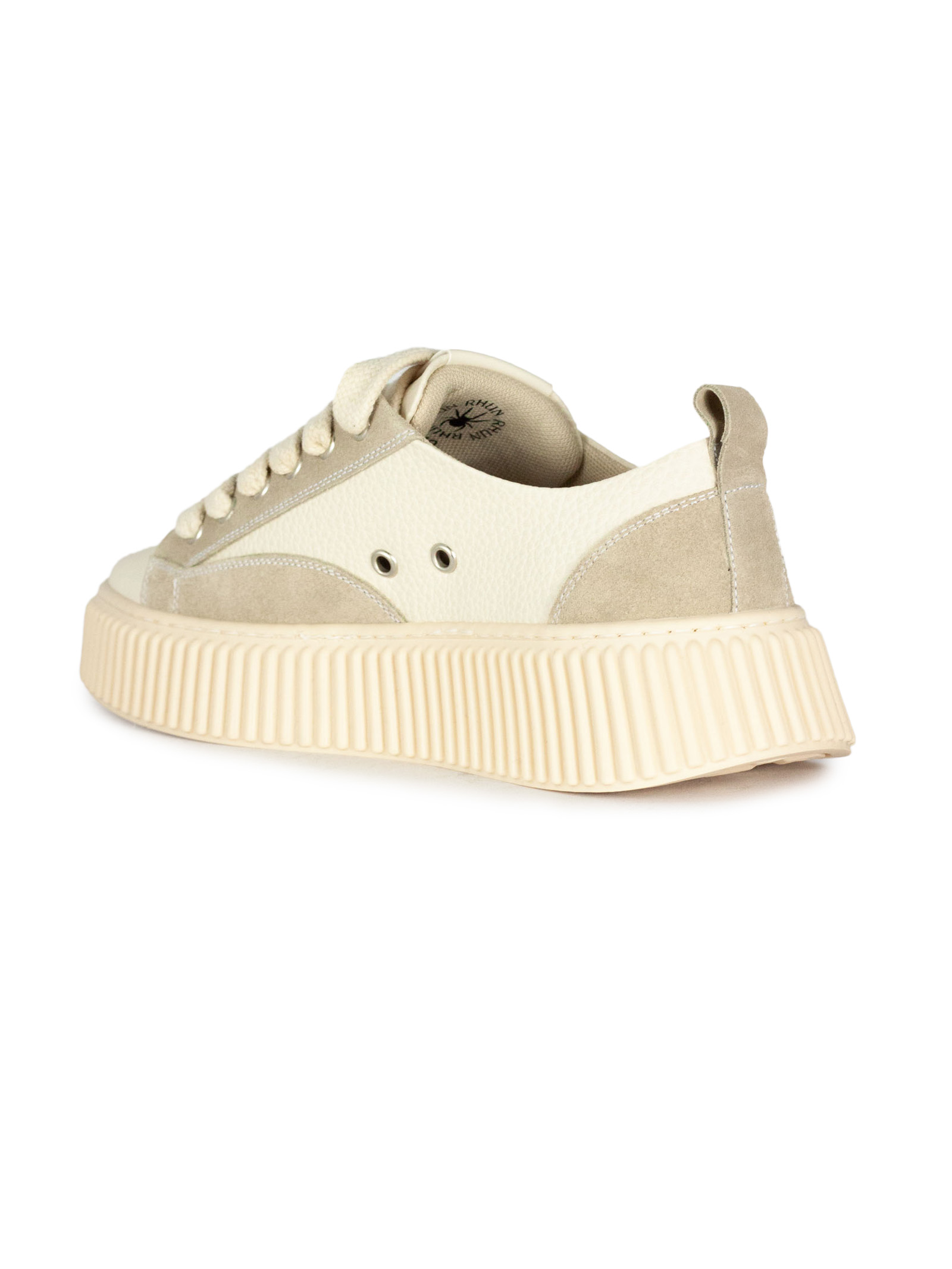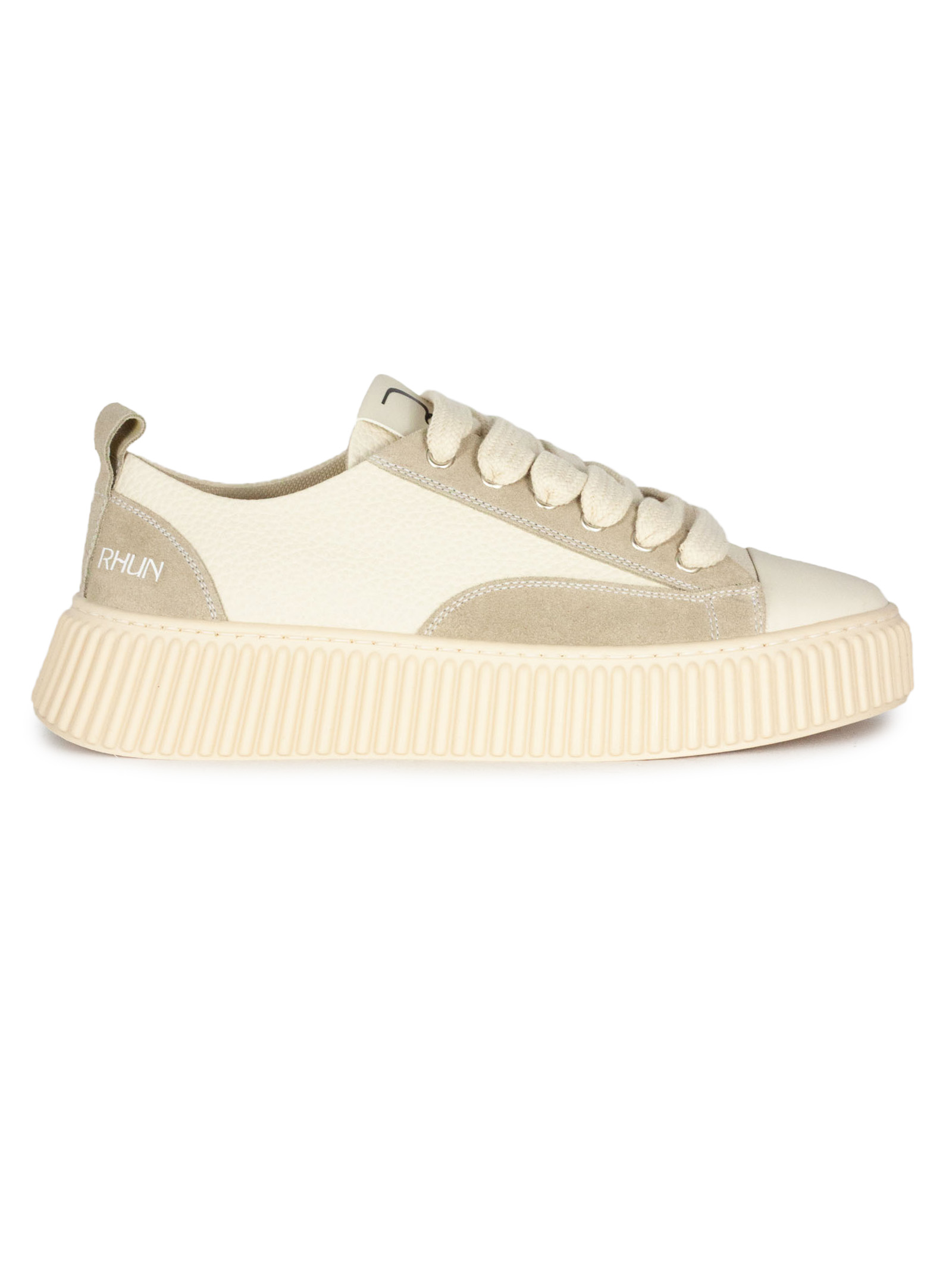 Sneakers 2019 Beige Grain Leather Mix, pelle bianca martellata e inserti in suede con cuciture bianche, Gambetto con sei passanti passanti e lacci spessi, dotate di logo in rilievo sulla linguetta e sul tallone, suola voluminosa in gomma nera e design con righe in rilievo nero
