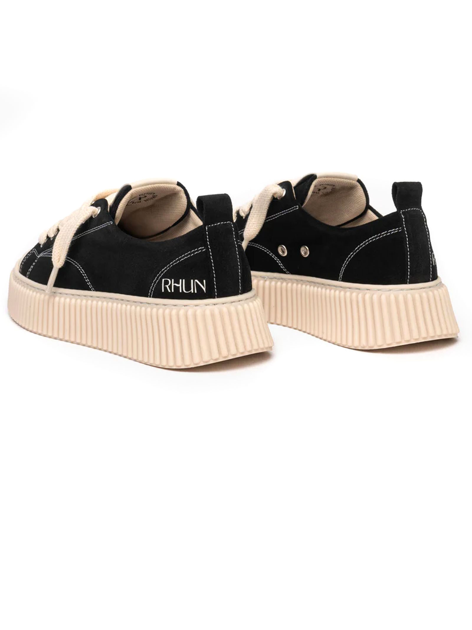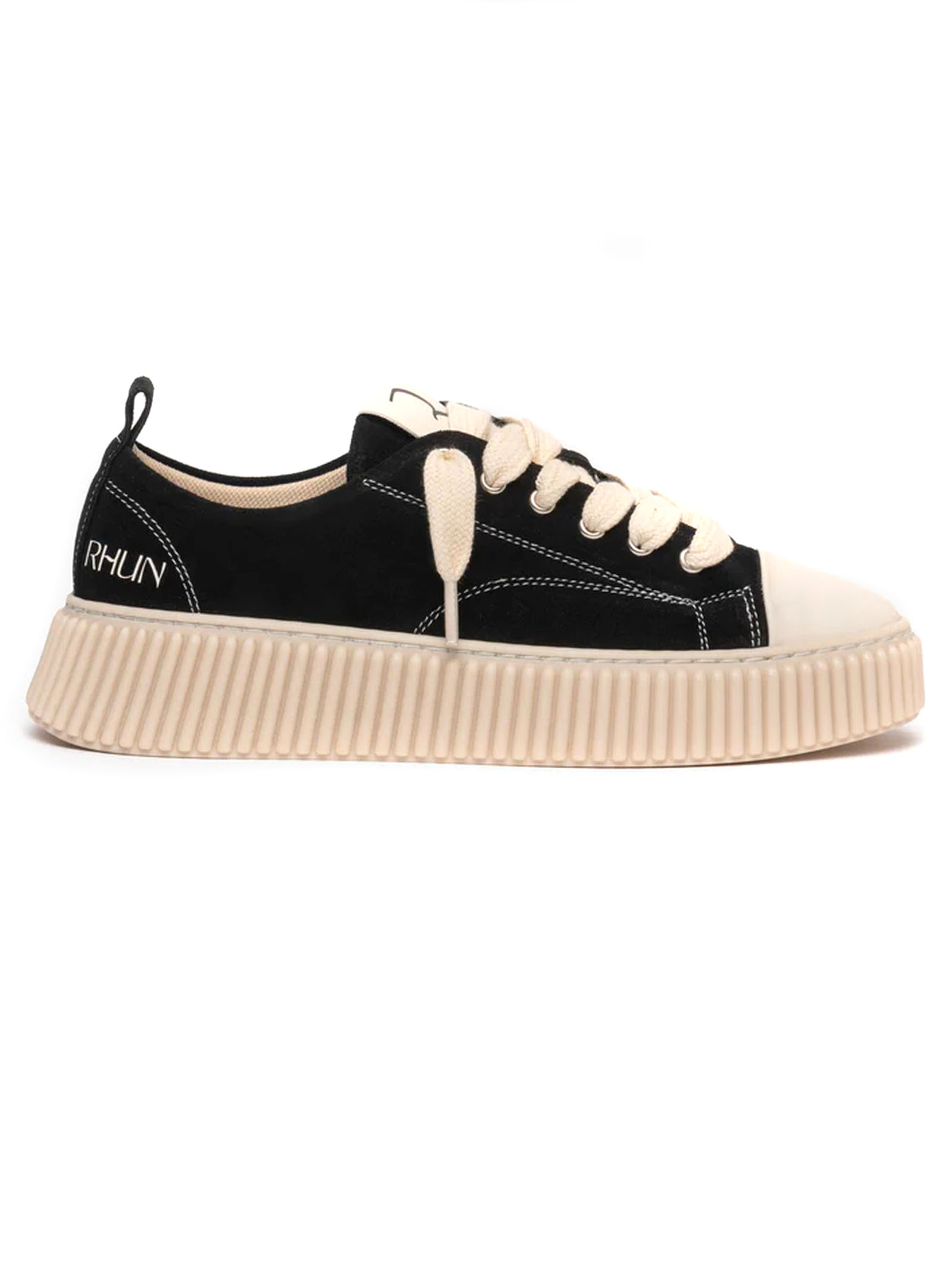 Sneakers 2020 Treble Black Suede, camoscio nera con cuciture bianche, gambetto con sei passanti passanti e lacci spessi, dotate di logo in rilievo sulla linguetta e sul tallone, suola voluminosa in gomma beige e design con righe in rilievo