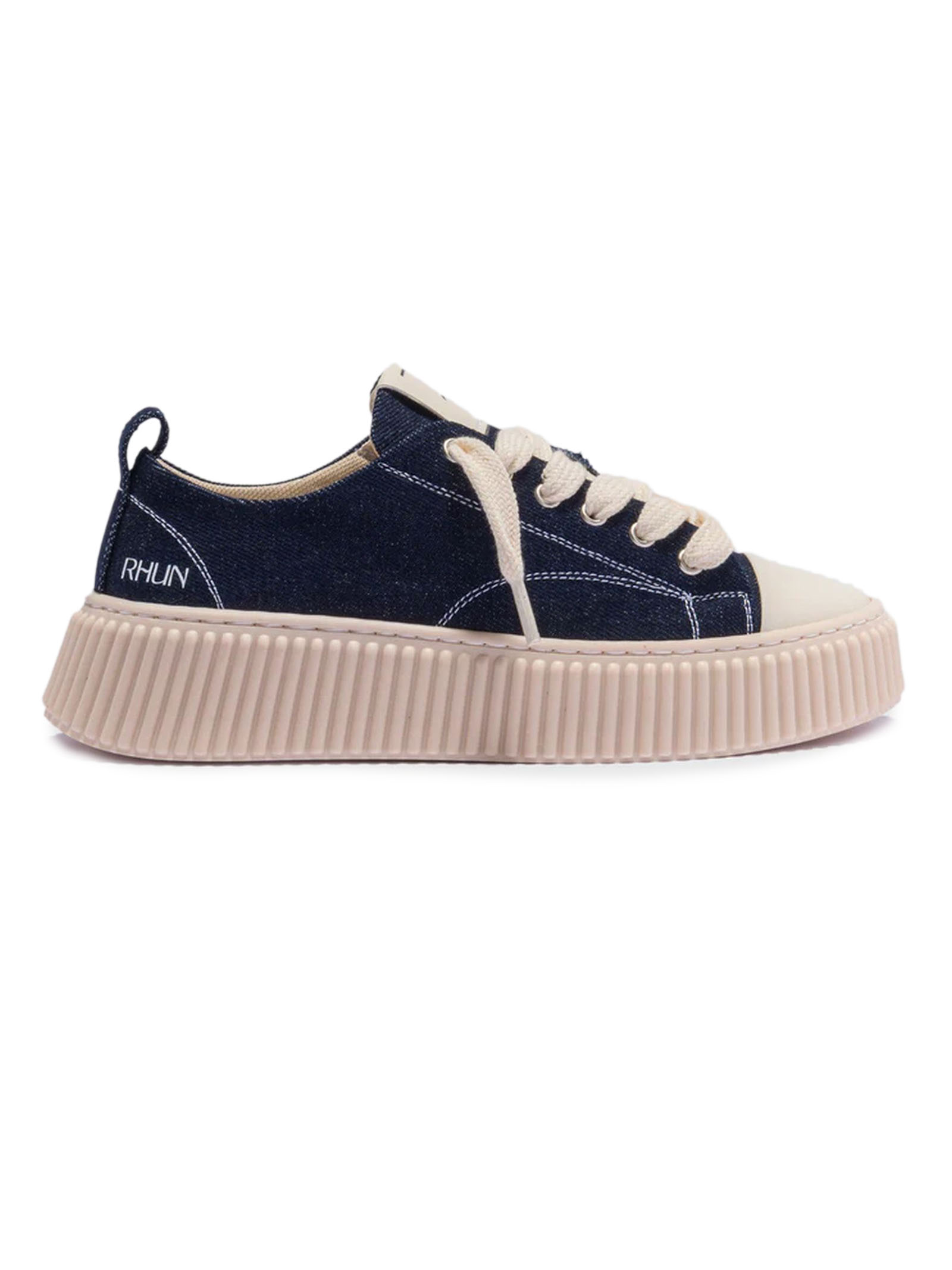 Sneakers Basse In Canvas Denim Con Cuciture Bianche, Gambetto Con Sei Passanti Passanti E Lacci Spessi, Dotate Di Logo In Rilievo Sulla Linguetta E Sul Tallone, Suola Voluminosa In Gomma Beige E Design Con Righe In Rilievo