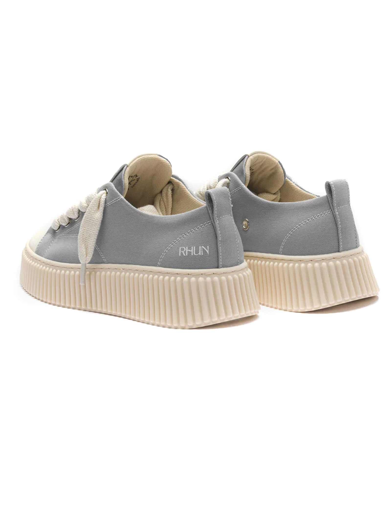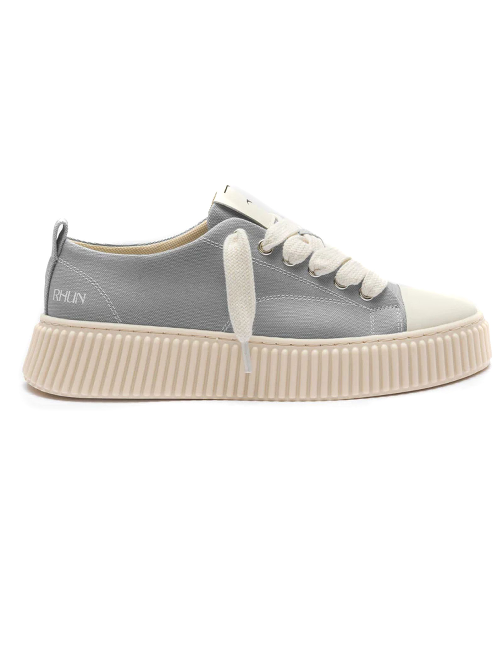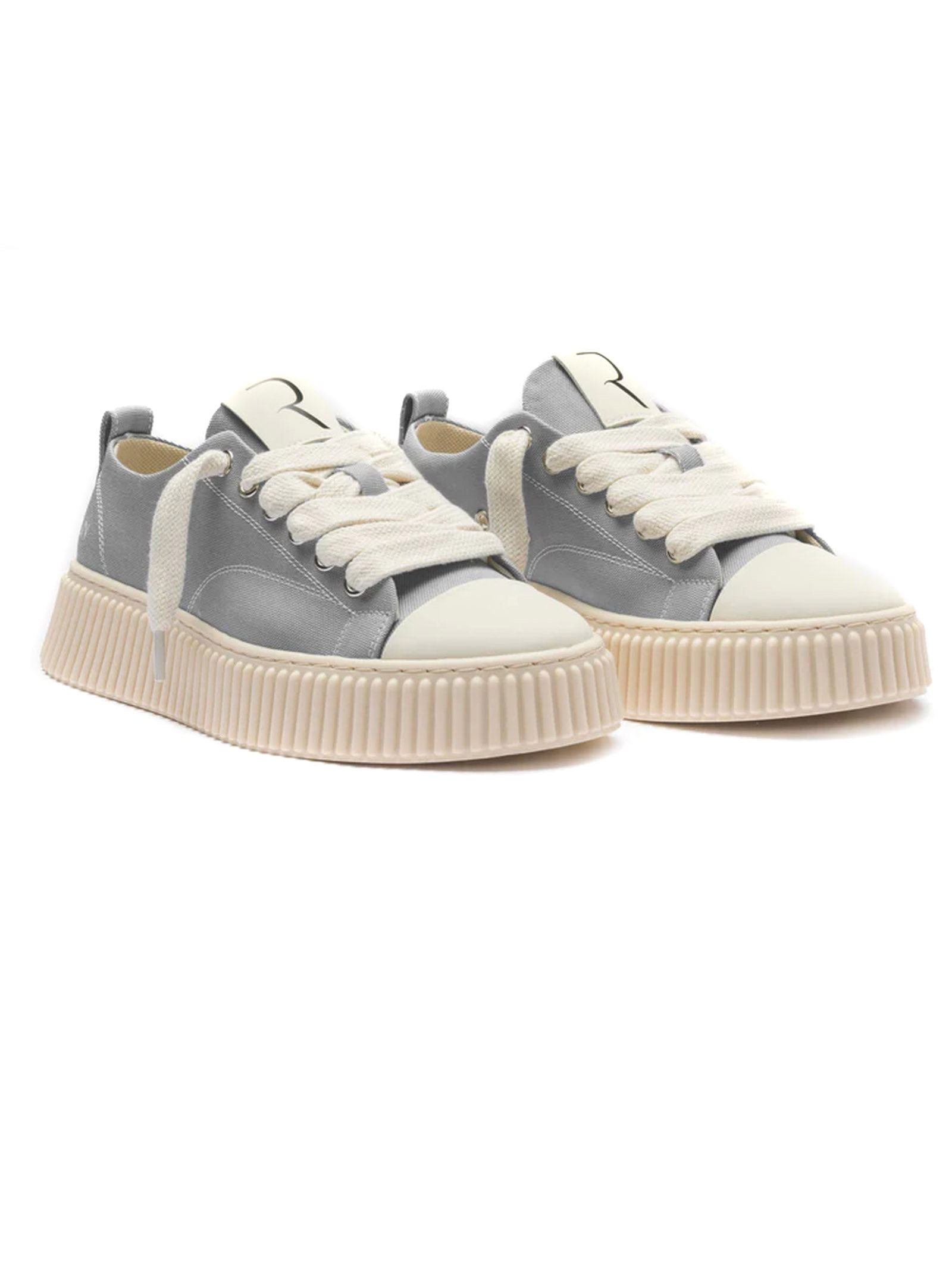 Sneakers Basse In Canvas Grigio Con Cuciture Bianche, Gambetto Con Sei Passanti Passanti E Lacci Spessi, Dotate Di Logo In Rilievo Sulla Linguetta E Sul Tallone, Suola Voluminosa In Gomma Beige E Design Con Righe In Rilievo