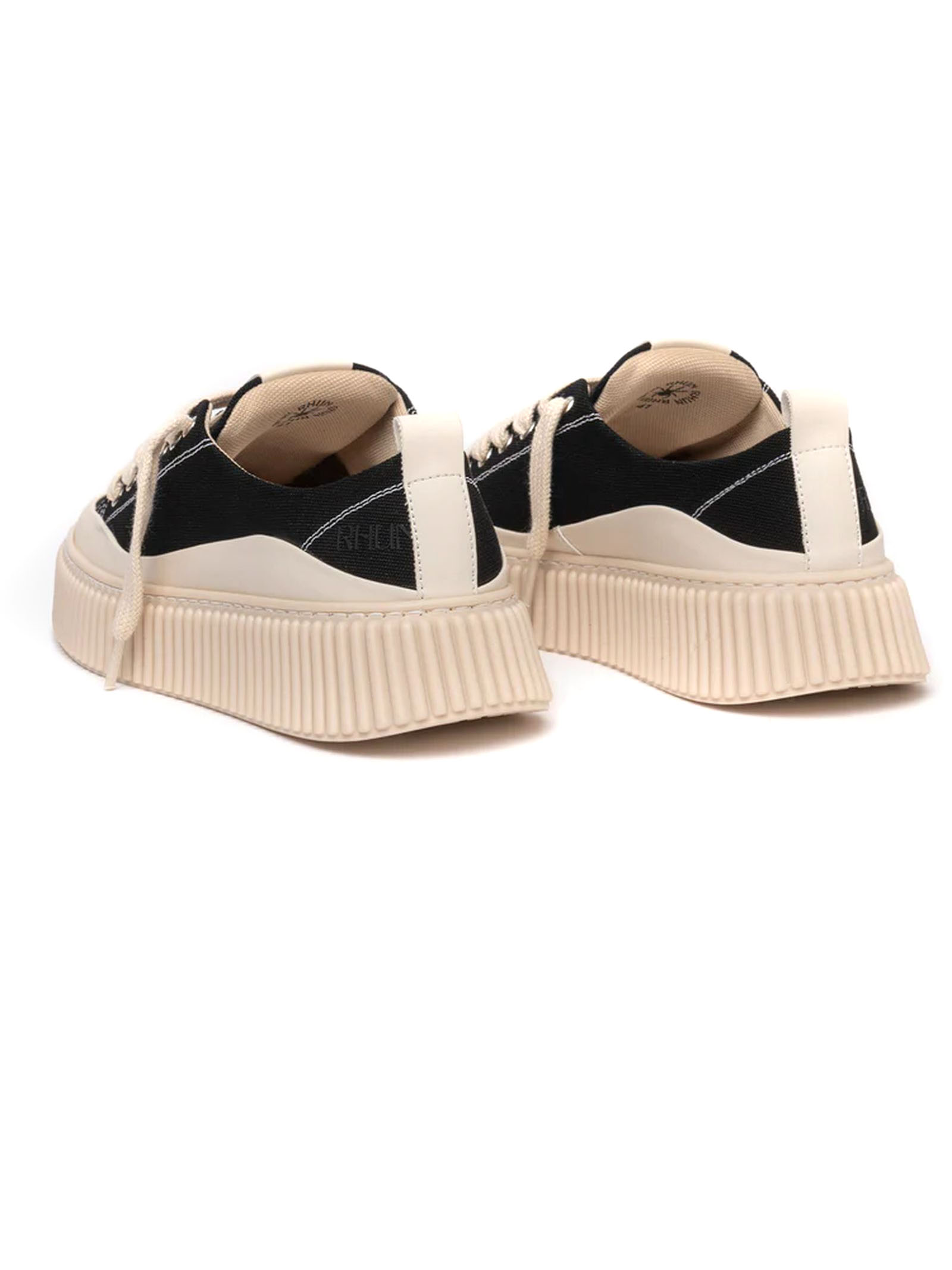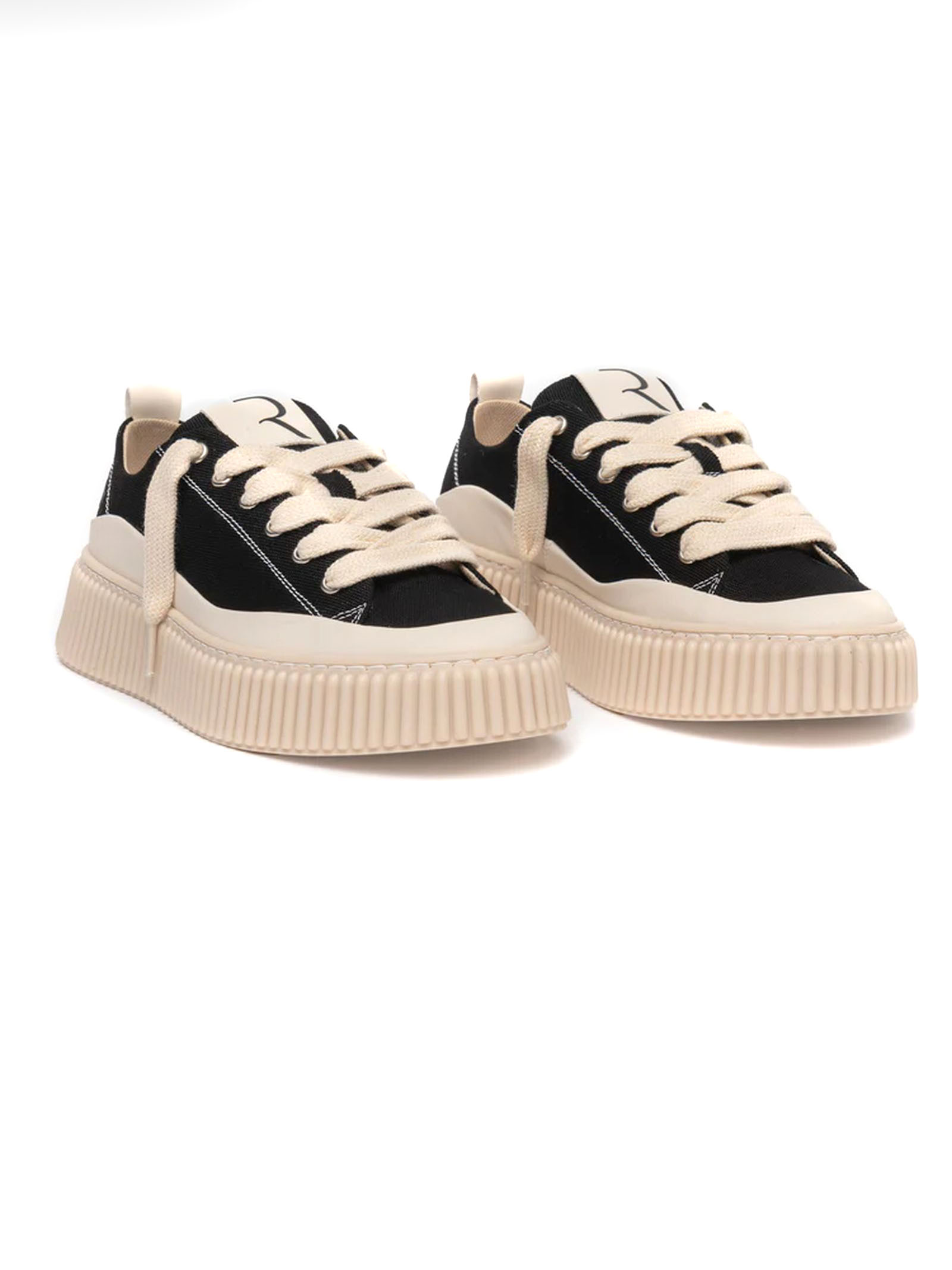 Sneakers basse in canvas nero con cuciture bianche e inserti bianchi, gambetto con sei passanti passanti e lacci spessi, dotate di logo in rilievo sulla linguetta e sul tallone, suola voluminosa in gomma e design irregolare