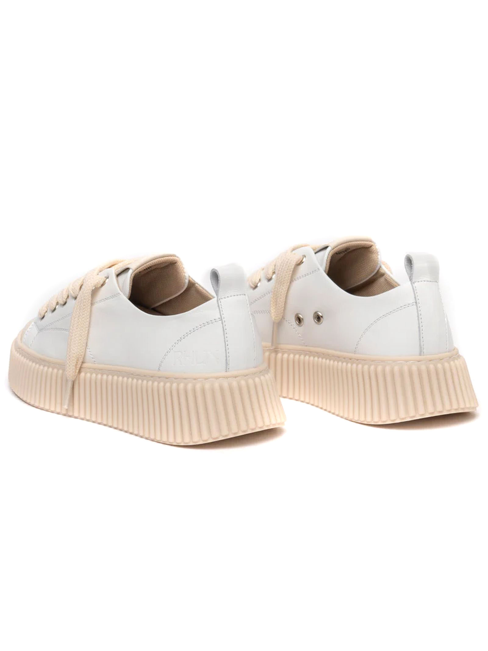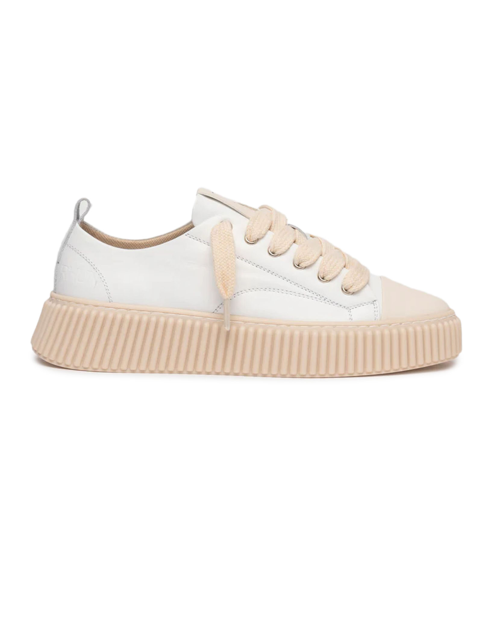 Sneakers basse in pelle bianca con cuciture bianche, gambetto con sei passanti passanti e lacci spessi, dotate di logo in rilievo sulla linguetta e sul tallone, suola voluminosa in gomma beige e design con righe in rilievo