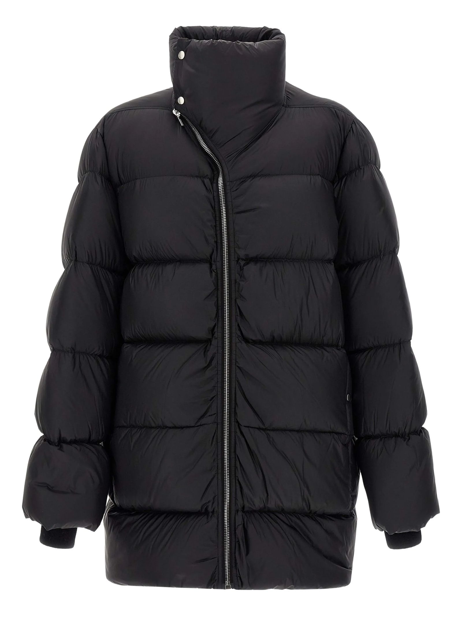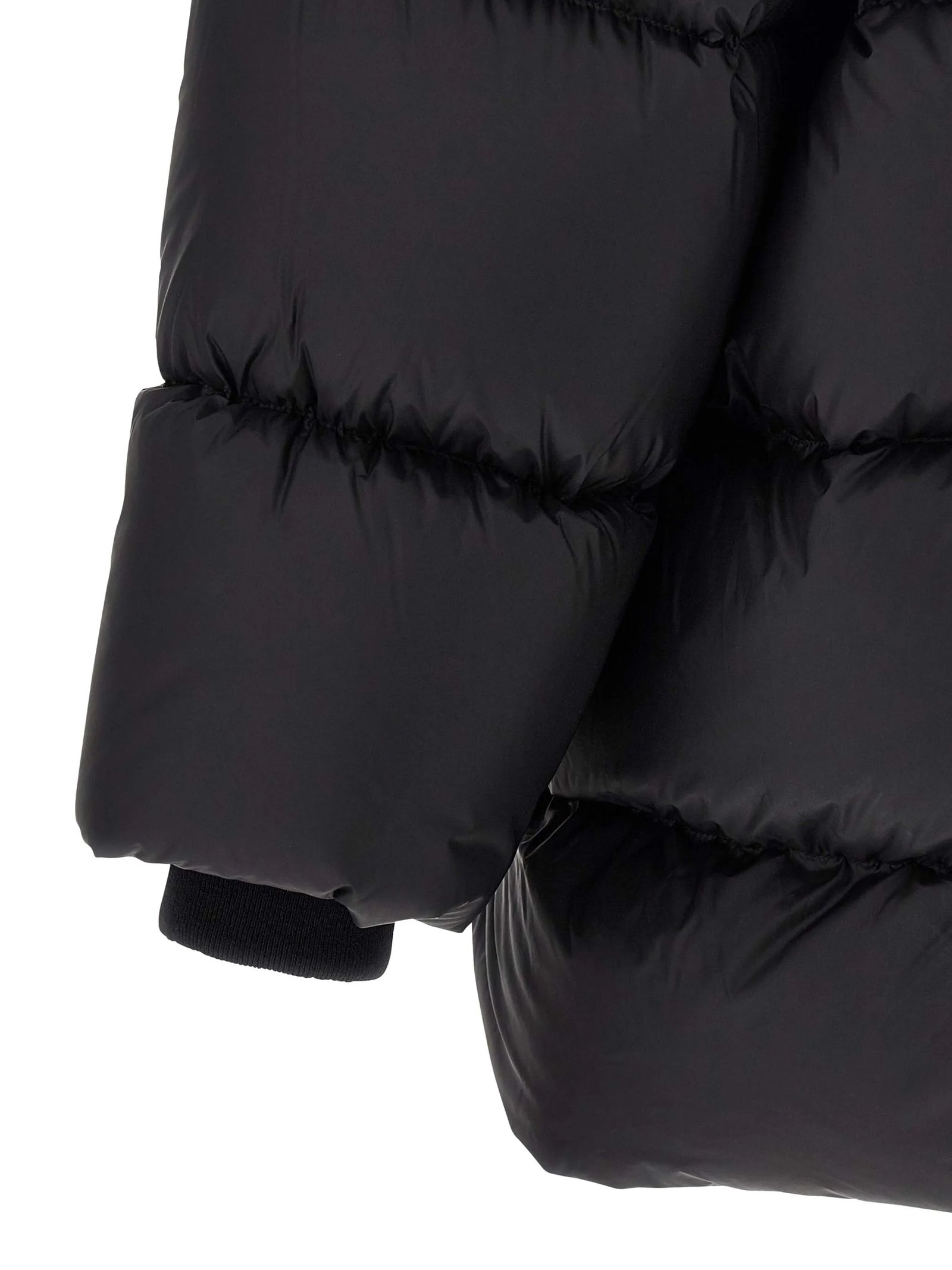 Cappotto Turtle trapuntato nero, imbottitura in piuma d'oca, chiusura con zip, colletto rialzato, dettaglio con cinghia posteriore, polsini a coste