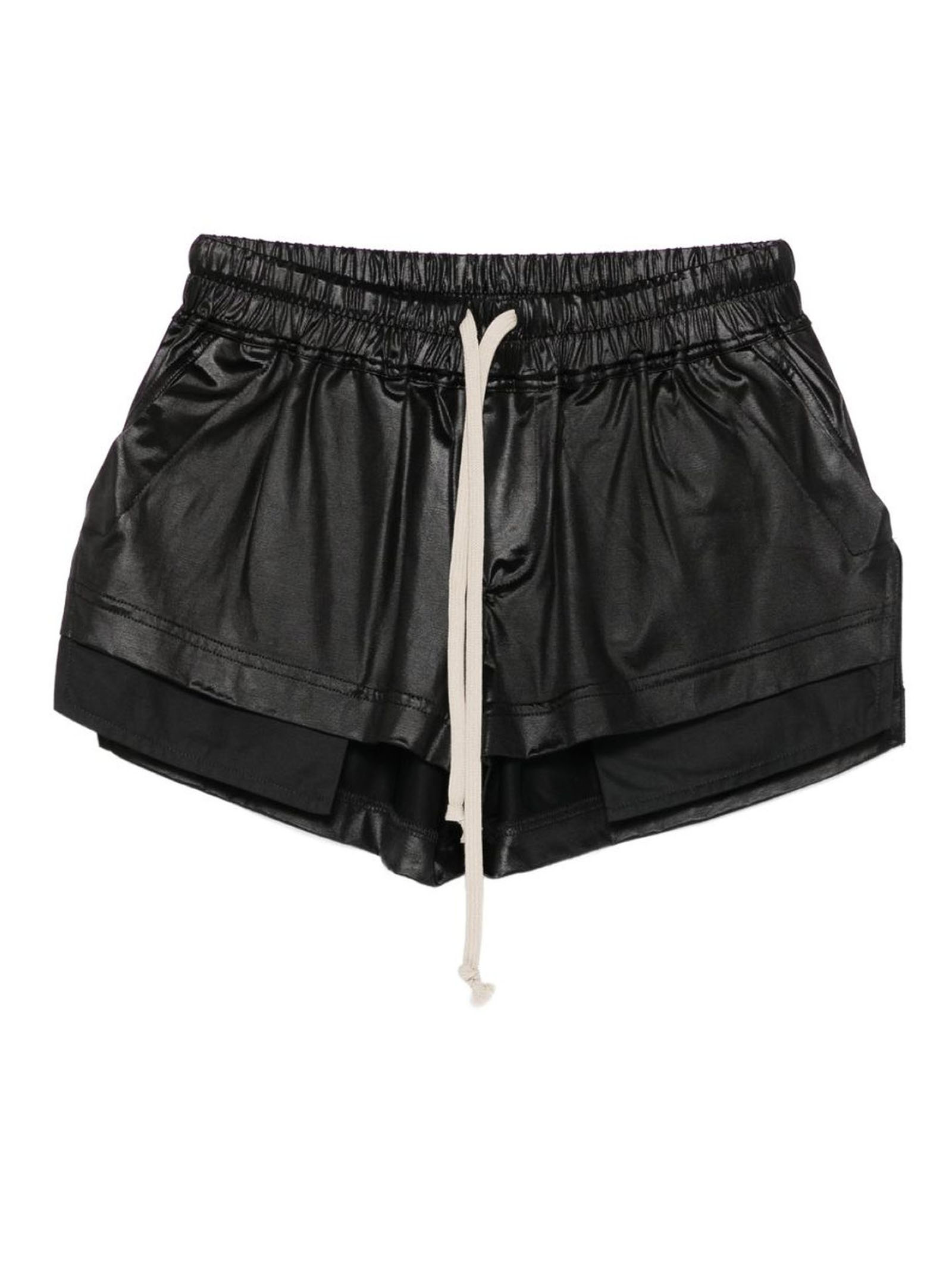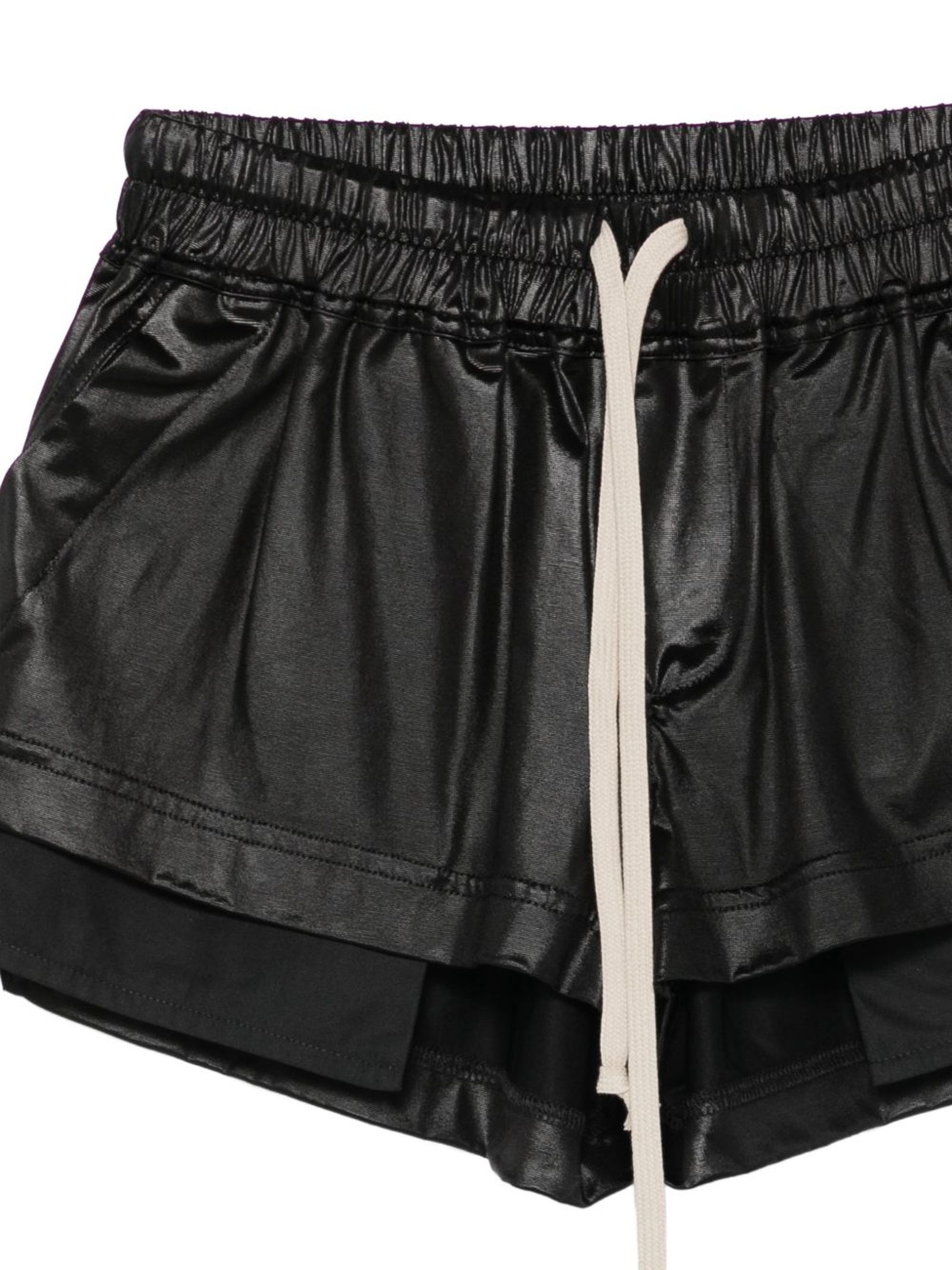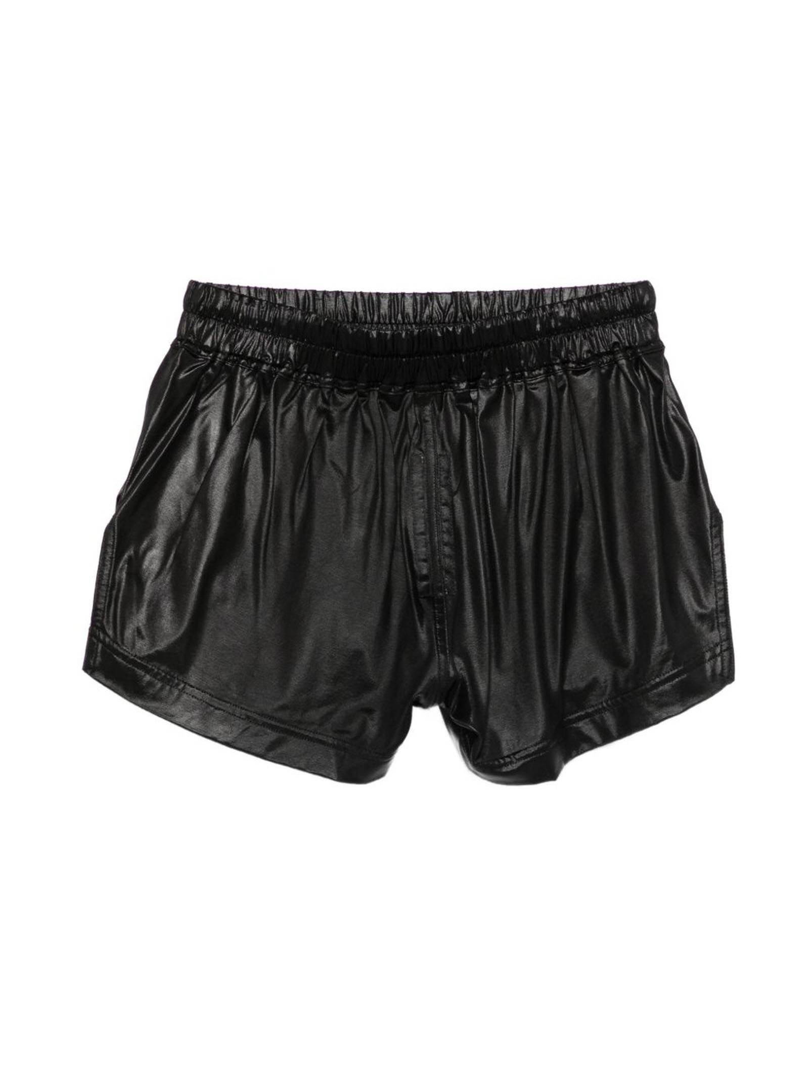 Boxer Fog in jersey nero liquido, dal taglio alto sulla coscia, con elastico in vita e coulisse, tasche laterali a filetto e spacchi laterali
