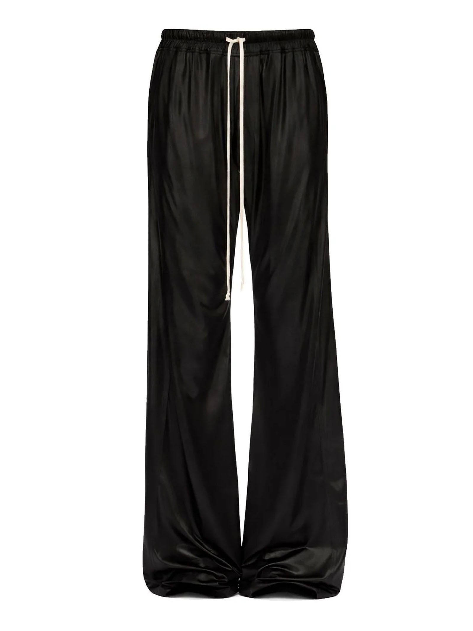 Pantaloni larghi in jersey nero lucido, lunghi fino ai piedi, con gamba ampia e cavallo leggermente ribassato. Presentano una cintura elasticizzata con coulisse, tasche a filetto laterali sul davanti e tasche posteriori squadrate con impunture. Sono caratterizzati da chiusure a bottoni automatici a vista lungo la parte esterna della gamba, che consentono di slacciarli e indossarli aperti