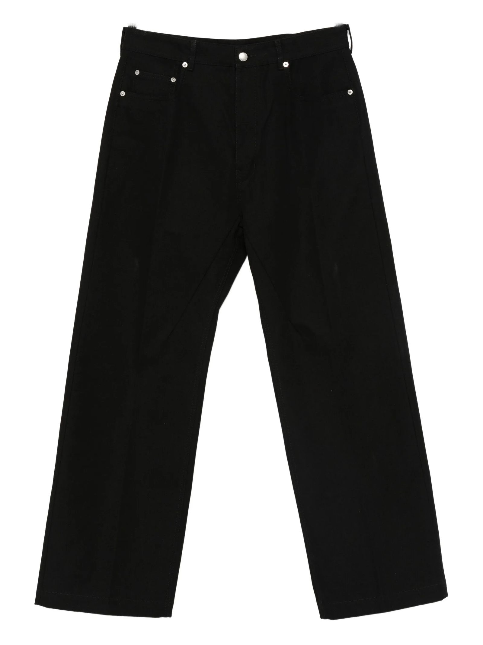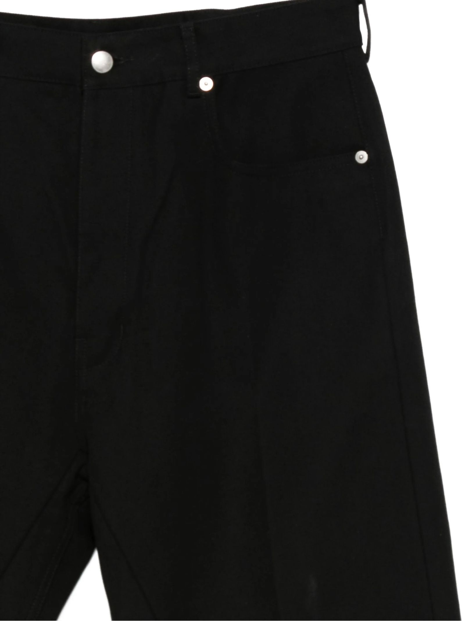 Jeans in cotone whipcord nero, dettagli metallici color argento, cinque tasche, passanti per cintura, chiusura con bottone superiore.