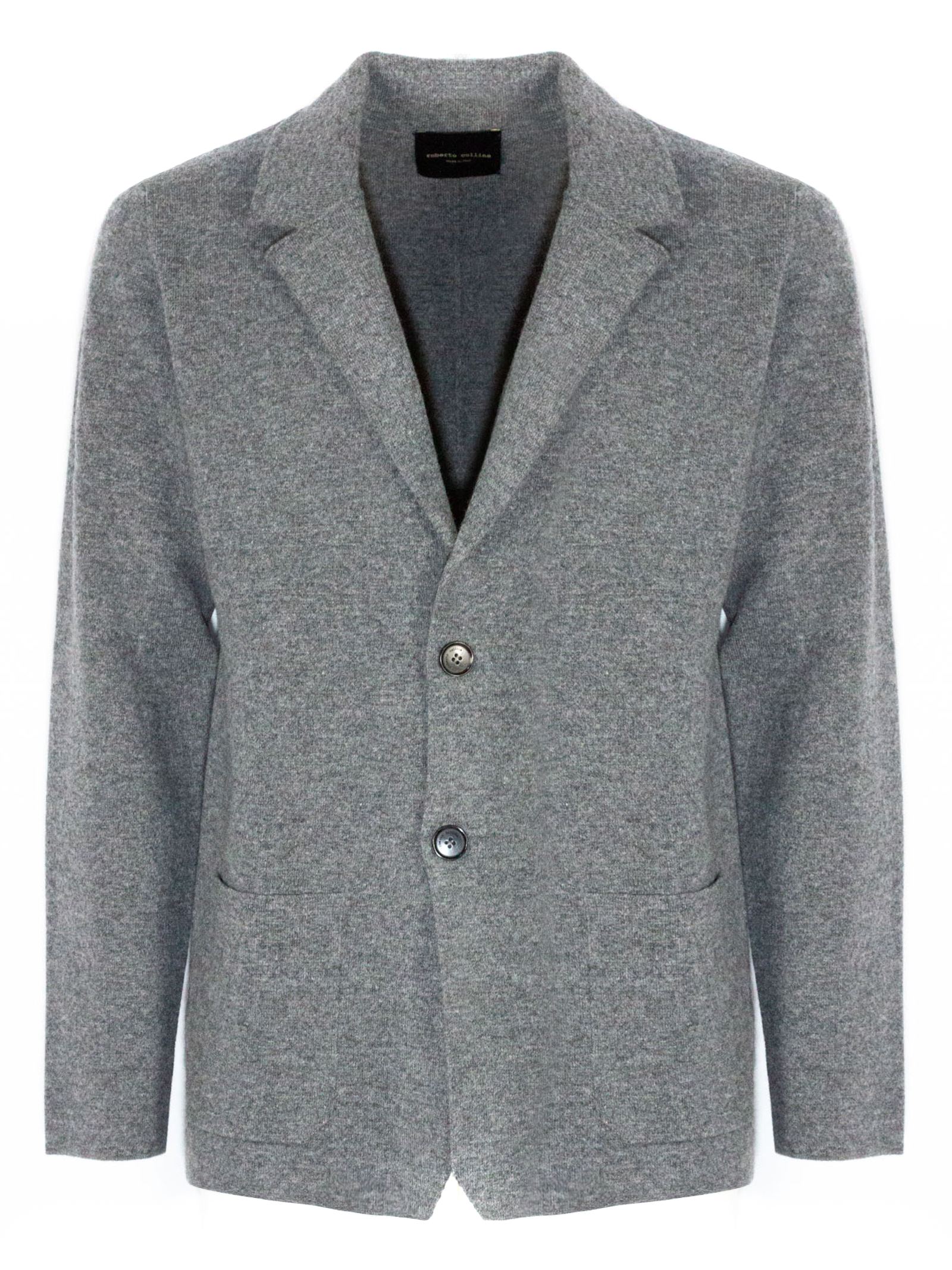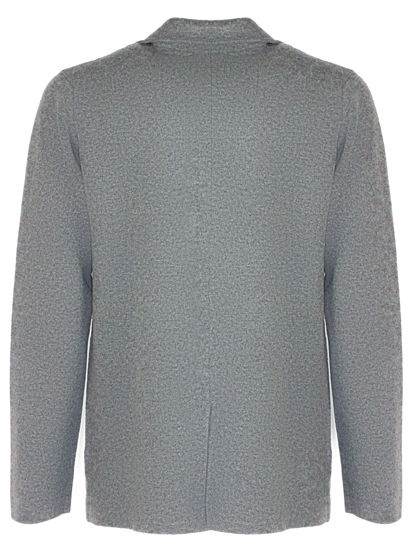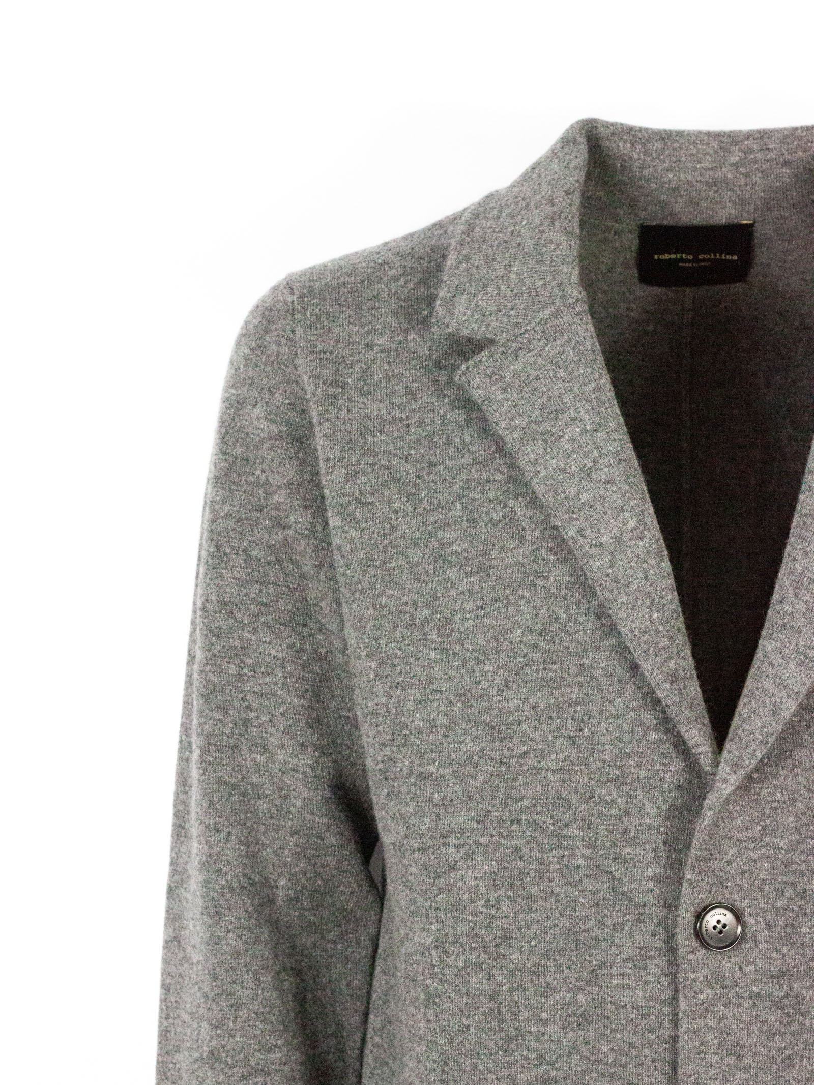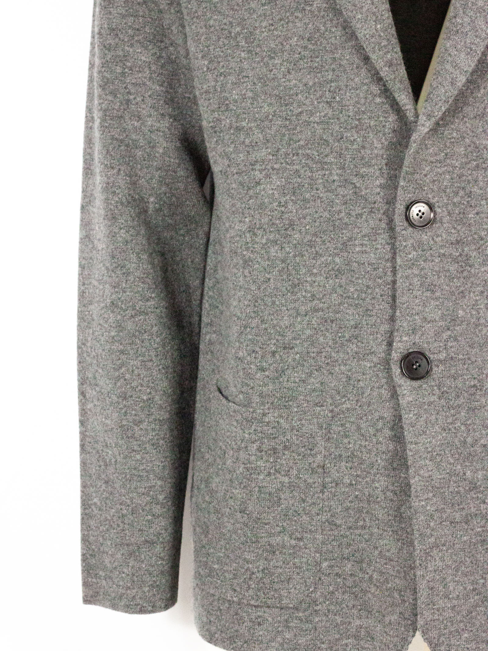 Maglia cardigan in lana merino grigio con chiusura frontale monopetto, reverse classico, tasche laterali a filetto, spacco sul retro