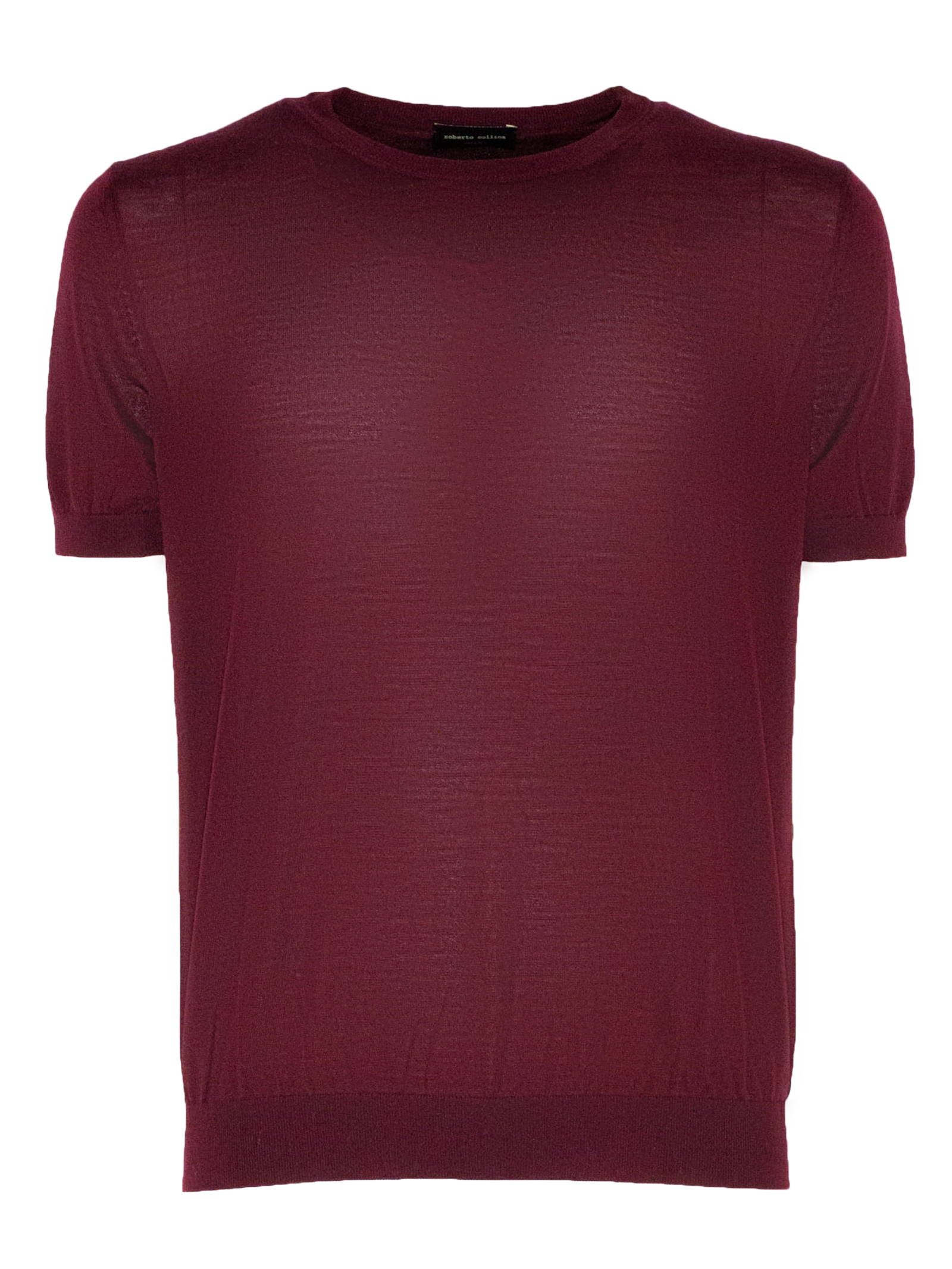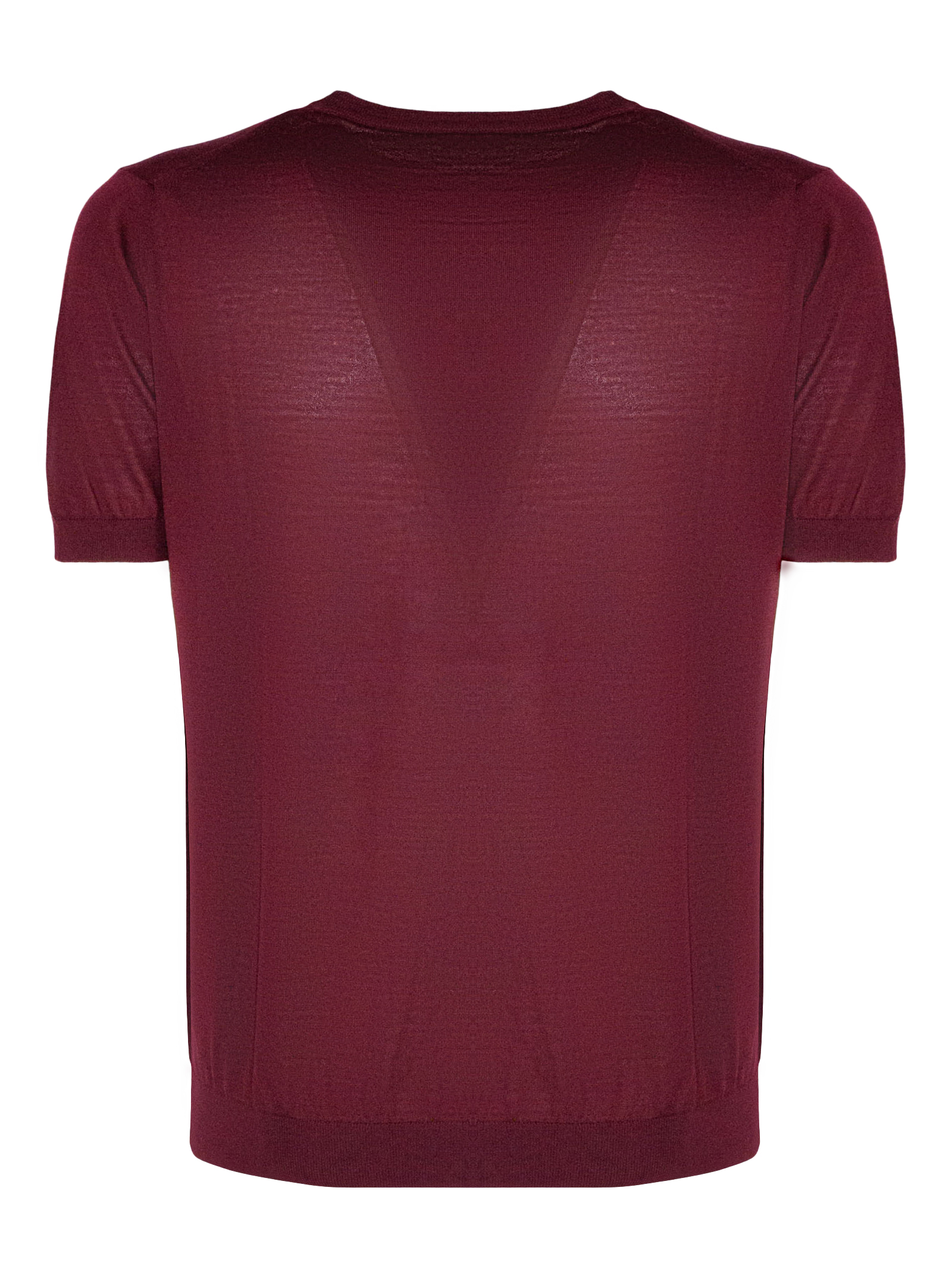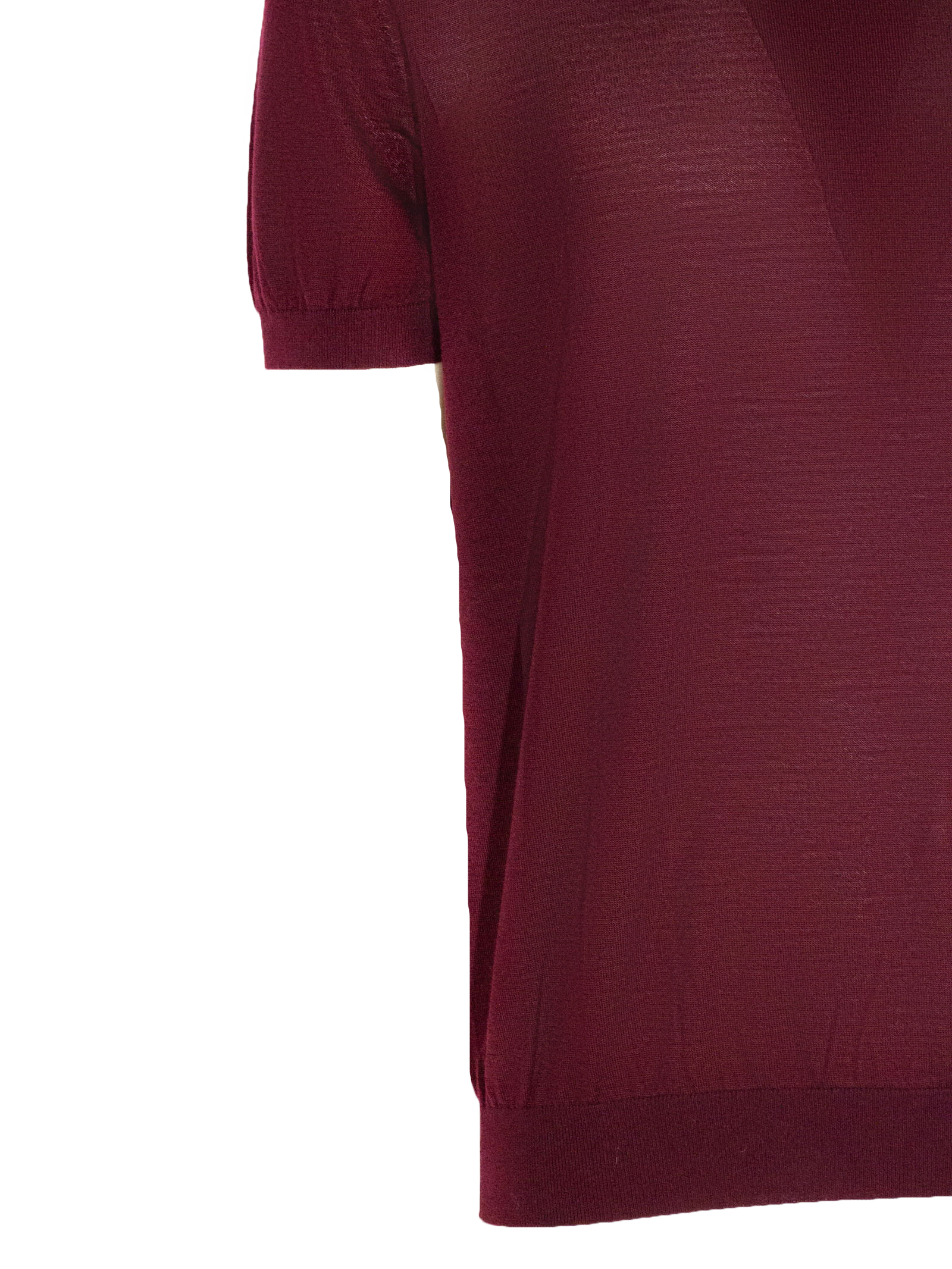 Maglia in lana merino bordeaux con girocollo, maniche corte, superfine, finiture a costine