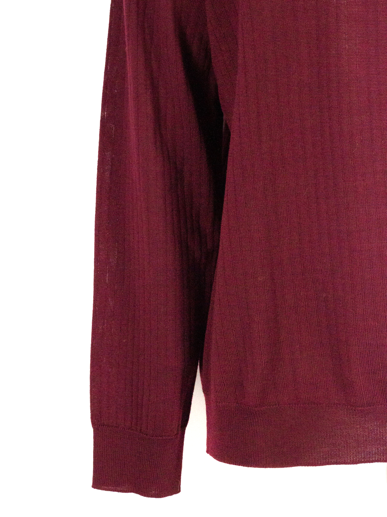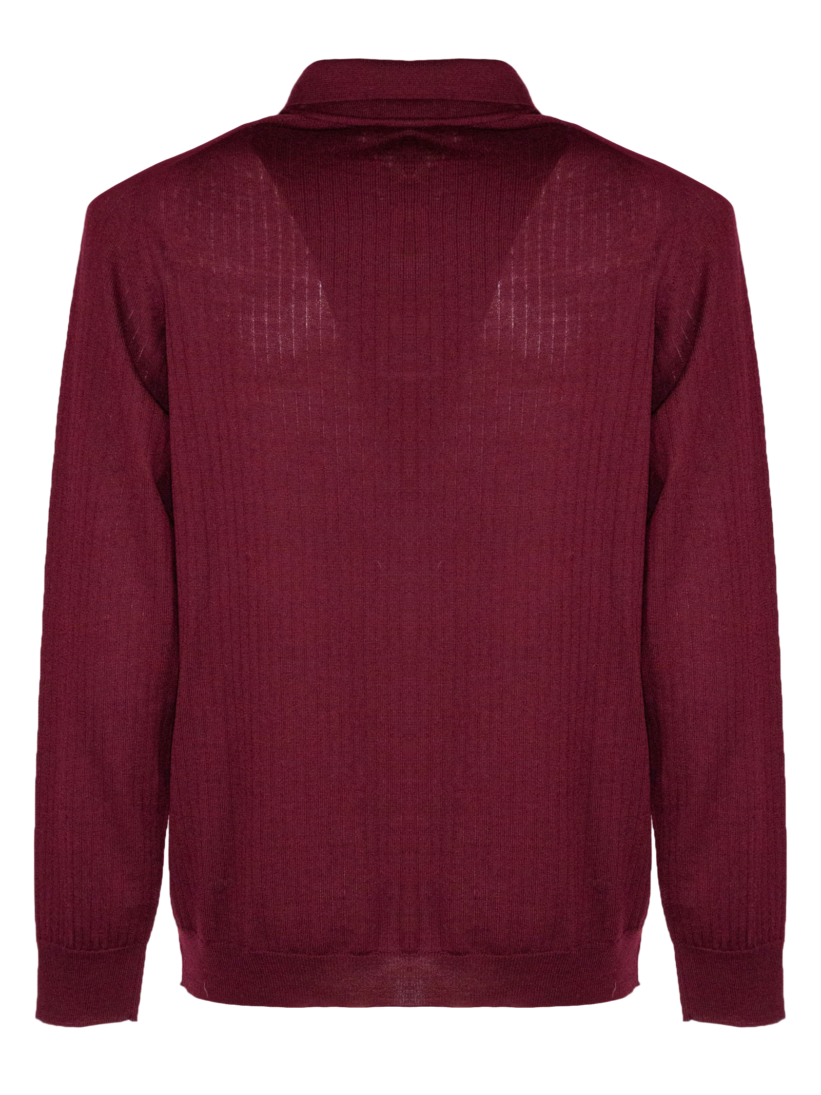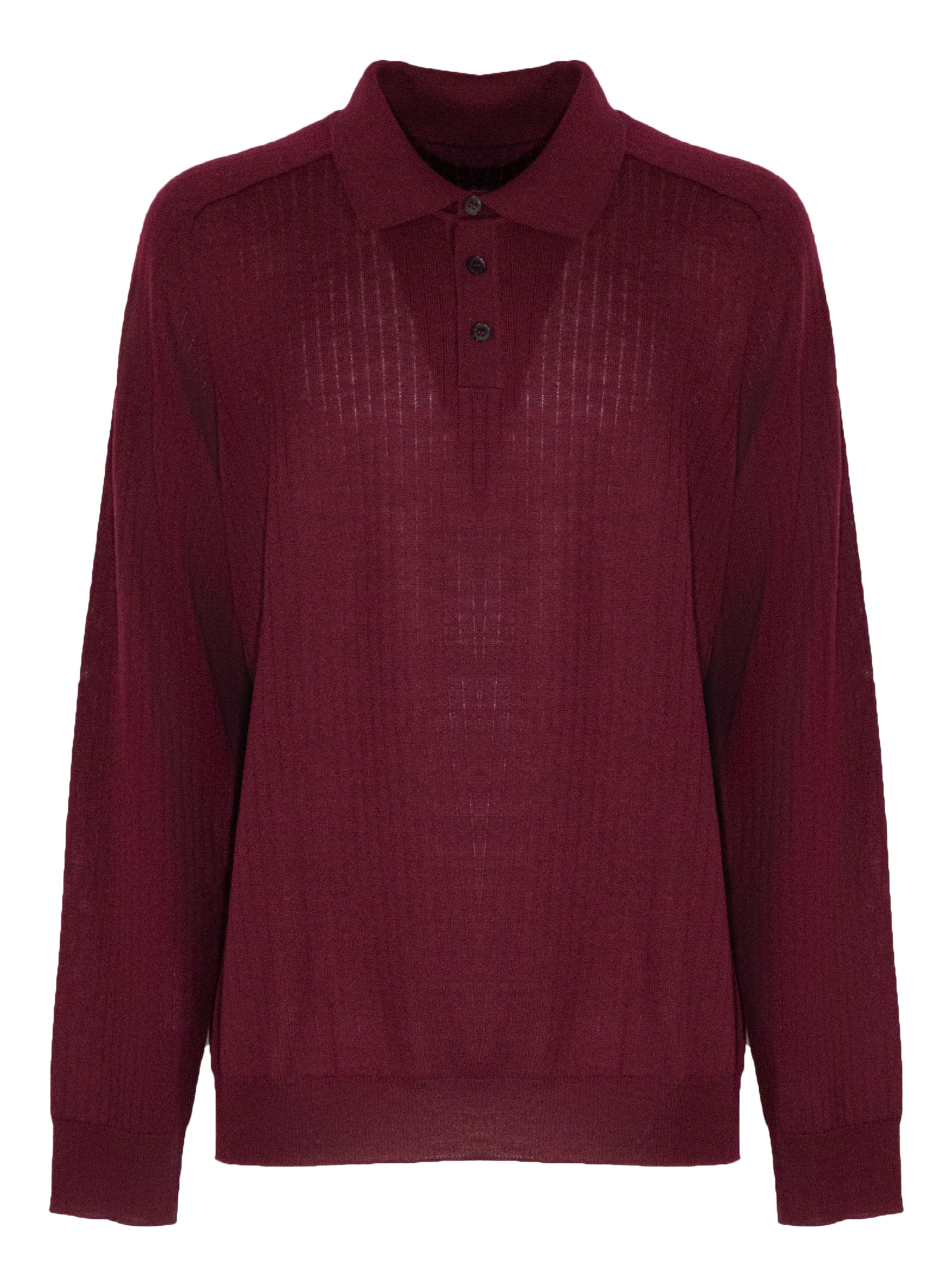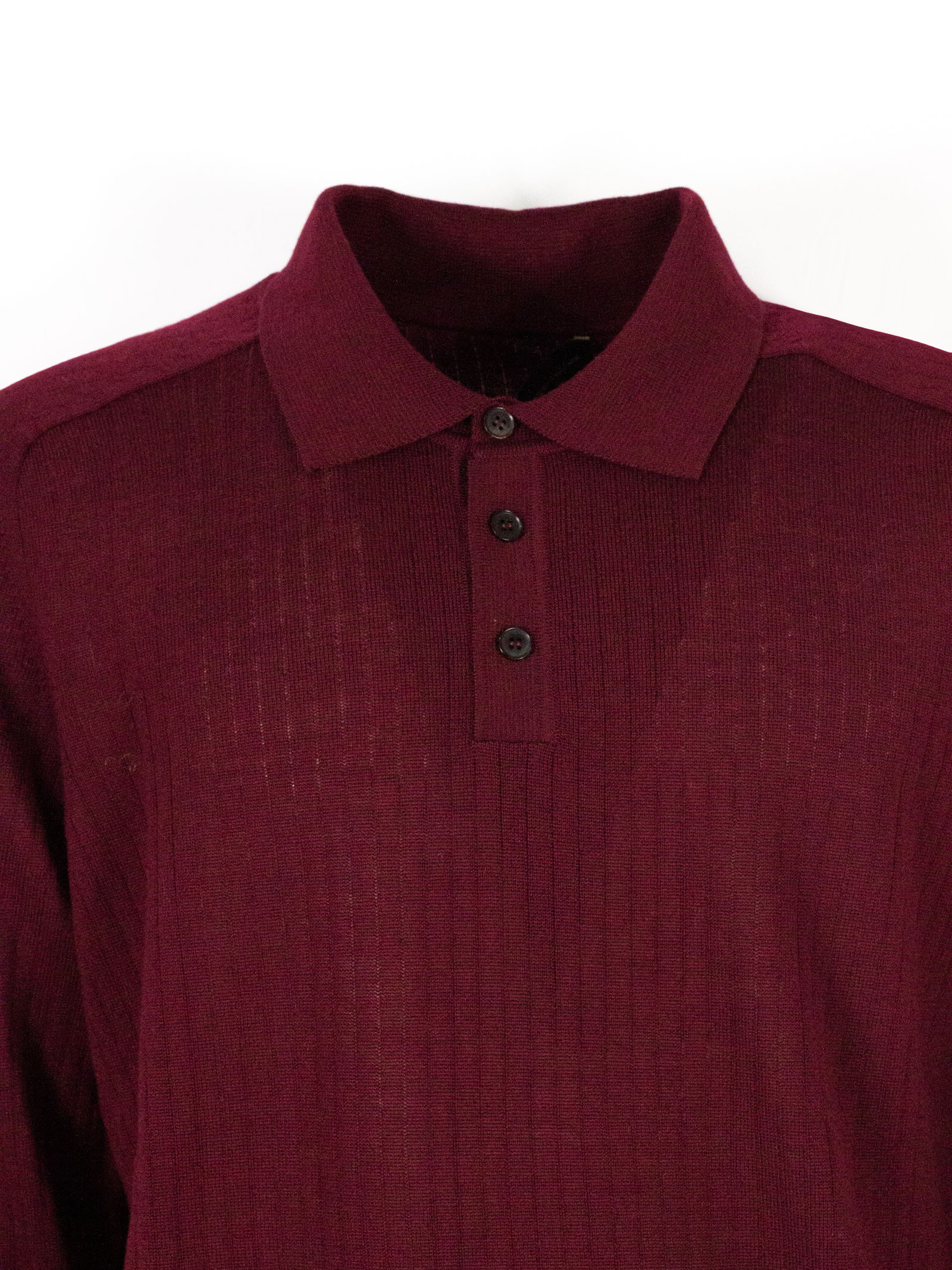 Polo in lana merino bordeaux con maniche lunghe, colletto classico con chiusura bottoni, design a coste, finiture a costine