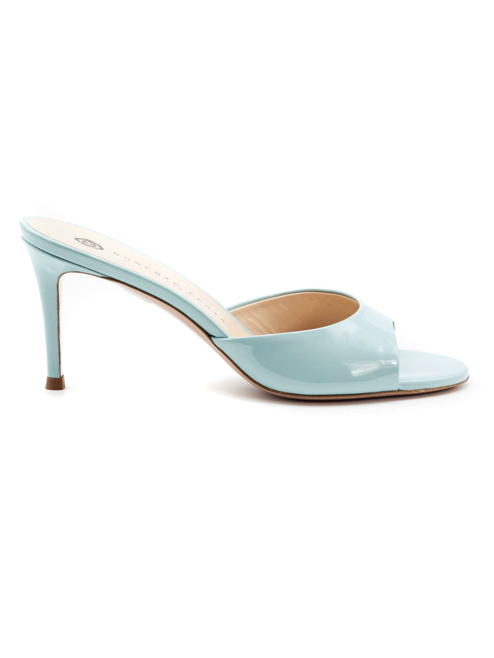 Sandalo Boa in pelle lucida azzurra con punta tonda, suola in cuoio con logo, altezza tacco 8 cm