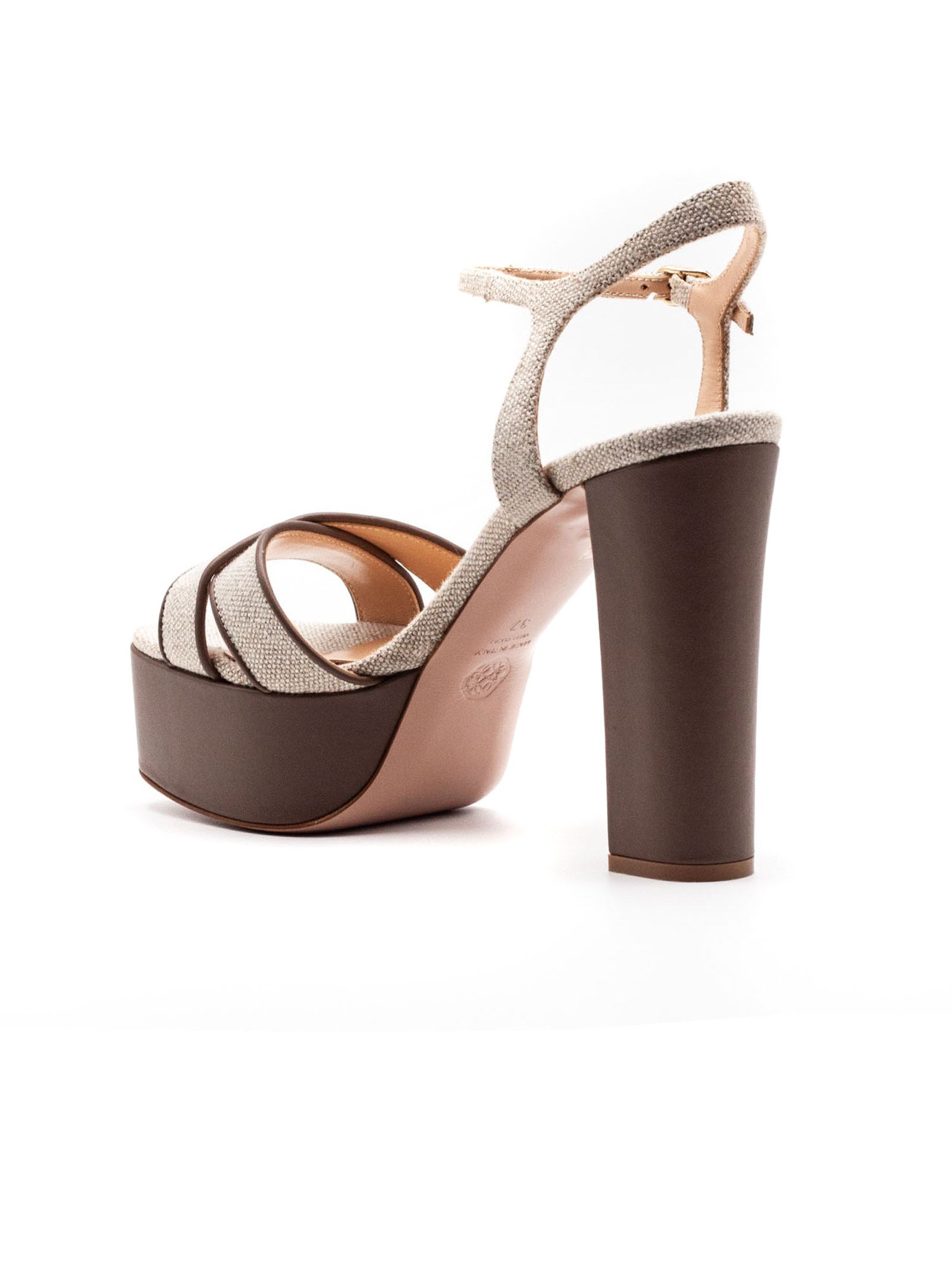 Sandalo Luanda in canvas effetto lino beige, profili in pelle marrone, cinturino regolabile alla caviglia, design intrecciato sulla punta, suola in cuoio con logo, tacco alto 12 cm, plateau circa 4 cm